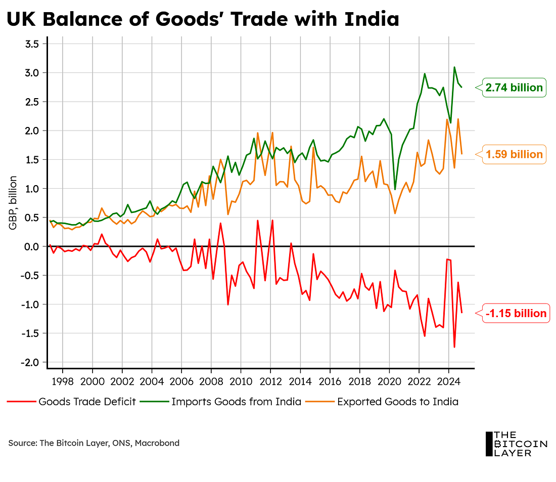 Dear Readers, It’s Thinking Time! Buckle up for a quick recap of global events. This week we cover India and its new trade agreement with the UK, its zero-for-zero tariffs deal with the US, and what looks like looming war with Pakistan. TBL Thinks is our way to summarize the most important paywalled, longer reads relevant to global macroeconomics, helping you cut through the noise. With that in mind, please enjoy. Looking for the perfect video to push the smartest person you know from zero to one on bitcoin? Bitcoin, Not Crypto is a three-part master class from Parker Lewis and Dhruv Bansal that cuts through the noise—covering why 21 million was the key technical simplification that made bitcoin possible, why blockchains don’t create decentralization, and why everything else will be built on bitcoin. The Financial Freedom Report is a weekly newsletter from the Human Rights Foundation (HRF) that tracks how authoritarian regimes weaponize money to control their populations and suppress dissent. It also spotlights how freedom technologies like Bitcoin are helping everyday people reclaim their financial independence and freedom. A one-of-a-kind newsletter connecting the dots between financial repression, geopolitics, and emerging tech. Smart macro analysts don’t just watch the Fed. They watch the world. UK & India Strike Deal - Tariff Reductions Across the BoardThe UK and India struck a deal in the new trade era that is being brought about by President Trump. The free trade pact between the two countries comes after three years of negotiations and aims to increase bilateral trade by approximately $34B by 2040. The trade deal, which the Indian PM Modi called “ambitious and mutually beneficial,” will allow British firms to compete for Indian contracts and Indian workers to work in Britain more easily. British PM Starmer said that the trade deal would reduce barriers in a “new era of trade.” The deal will also cut tariffs across the board, cutting Indian tariffs on 90% of product lines, with 85% of these becoming fully tariff-free within a decade. Whiskey and gin tariffs, currently at 150%, will be halved to 75% before going down to 40% after 10 years—there are unconfirmed reports that consumers of Johnny Walker cried happy tears in India upon hearing this news. India will also cut automotive tariffs from 100% to 10% on higher value cars, but will be subject to a quota, and will cut tariffs on British cosmetics, aerospace, medical devices, lamb, salmon, electrical machinery, soft drinks, chocolates, and biscuits. In turn, the UK will cut tariffs on footwear, clothes, some food products, cars, jewelry, and gems coming into the country from India. Here’s what to expect from these lowered trade barriers:... Subscribe to The Bitcoin Layer to unlock the rest.Become a paying subscriber of The Bitcoin Layer to get access to this post and other subscriber-only content. A subscription gets you: