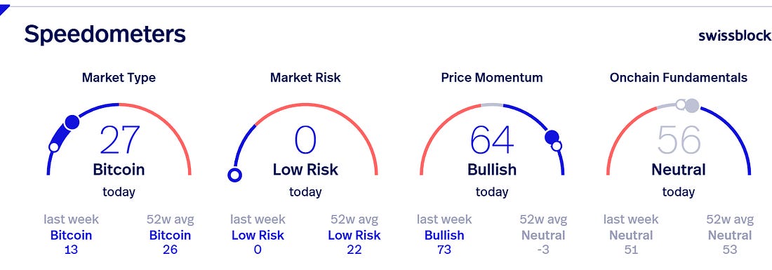 Speedometers indicating the current state of BTC. The full dot represents the current reading and the white dot represents one week ago.