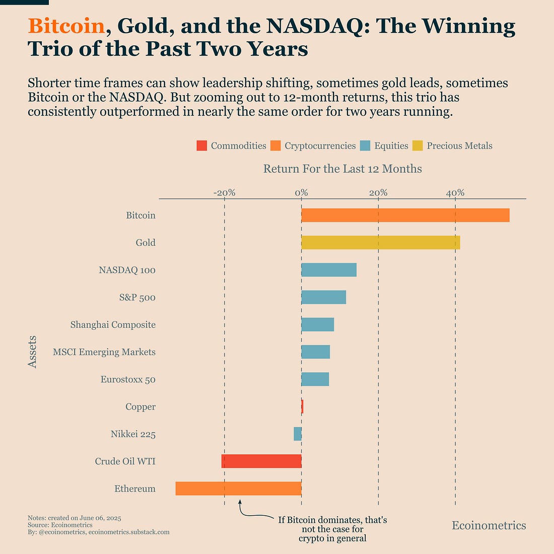 Together, these charts tell a clear story: Bitcoin continues to lead performance across major assets, but it’s doing so with unusually low volatility, a shift that changes how investors can think about risk. Meanwhile, macro conditions are evolving in a way that could support this trend, with labor market pressures easing and inflation risks becoming more balanced. It’s a moment that invites strategic positioning, not reactive trades. In case you missed it, here are the other topics we covered this week: Essential Decision-Making Tools Bitcoin Market Monitor - Key Drivers in Five Charts: Bitcoin Market Forecast - Probability Scenarios & Risk Metrics: Get these professional-grade insights delivered to your inbox: Bitcoin’s Two-Year Streak at the TopMonth-to-month, leadership among major assets can shift quickly. In April, Bitcoin lagged behind most other assets. In May, it climbed back toward the top, though Ethereum outpaced it over that single month. Short-term fluctuations matter if you’re making tactical calls. But when you zoom out to a 12-month view, the pattern looks very different and, frankly, more stable. What stands out is the consistency of the top three performers: Bitcoin, gold, and the NASDAQ 100. Over the past two years, this trio has appeared near the top of the leaderboard in most rolling 12-month periods. True, the order shifts depending on market conditions. Sometimes gold leads, sometimes it’s Bitcoin or tech stocks. But the trio itself rarely changes. That kind of consistency matters. In a world where macro narratives and political headlines constantly shift market sentiment, having a core allocation to assets that persistently deliver is a useful anchor. One interesting aspect here is that these three assets represent very different narratives: digital scarcity, hard money, and growth. That diversification of drivers may be part of why the trio has held up so well. If you’re trying to outperform by timing every rotation, it’s easy to get whipsawed. But sticking with high-conviction trends that endure through different cycles can deliver strong performance without having to predict each twist in the road. As the U.S. political environment becomes another source of volatility, it’s a good time to remember which assets have shown staying power. Bitcoin Enters a New, Low-Volatility RegimeLong-term returns matter most, but over shorter horizons, volatility still shapes how investors allocate capital. And right now, Bitcoin’s volatility is doing something unusual. The heat map below shows Bitcoin’s 30-day realized volatility, ranked by week across the past decade. A darker blue means lower volatility for that week relative to history. As of last week, Bitcoin’s volatility is near the 10th percentile, meaning it’s been less volatile than 90% of the time over the last 10 years. That’s remarkable given that Bitcoin just hit a new all-time high last month. Even with that strong price action, volatility has stayed low. But actually this isn’t a one-off. For most of the past two years, Bitcoin has rarely spiked into the high-volatility ranks, even as it delivered solid returns. That’s in sharp contrast with prior cycles, where big returns were almost always paired with violent swings. The last two years have shown that Bitcoin can trend upward without triggering whiplash. The implication is clear: Bitcoin may have entered a new phase in its evolution, one marked by more stable price action and fewer explosive moves. It’s still more volatile than gold, but it no longer stands out as a major outlier. With each passing low-volatility week, that perception shifts further. That opens the door for more professional allocators to revisit their assumptions. As volatility normalizes, Bitcoin becomes easier to fit into portfolios, without blowing up risk models or breaching volatility budgets. Cooling Job Openings Ease Pressure on InflationEarlier this week, we got the latest data on U.S. job openings and it’s not bad news for the Federal Reserve. Openings have now stabilized in the 7 to 8 million range, effectively returning to pre-COVID norms. That marks the end of a three-year stretch of labor market excess driven by: