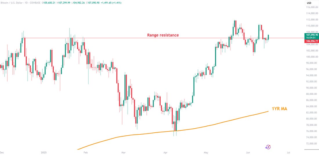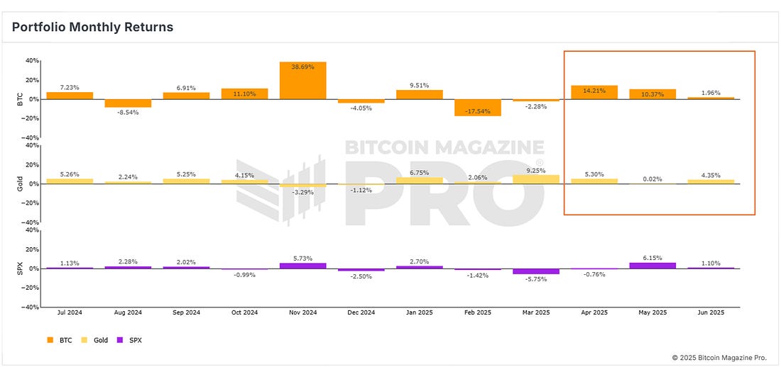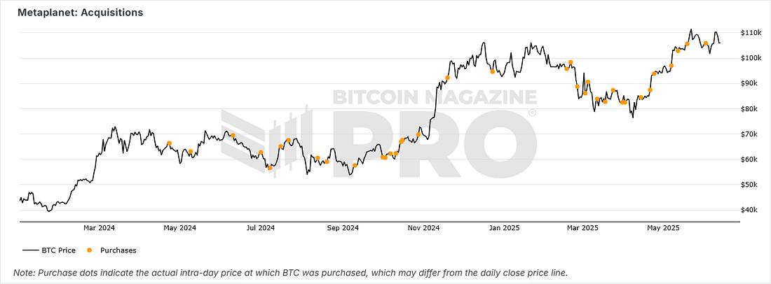 News HeadlinesPrice ActionBTC is once again attempting to break out above the range resistance line that has been acting like a magnet to price in recent weeks. As geo-political risks continue to rise, notably in the Middle East, perhaps after initial panic sell-offs investors will realise that Bitcoin can act as a safe-haven asset in such circumstances. Figure 1: BTC breaking back above range resistance. While much has been made of Gold’s performance in recent months against the geo-political backdrop, when we compare monthly gains, BTC has continued to outperform it. Figure 2: BTC Monthly Performance Versus Gold. If BTC can confidently start trending above $110,000 then it is likely that we will see another month of outperformance versus Gold for June 2025. The Big Story: Metaplanet Now Holds 10,000BTCJapanese Bitcoin Treasury firm Metaplanet has scooped up another 1,112 bitcoin for roughly ¥16.9 billion (about US$117 million), pushing its treasury to the symbolic 10,000-BTC mark. They have reached that number half a year ahead of the target they set for the end of 2025. Crossing that threshold propels the company past Coinbase Global’s 9,480 coin stack and makes it the eighth-largest public holder of bitcoin. Figure 3: Bitcoin Treasury rankings among publicly listed companies. The milestone lit a fire under Metaplanet’s shares, which spiked more than 20 percent on the day and are now up around 430% since January. Metaplanet financed the latest purchase with cash on hand, but it has even bigger funding in the pipeline. The board has green-lighted a US$210 million zero-coupon bond issue earmarked for further bitcoin buys, and earlier this month the firm unveiled a ¥770.9 billion (US$5.4 billion) equity-warrant deal devoted entirely to its accumulation strategy. Expect to see more orange dots on the chart as they continue to acquire more bitcoin over the coming months. Figure 4: Metaplanet acquisitions since April 2024. All told, the company has spent about US$947 million to assemble its 10,000-coin hoard, leaving it in the green with an average entry price near US$94,700 and a year-to-date bitcoin yield in the region of 266 percent. Executives insist Metaplanet is still aiming for 210,000 BTC, roughly one percent of eventual supply, by the end of 2027, underscoring a wider shift among corporates that are treating bitcoin as a strategic reserve necessity rather than a speculative side bet. Chart of the week - Puell MultipleFigure 5: Puell Multiple The Puell Multiple plots the U.S. dollar value of bitcoin newly issued each day (block reward × price) divided by its 365-day moving average, capturing how “rich” or “poor” miners’ revenue is relative to the past year. Readings above ~3.5 historically coincide with bull-market peaks, signalling miner windfalls and overheated conditions. That is shown on the chart above by the orange line (Puell Multiple) moving up into the red zone on the chart. Dips below 0.5 mark periods when miner income is severely compressed and bitcoin prices are near cycle lows. Shown by the orange line dipping down into the green band, highlighting that BTC is likely undervalued. Traders use these extremes as a contrarian timing gauge: high multiples warn of potential tops when the market is over-excited, and low multiples suggest accumulation zones. Currently, the Puell Multiple is trending upwards as we are in a bull market, but has a score of just 1.33, suggesting there may be significantly more upside still to come this cycle. Speak again soon, The Bitcoin Magazine Pro Team. Bitcoin Magazine ProFor more detailed Bitcoin analysis and to access advanced features like live charts, personalized indicator alerts, and in-depth industry reports, check out Bitcoin Magazine Pro. Make Smarter Decisions About Bitcoin. Join millions of investors who get clarity about Bitcoin using data analytics you can't get anywhere else. We don't just provide data for data's sake, we provide the metrics and tools that really matter. So you get to supercharge your insights, not your workload. Take the next step in your Bitcoin investing journey: