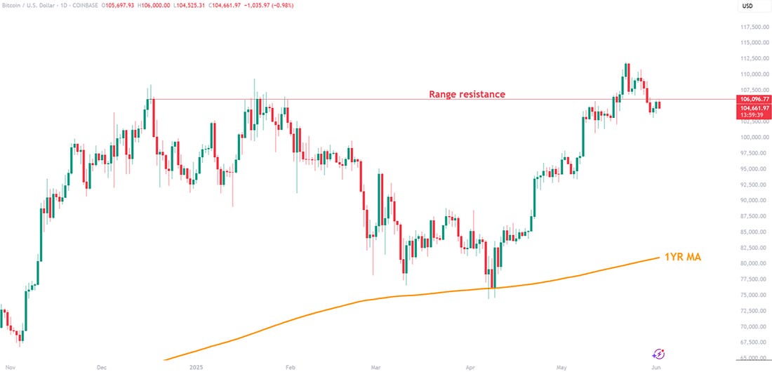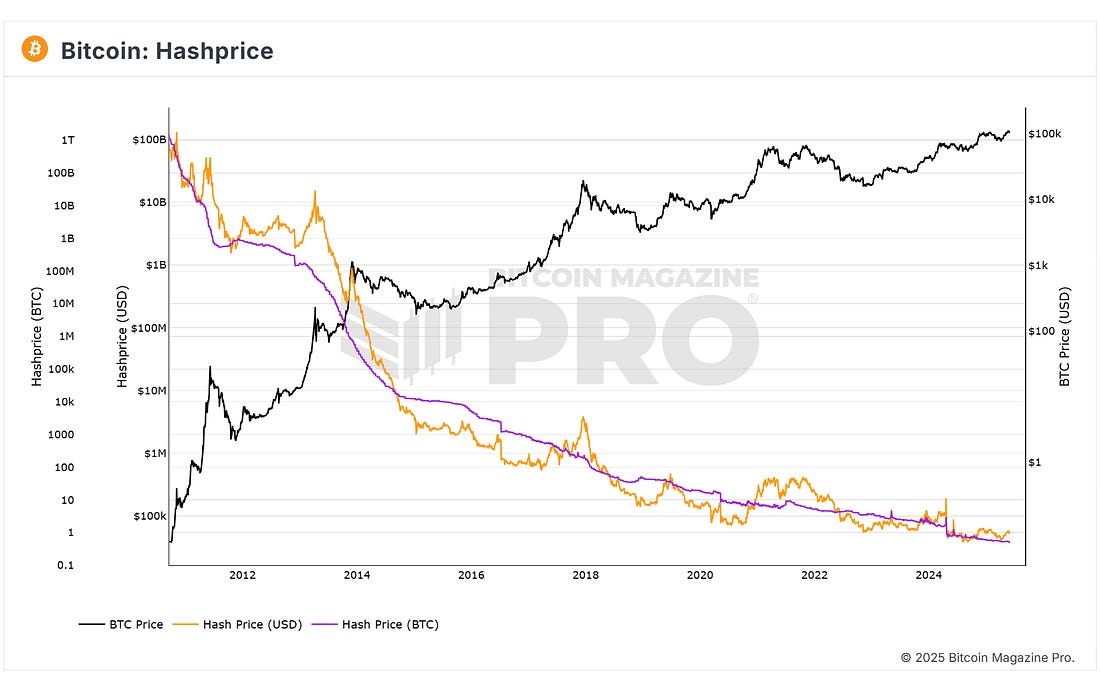 BTC Pullback but Bulls in ControlBitcoin dips to $104K after hitting all-time high, but bulls remain in control with strong 2025 gains.News HeadlinesPrice ActionThe past week has seen some tricky price action for BTC. After it briefly created a fresh all-time-high, it has continued to drop back to the low $100k’s. Currently the BTC price is at $104,661. Of particular note is that BTC is now currently back below the range resistance line. That line had acted as resistance for many months. Bulls will want to see BTC not spend too much time below that level before reclaiming it. Figure 1: BTC dropping back below range resistance. Despite this, BTC is still putting in a very strong performance over the past couple of months. May closed with a gain of +11.09% after April which was even stronger at +14.21%. Those figures are shown on the right hand side of the BTC monthly returns heatmap in the 2025 column. Figure 2: BTC monthly returns heatmap. Zooming out, BTC is up +13.05% so far in 2025, with the potential to go much higher in the second half of the year. The Big Story: Pakistan Joins Bitcoin Mining RacePakistan’s finance ministry has approved a plan to devote 2 gigawatts of surplus electricity to large-scale bitcoin mines and AI data centers, the first phase of a broader “Strategic Bitcoin Reserve.” Officials say the project, unveiled in late May, will be managed by the government-supported Pakistan Crypto Council and is meant to soak up idle generation capacity while luring foreign capital to the nation. Rising DifficultyThey will be entering an increasingly difficult game of mining for Bitcoin. Bitcoin’s network difficulty just reached fresh all-time highs above 123T (tera hash), a level that has climbed relentlessly since 2020 as industrial miners pour in new rigs. Higher difficulty means each block demands more hash power, squeezing margins even before electricity costs are considered. Figure 3: Miner Difficulty Hashprice Keeps SlippingWhile hashrate and difficulty surge, the USD hashprice - miners’ revenue per unit of compute - has fallen toward record lows. The drop reflects the sheer weight of new hashrate competing for the same 6.25 BTC block reward, leaving many operators close to break-even or at a loss. Figure 4: Hashprice IMF Pushback The International Monetary Fund has already flagged Pakistan’s plans, warning that diverting 2 GW of power to Bitcoin mining could complicate bailout negotiations amid chronic energy shortages. IMF officials have asked Islamabad for “urgent clarification” and hinted that concessionary loans could be at risk if the project proceeds. However, it appears many in the Pakistan government have been orange-pilled so we may see them continue with their plans regardless of the IMF concerns. Chart of the week - The Blockchain Group PerformanceFigure 5: The Blockchain Group Relative Performance. We have introduced another new Bitcoin Treasury company dashboard to the site. This time showing many great charts for The Blockchain Group, the first European Bitcoin Treasury Company. They have seen their stock soar since adopting bitcoin onto their balance sheet. Currently one of the top performers in all European stock markets! The chart above shows their stock performance since they adopted bitcoin onto their balance sheet, and compares it to other well known companies since that time. It includes companies such as Nividia (-3%), Tesla (+38%), and Google (+1%). The Blockchain Group is up a staggering +1,893% since it began accumulating bitcoin. You can view the full live dashboard for FREE here. We hope you enjoy this new free feature on the platform! Speak again soon, The Bitcoin Magazine Pro Team. Bitcoin Magazine ProFor more detailed Bitcoin analysis and to access advanced features like live charts, personalized indicator alerts, and in-depth industry reports, check out Bitcoin Magazine Pro. Make Smarter Decisions About Bitcoin. Join millions of investors who get clarity about Bitcoin using data analytics you can't get anywhere else. We don't just provide data for data's sake, we provide the metrics and tools that really matter. So you get to supercharge your insights, not your workload. Take the next step in your Bitcoin investing journey: