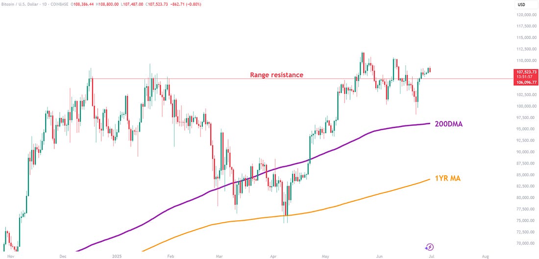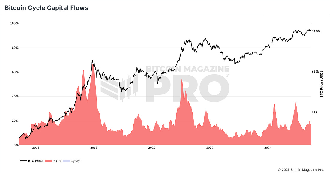 BTC ready to make a new high?BTC breaks range resistance again, eyeing $120K as S&P 500 hits new highs.News Headlines Price Action BTC has managed to regain its position above the range resistance line for a third time. Will this be the time it finally breaks out and trends to the upside to make a new all-time-high run towards $120,000? Figure 1: BTC breaks above range resistance for a third time. At a current price of $107,500, BTC is less than 4% off its all-time high. With concerns about geopolitical tensions fading and traditional markets, such as the S&P 500, also reaching new highs, optimism is returning to the markets, which will likely bring a boost to BTC. Figure 2: S&P500 making new highs…again. From its low three months ago, BTC is now up nearly 30%. Figure 3: BTC past three months' performance. This illustrates the extreme volatility of BTC, even in bull markets, and why it is crucial not to get shaken out at the lows when the broader market is panicking. The Big Story: Global Liquidity New Highs Aggregate M2 money supply (also known as Global Liquidity) has surged to fresh all-time highs once again, adding roughly $15 trillion since the 2022 trough. This is another factor that is boosting confidence in the Bitcoin market. Why does this matter for BTC? When central banks expand the monetary base, every existing unit of currency is implicitly debased. Therefore, scarce, hard-capped assets like Bitcoin (with a fixed supply of 21 million coins) stand out as a direct hedge against that dilution. Figure 4: Global M2. Each new high in global M2 has historically preceded major advances in BTC, and the broad upward slope of both sets of data on the chart underscores the asset’s reflexive relationship with liquidity. With Global Liquidity rising in this manner, Bitcoin is likely to follow suit and move aggressively upward. As it does, media coverage will intensify, which will likely bring in new participants to purchase BTC. At Bitcoin Magazine Pro, we can monitor new addresses buying bitcoin and track when the value in those addresses becomes overheated. That has historically coincided with major cycle highs for BTC. Figure 5: BTC Cycle Capital Flows. Over the last two cycles, when the addresses that have held bitcoin for less than 1 month (represented by the red section of the chart above) hold more than 40% of the value on the bitcoin network, it has been a warning that a BTC cycle high is near. The latest data is at just 17%, which suggests that the market is nowhere near overheating just yet. With Global Liquidity continuing to rise at a rapid rate, along with many other favorable tailwinds for Bitcoin, we do expect increased positive media coverage in the coming months. This will help bring new money into the ecosystem, which in turn will help push BTC price higher. This is, therefore, a crucial chart to track as we move further into the bull market to understand whether things are getting overheated. Bitcoin Magazine Pro platform subscribers can track the chart as it updates here. Watch out for moves above +30% as the market starts to heat up! Speak again soon, Bitcoin Magazine Pro Team. Bitcoin Magazine ProFor more detailed Bitcoin analysis and to access advanced features like live charts, personalized indicator alerts, and in-depth industry reports, check out Bitcoin Magazine Pro. Make Smarter Decisions About Bitcoin. Join millions of investors who get clarity about Bitcoin using data analytics you can't get anywhere else. We don't just provide data for data's sake, we provide the metrics and tools that really matter. So you get to supercharge your insights, not your workload. Take the next step in your Bitcoin investing journey: