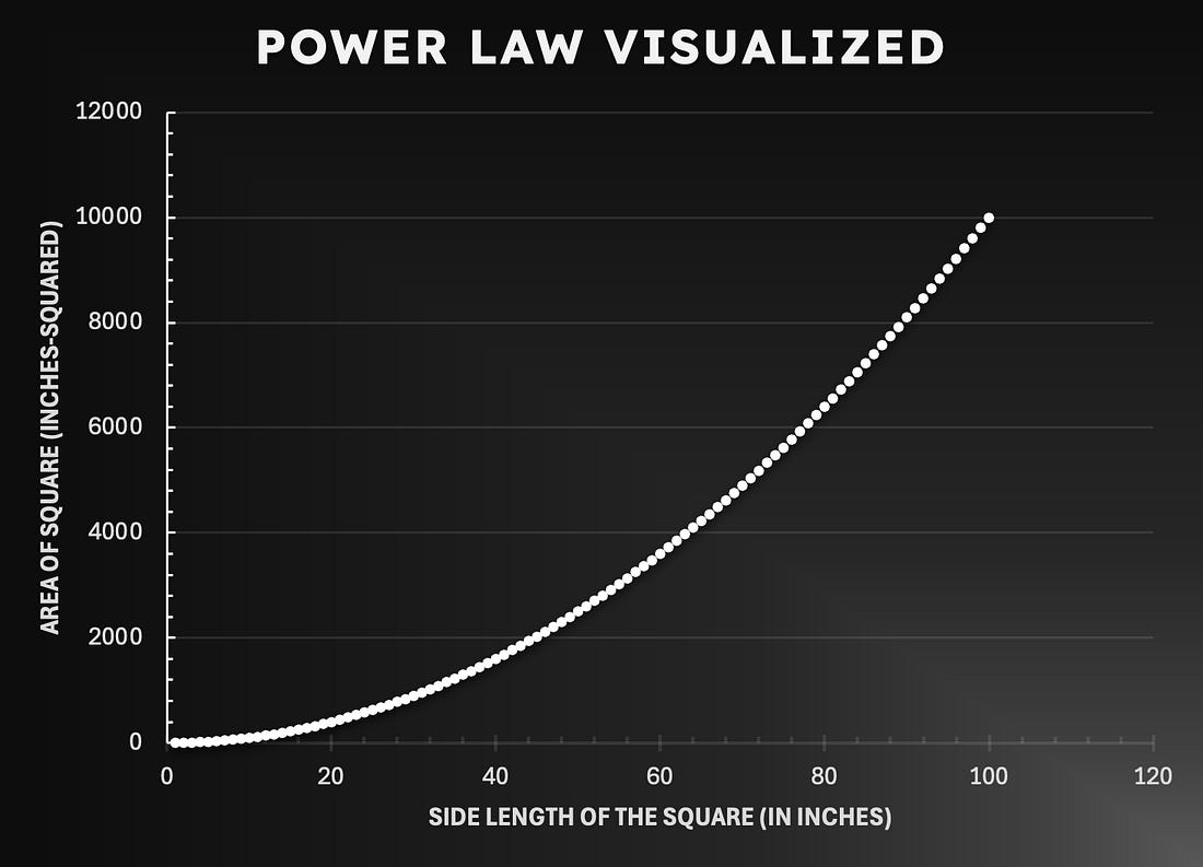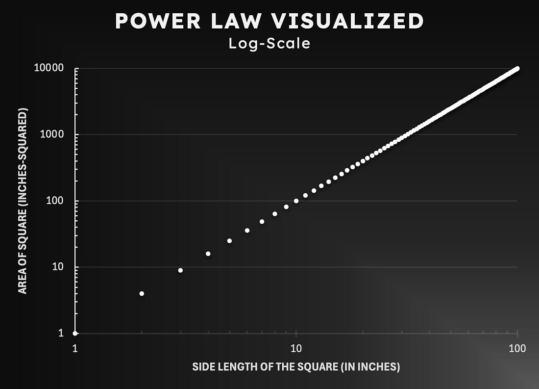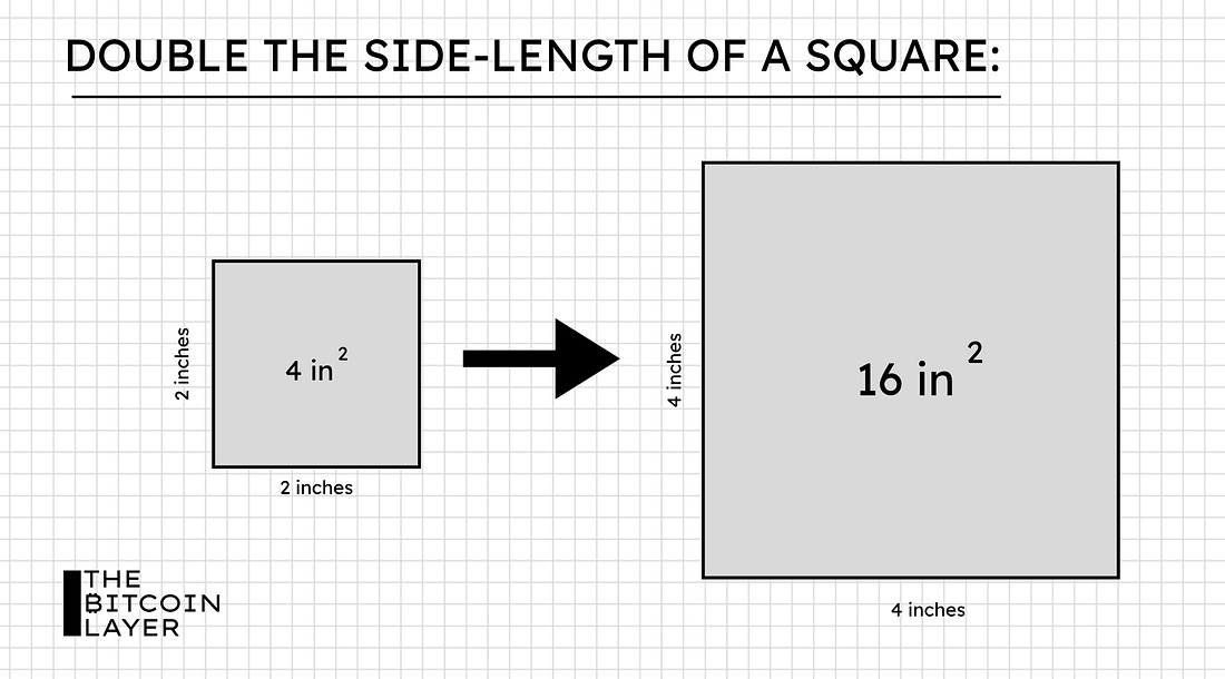 First 100 to request a bundle receive a physical copy of Foundations. Blockstream Jade Plus is the easiest, most secure way to protect your Bitcoin—perfect for beginners and pros alike. With a sleek design, simple setup, and step-by-step instructions, you'll be securing your Bitcoin in minutes. Seamlessly pair with the Blockstream app on mobile or desktop for smooth onboarding. As your stack grows, Jade Plus grows with you—unlock features like the air-gapped JadeLink Storage Device or QR Mode for cable-free transactions using the built-in camera. Want more security? Jade Plus supports multisig wallets with apps like Blockstream, Electrum, Sparrow, and Specter. Protect your Bitcoin, sleep better, stack harder. Use code: TBL for 10% off. Our videos are on major podcast platforms—take us with you on the go! Keep up with The Bitcoin Layer by following our social media! The area of a squareLet’s start out with a very simple, yet powerful example of the power law in action. Say you have a square with 2-inch sides. The area of this square is thus 4 square inches. If we doubled the length of the sides to 4 inches, the area would grow as follows: Thus, the area of a square is a function of its sides, and their relationship can be expressed as such: An easier way to see this relationship is through a chart, as it allows you to visually comprehend how the relationship plays out dynamically. When we plot the function above using linear axes, we get the following visualization: As the length of the sides of the square increases, the area of the square grows quadratically—that is, every time the sides double, the area quadruples. Let us now plot these same data points, but this time, using logarithmic scales on both axes: Now, all of a sudden, these two quantities have a linear relationship, which means that the area of a square and its sides have a power law relationship. Where else can we find the Power Law?The Power Law can be observed across various facets of life. The easiest one for me to grasp is income distribution, which is approximated as a power law distribution. Whether we like it or not, income inequality is nearly inevitable due to mathematical principles. Statistically speaking, only a small percentage of people earn the big bucks, while the rest of us lie near the norm. Let’s look at the following income distribution I made up: As you can see from the chart, most people lie at the low end of the income spectrum, while only a handful of individuals earn over $500,000 per year (at least in our fake sample data). Although the illustration uses made-up numbers, real-life income distributions look fairly similar. Just think about it intuitively: it makes sense for the distribution to look like this (at least on the right side of the income distribution), as there are simply more poor people than rich people in this world. Notice, however, that the curved pattern of the chart is similar to that of the square chart at the beginning of the article. That is, there seems to be a power law relationship. In order to verify this, let’s log-scale both axes: Voila! This exemplified income distribution follows a power law distribution closely, as seen by the resulting straight line from the transformation above—a few bumps here and there, but the line is darn near close to perfectly straight. One more real-life exampleGeoffrey West, a distinguished theoretical physicist and practically the face one thinks of when pondering Power Laws, likes to use the example of metabolic rates as a function of body mass. Put simply, his example explains how much food a living thing needs to eat to stay alive as a function of its size. Here’s his chart: What’s impressive about this chart, as West remarks, is that despite each of these animals growing in completely different physical environments, undergoing completely different evolutions, and having their own sets of natural complexities, they all perfectly fit into one straight line—fascinating, indeed. In fact, the linear relationship amidst this diverse set of species is such an extraordinary regularity that it almost seems impossible…like it’s not real. If you ever saw this chart without any knowledge of power laws, you’d think that someone messed with the data, or at the very least raise an eyebrow. Something else is going on. But the simple explanation is just that: power law! As Dr. Seuss once put it: