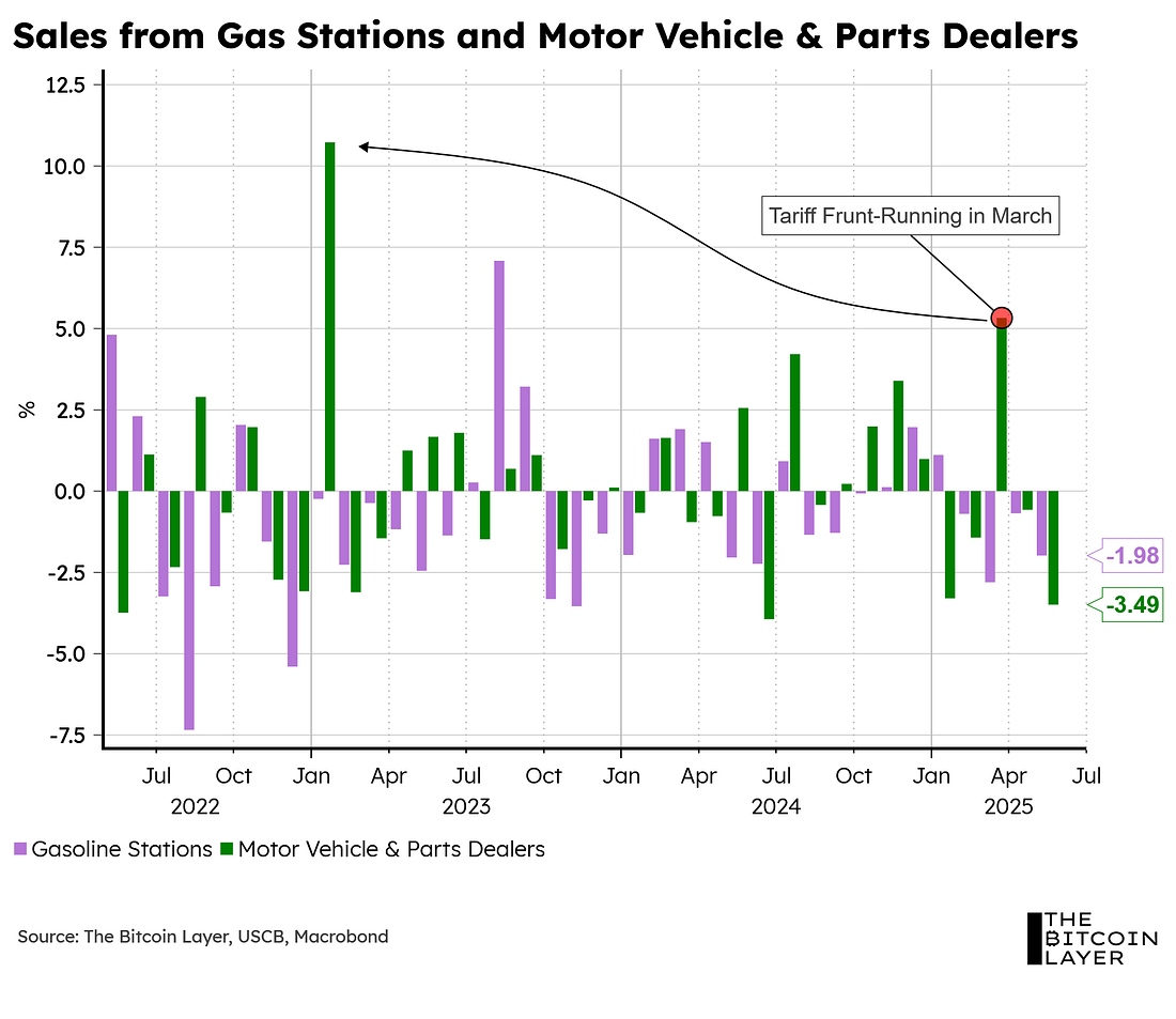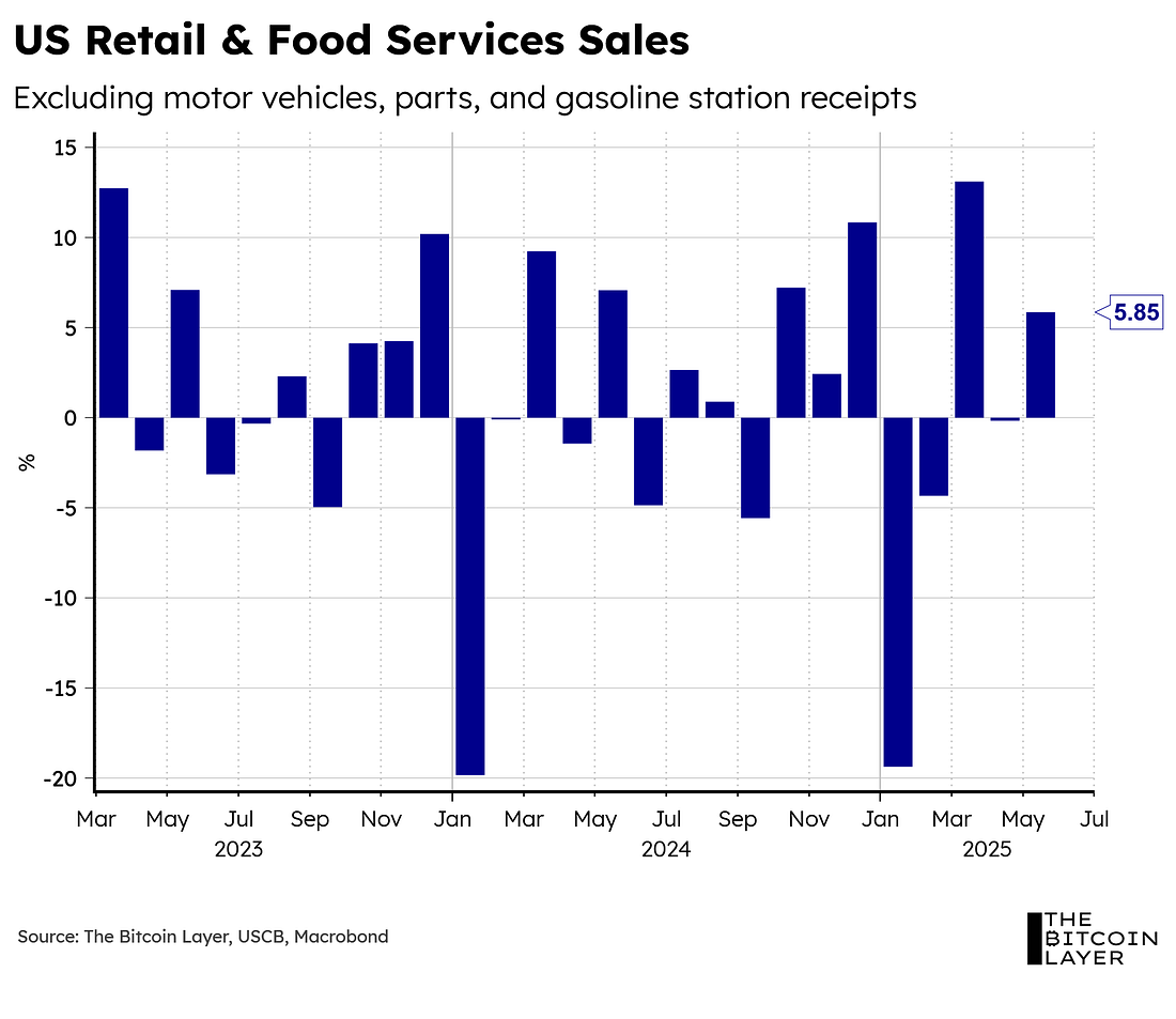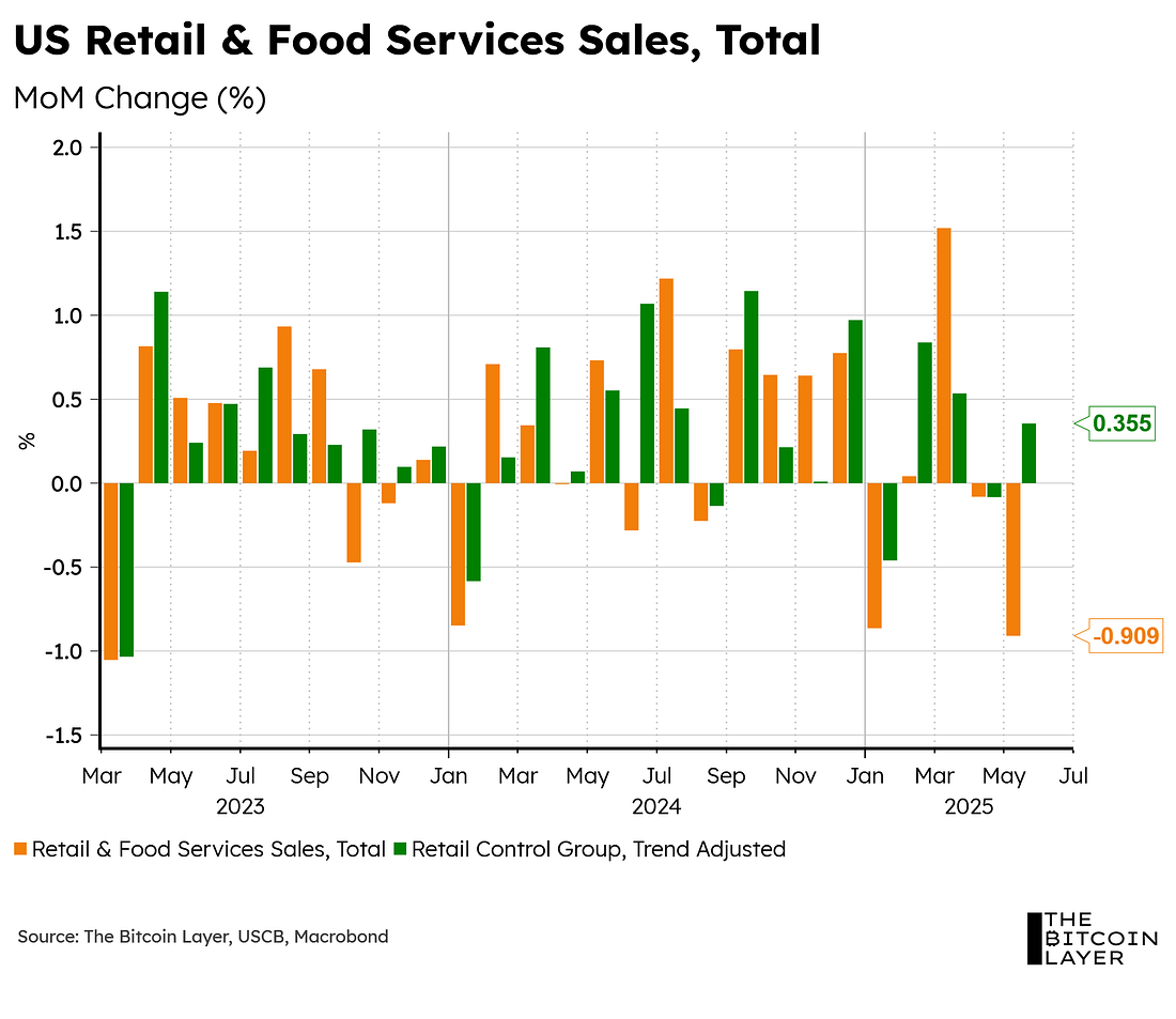 Dear readers, For quite some time now, we have been arguing that the US consumer is strong, but wary. This is because the labor market, in our view, shows continued signs of resilience with some notable slowdowns that typically happen during summer months (as explained in our most recent TBL Weekly). Today, we got some more information on where the US consumer stands, and the headline number wasn’t pretty: Analysts expected a -0.6% slowdown in the total print, but we instead got a -0.909% decrease (a pretty big miss). However, as you can also see from the chart, the control group (which is arguably more important than the headline number since it excludes receipts from auto dealers, building-materials retailers, gas stations, office supply stores, mobile homes, and tobacco stores) saw growth this past month. To gauge the US consumer better using today’s print, here are some charts showing some individual and important components of retail sales. Is bitcoin’s next parabolic move starting? Global liquidity and business cycle indicators suggest it may be. Read the latest report from Unchained and TechDev, analyzing how global M2 liquidity and the copper/gold ratio—two historically reliable macro indicators—are aligning once again to signal that a new bitcoin bull market may soon begin. The Financial Freedom Report is a weekly newsletter from the Human Rights Foundation (HRF) that tracks how authoritarian regimes weaponize money to control their populations and suppress dissent. It also spotlights how freedom technologies like Bitcoin are helping everyday people reclaim their financial independence and freedom. A one-of-a-kind newsletter connecting the dots between financial repression, geopolitics, and emerging tech. Smart macro analysts don’t just watch the Fed. They watch the world. Let’s first start by excluding auto, parts, and gasoline receipts from the total print: Much like with the control group, we see solid growth in retail sales when removing the auto industry. This tells us that the main drag in the headline report is autos, which makes sense given all the tariff front-running that took place at the start of the year, which increased sales to their highest levels since early 2023 (see chart below): The chart above also showcases repeated declines in gas station sales throughout 2025, which could partly explain the lower oil prices we’ve seen this year—that is, pre-Israel-Iran conflicts. Below, we overlay Brent crude oil over US gasoline store sales:... Subscribe to The Bitcoin Layer to unlock the rest.Become a paying subscriber of The Bitcoin Layer to get access to this post and other subscriber-only content. A subscription gets you:
