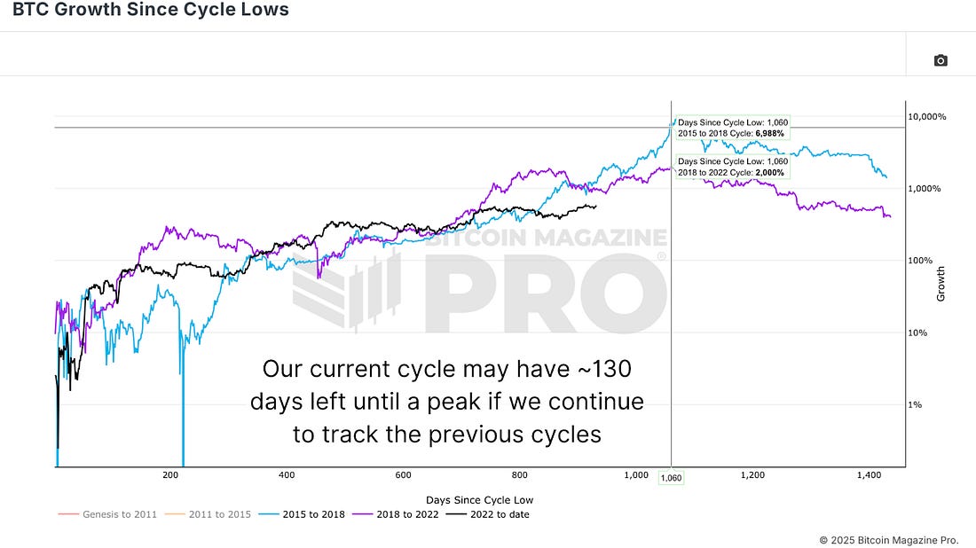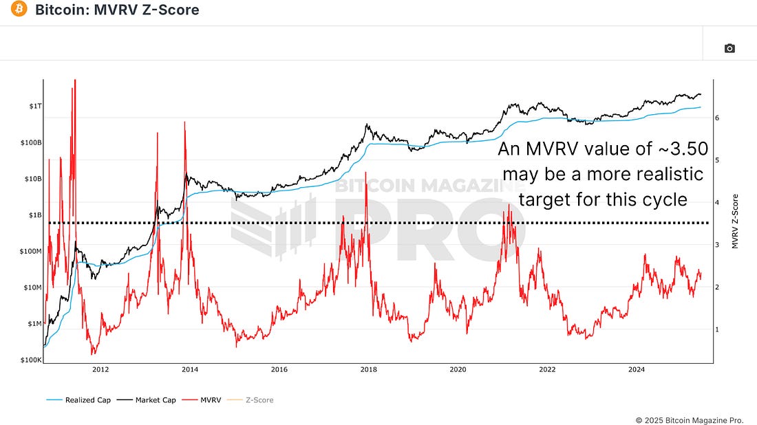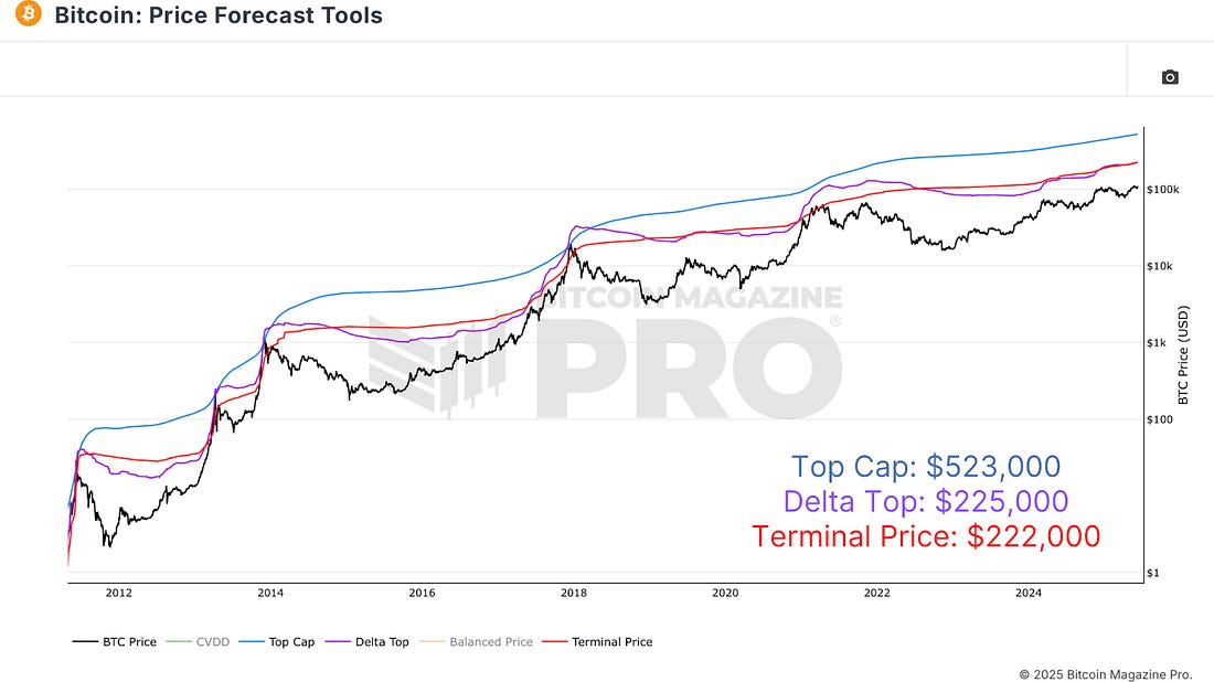 Where Could Bitcoin Peak This Cycle?Exploring Bitcoin’s Potential Peak: Valuation Models and Cycle TimingWith Bitcoin looking as bullish as ever, the inevitable question arises of how high could BTC realistically go in this market cycle? Here we’ll explore a wide range of on-chain valuation models and cycle timing tools to identify plausible price targets for a Bitcoin peak. Although prediction is never a substitute for disciplined data reaction, this analysis gives us frameworks to better understand where we are and where we might be heading. Price Forecast ToolsThe journey begins with Bitcoin Magazine Pro’s free Price Forecast Tools, which compile several historically accurate valuation models. While it’s always more effective to react to data rather than blindly predict prices, studying these metrics can still provide powerful context for market behavior. If macro, derivative, and on-chain data all start flashing warnings, it’s usually a solid time to take profit, regardless of whether a specific price target has been hit. Still, exploring these valuation tools is informative and can guide strategic decision-making when used alongside broader market analysis. Figure 1: Applying Price Forecast Tools to calculate potential cycle tops. Among the key models, the Top Cap multiplies the average cap over time by 35 to project peak valuations. It accurately forecasted 2017’s top, but missed the 2020–2021 cycle, estimating over $200k while Bitcoin peaked around $69k. It now targets over $500k, which feels increasingly unrealistic. A step further is the Delta Top, subtracting the average cap from the realized cap, based on the cost basis of all circulating BTC, to generate a more grounded projection. This model suggested an $80k–$100k top last cycle. The most consistently accurate, however, is the Terminal Price, based on Supply Adjusted Coin Days Destroyed, which has closely aligned with each prior peak, including the $64k top in 2021. Currently projecting around $221k, it could rise to $250k or more, and remains arguably the most credible model for forecasting macro Bitcoin tops. Of course, more information regarding all of these metrics and their calculation logic can be found beneath the charts on the site. Peak ForecastingAnother powerful metric is the MVRV ratio, which compares market cap to realized cap. It offers a psychological window into investor sentiment, typically peaking near a value of 4 in major cycles. The ratio currently sits at 2.34, suggesting there may still be room for significant upside. Historically, as MVRV nears 3.5 to 4, long-term holders begin to realize substantial gains, often signaling cycle maturity. However, with diminishing returns, we might not reach a full 4 this time around. Instead, using a more conservative estimate of 3.5, we can begin projecting more grounded peak values. Figure 2: A view of the MVRV ratio predicts further cycle growth to reach historical 4+ and even more conservative 3.5 target values. Calculating A TargetTiming is as important as valuation. Analysis of BTC Growth Since Cycle Lows illustrates that previous Bitcoin cycles peaked almost exactly 1,060 days from their respective lows. Currently, we are about 930 days into this cycle. If the pattern holds, we can estimate the peak may arrive in roughly 130 days. Historical FOMO-driven price increases often happen late in the cycle, causing Realized Price, a proxy for average investor cost basis, to rise rapidly. For instance, in the final 130 days of the 2017 cycle, realized price grew 260%. In 2021, it increased by 130%. If we assume a further halving of growth due to diminishing returns, a 65% rise from the current $47k realized price brings us to around $78k by October 18. Figure 3: Based on the peak rate of previous cycles, this cycle is far from over. With a projected $78k realized price and a conservative MVRV target of 3.5, we arrive at a potential Bitcoin price peak of $273,000. While that may feel ambitious, historical parabolic blowoff tops have shown that such moves can happen in weeks, not months. While it may seem more realistic to expect a peak closer to $150k to $200k, the math and on-chain evidence suggest that a higher valuation is at least within the realm of possibility. It's also worth noting that these models dynamically adjust, and if late-cycle euphoria kicks in, projections could quickly accelerate further. Figure 4: Combining projected realized price and a possible MVRV target to predict this cycle’s peak. ConclusionForecasting Bitcoin’s exact peak is inherently uncertain, with too many variables to account for. What we can do is position ourselves with probabilistic frameworks grounded in historical precedent and on-chain data. Tools like the MVRV ratio, Terminal Price, and Delta Top have repeatedly demonstrated their value in anticipating market exhaustion. While a $273,000 target might seem optimistic, it is rooted in past patterns, current network behavior, and cycle-timing logic. Ultimately, the best strategy is to react to data, not rigid price levels. Use these tools to inform your thesis, but stay nimble enough to take profits when the broader ecosystem starts signaling the top. For a more in-depth look into this topic, check out a recent YouTube video here: I Mathematically Predicted The Bitcoin Bull Cycle Peak Matt Crosby Lead Analyst - Bitcoin Magazine Pro Bitcoin Magazine ProFor more detailed Bitcoin analysis and to access advanced features like live charts, personalized indicator alerts, and in-depth industry reports, check out Bitcoin Magazine Pro. Make Smarter Decisions About Bitcoin. Join millions of investors who get clarity about Bitcoin using data analytics you can't get anywhere else. We don't just provide data for data's sake, we provide the metrics and tools that really matter. So you get to supercharge your insights, not your workload. Take the next step in your Bitcoin investing journey:
