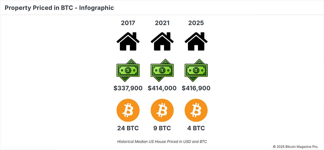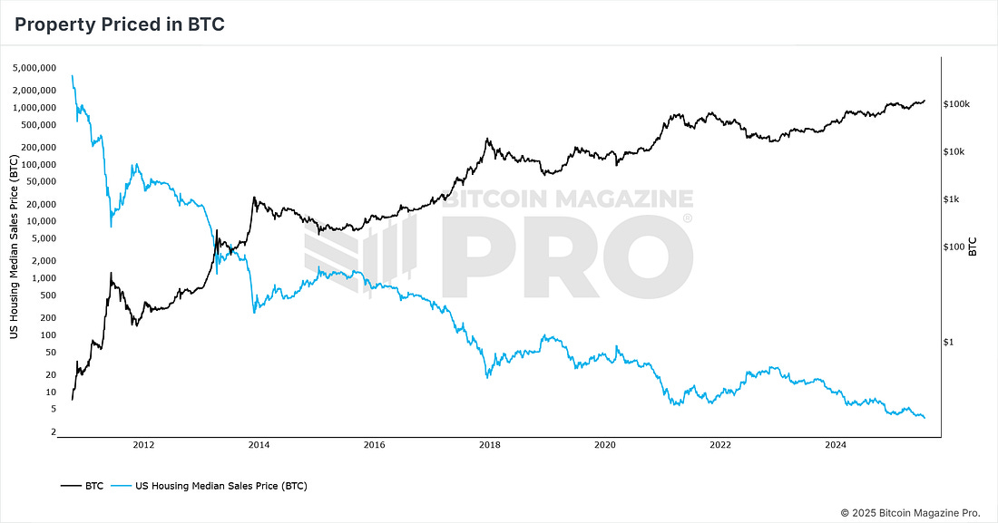 The Big Story: Bitcoin Draining The Value Out Of Real Estate The latest Bitcoin Magazine article by Martin Matejka lays out a radical thesis on why Bitcoin could eat into real estate as the world’s favourite store-of-value. Give the full article a read here. Below, we provide our take on the article and showcase, through data, how Bitcoin is already starting to overtake real estate as a better store of value for millions of people. Real estate’s status‑quo store‑of‑value is fraying. The impact of that over time can be seen on the chart below, which shows US Median House prices steadily increasing (blue line). They are shown alongside BTC (black line). Figure 4: US Median House Prices. However, as an investor, you want to be holding onto hard assets that can outperform. When we look at US Median House priced in BTC terms rather than in USD, we see a very different picture. US Median House prices have significantly LOST value over time relative to BTC. Figure 5: US Median House Prices in BTC terms. A demographic hand‑off is accelerating the shift. Young investors already hold more cryptocurrency than stocks, bonds, or property, and surveys show that two-thirds of millennials eyed crypto ETFs last year, versus a small fraction of boomers. It’s a generation that values portability and internet‑native wealth over the traditional “forever home.” The impact of this and BTC’s relentless growth over time as it becomes adopted can be seen in this infographic. A median-priced house in the US would have cost 24 BTC back in 2017. Today it costs just 4 BTC! Figure 6: US Median House Prices in BTC terms infographic. If Bitcoin captures even a slice of real estate’s monetary premium, tens of trillions of dollars could rotate rapidly into digital custody. Is this a global repricing event most investors are still underestimating? Speak again soon. Bitcoin Magazine Pro Team. ⏳ Limited Time OfferIf you would like to access Bitcoin charts and chart alerts to understand where we are in the bull market cycle, use this code at checkout to get 30% off: NOW30 The code will expire in 48 hours, so get your 30% off while you can. We hope you enjoy becoming a platform member, so that you can get an edge in the market. Bitcoin Magazine ProFor more detailed Bitcoin analysis and to access advanced features like live charts, personalized indicator alerts, and in-depth industry reports, check out Bitcoin Magazine Pro. Make Smarter Decisions About Bitcoin. Join millions of investors who get clarity about Bitcoin using data analytics you can't get anywhere else. We don't just provide data for data's sake, we provide the metrics and tools that really matter. So you get to supercharge your insights, not your workload. Take the next step in your Bitcoin investing journey:
