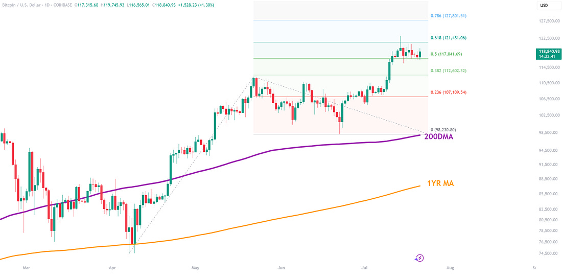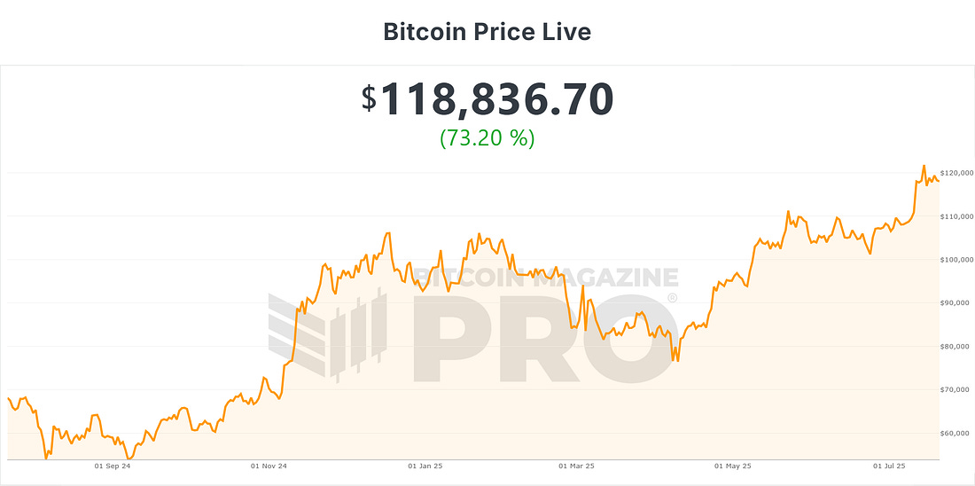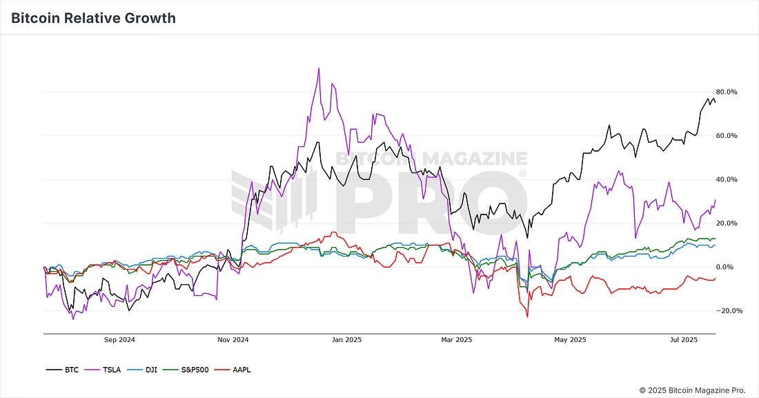 BTC ranging...but what's next?BTC ranges between 0.5 & 0.618 fib at $117K, healthy consolidation after run-up. Patience key for investors.News Headlines Price Action Since reaching our recent target of the 0.618 fib extension that we discussed in last week’s newsletter, BTC has retraced slightly to the 0.5 fib extension at $117,000. It is currently ranging between those two levels. In our view at Bitcoin Magazine Pro, this is a perfectly healthy consolidation following the strong run-up that occurred two weeks ago. Times like this simply require some patience for the strategic investor. Figure 1: BTC ranging between the 0.5 and 0.618 fib extensions. Zooming out and looking at BTC performance over the past year, it is now up +73.2%. An impressive performance. Figure 2: Past 12 months performance. Comparing that performance versus other major assets shows how impressive it has been, as other leading global assets have significantly lagged behind Bitcoin. Figure 3: BTC relative growth vs other assets. Past 12 months' performance of BTC versus other leading global assets: