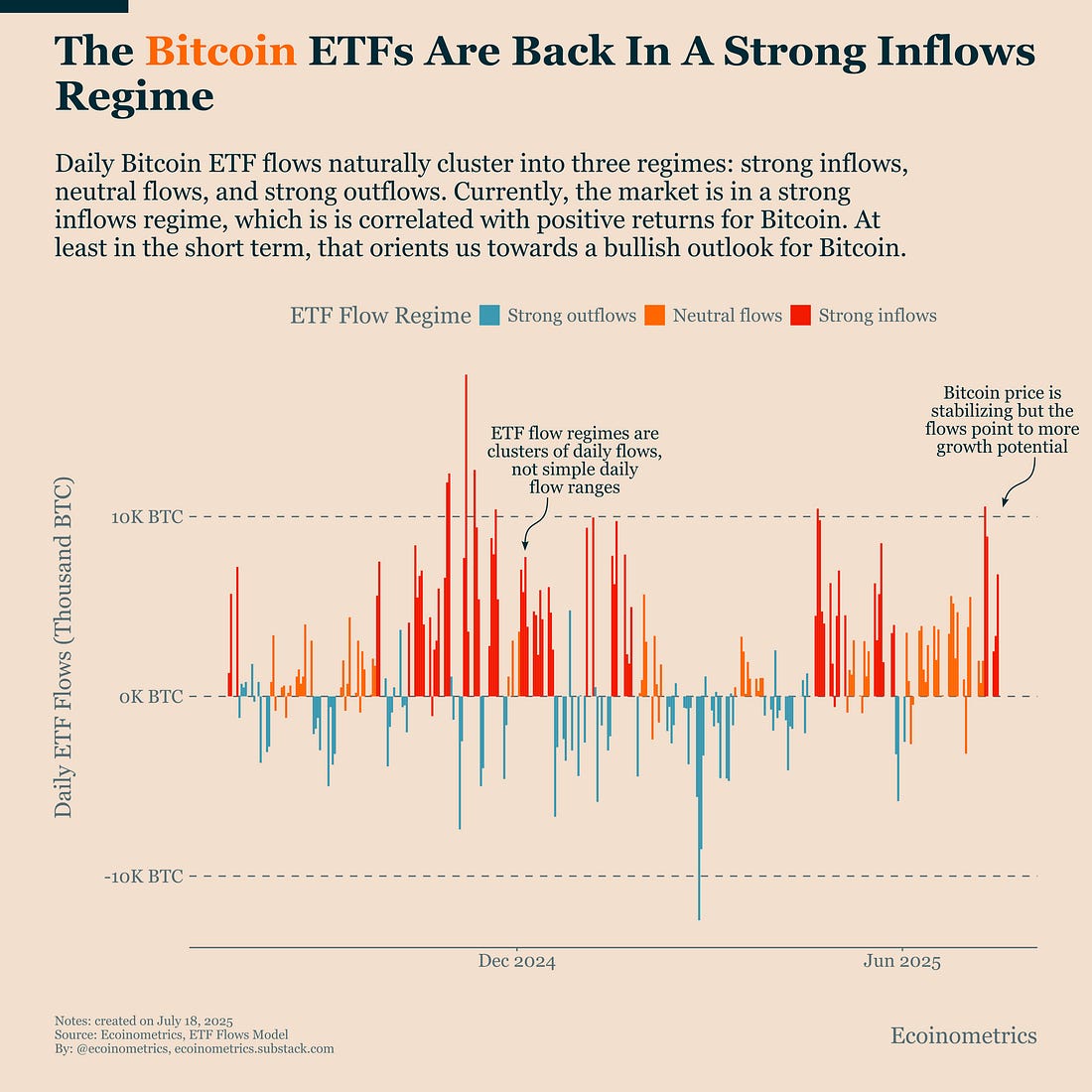 We’re looking at a market where demand for Bitcoin is strong and increasingly institutional, yet the macro environment still has unresolved pressures. Flows suggest Bitcoin is undervalued. Ownership trends point to a structural shift. But sticky inflation means the Fed is unlikely to pick up the pace. In fact, it’s not so different from the setup we’ve seen for most of the year. In case you missed it, here are the other topics we covered this week: Essential Decision-Making Tools Bitcoin Market Monitor - Key Drivers in Five Charts: Bitcoin Market Forecast - Probability Scenarios & Risk Metrics: Get these professional-grade insights delivered to your inbox: Flows Point to $128K Fair Value for BitcoinIt’s Friday, and Bitcoin has managed to stay near its all-time high for the entire week. At $119K, taking a breather is normal. Price action got hot last week, with a string of strong daily inflows into the ETFs. Momentum built up fast. A pause lets things cool off a bit and resets the short-term indicators without changing the broader picture. And that broader picture looks good. Under the surface, demand from the ETFs hasn’t slowed. Quite the opposite, flows have remained firmly in what we classify as a strong inflows regime. That’s based on our ETF flows model, which sorts daily activity into three buckets: