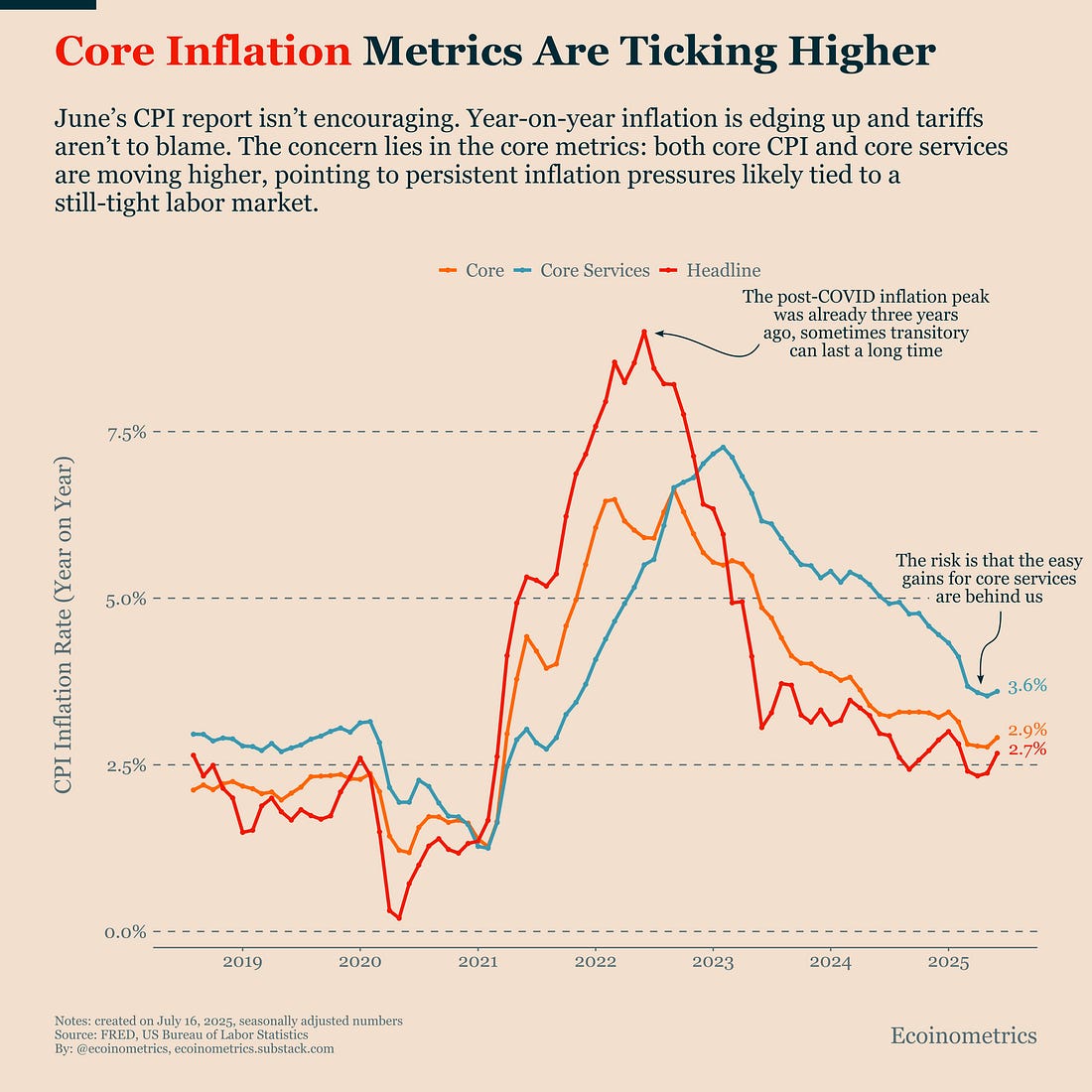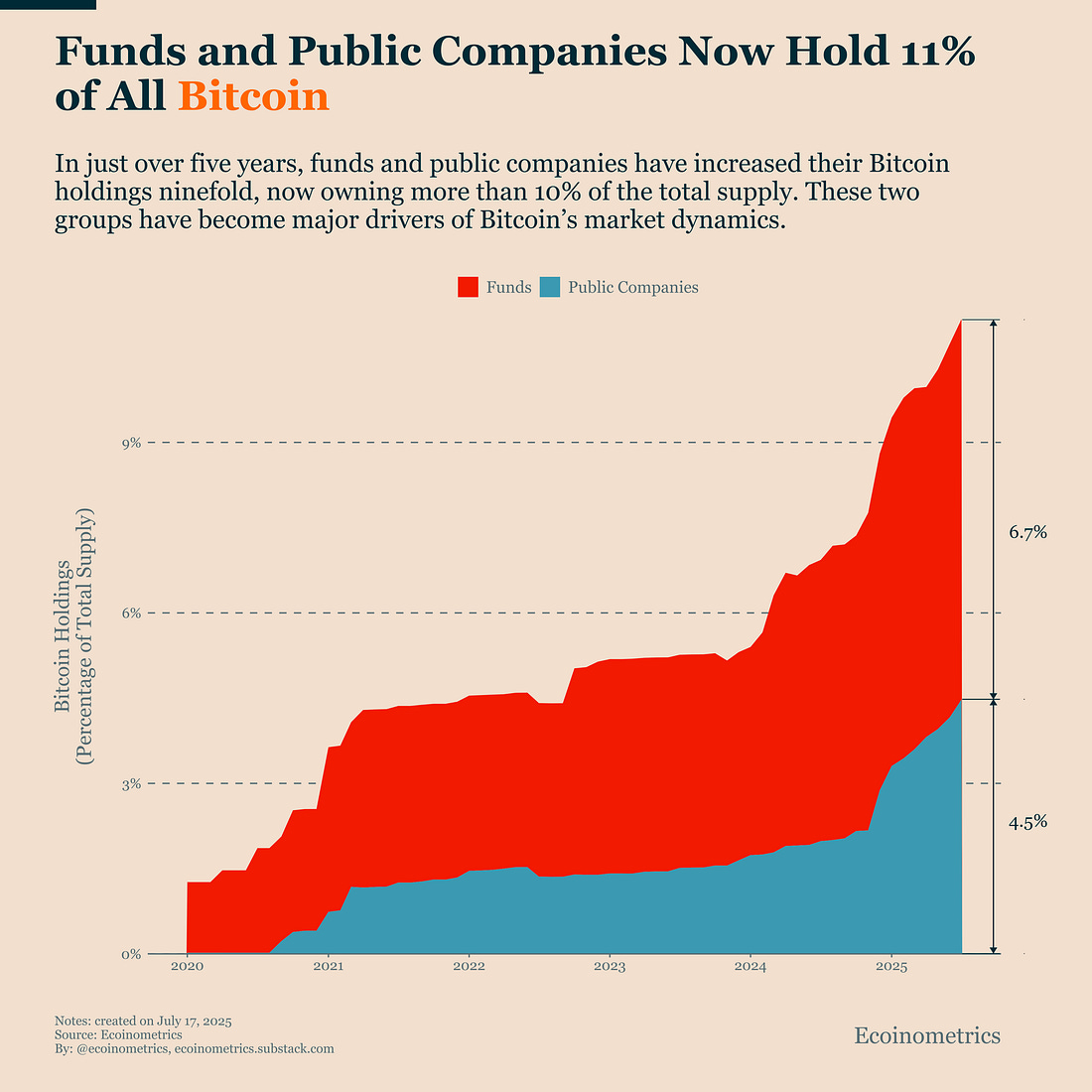 Since the breakout last week, we’ve been in strong inflows. And at this level of demand, our ETF flows-to-price model implies Bitcoin's fair value is already around $128K (see the daily update here), slightly above the new all-time high. That means even with price stalling, we’re not at equilibrium yet. The flows say there’s still more upside to price in. So yes, Bitcoin is catching its breath. But demand is still strong and the flows point up. Institutions Now Own 11% of Bitcoin Supply, That’s a Structural ShiftHere’s a stat that says a lot about how far Bitcoin has come. Back in 2020, funds and public companies held barely 1% of the total supply. Fast forward to July 2025, and that number has jumped to over 11%. That’s a ninefold increase in just over five years. In other words, Bitcoin has gone from being mostly held by retail investors and whales to being partially absorbed into institutional balance sheets. That shift matters because these new holders behave differently. Their capital moves through structured vehicles. Their decisions are influenced by models, mandates, and fiduciary responsibilities. And as a result, their flows create different kinds of market pressures than what we saw in earlier cycles. What’s even more striking is the trend is accelerating. Take a look at the chart below. The steepest slope in holdings happened over the last 12 months. And while most of that growth came from ETFs, public companies have also picked up the pace in the last two quarters. That’s why we believe that tracking institutional flows (through ETF inflows and public company treasuries) is no longer optional. It’s the single most important input for making tactical calls on Bitcoin. Core Services Inflation Is the Real ProblemThe CPI numbers for June are out, and a few things stand out. Headline inflation ticked higher (year-on-year at 2.7%). Core inflation also moved up (year-on-year at 2.9%), not great. But what really jumps out is core services inflation: it climbed again (year-on-year at 3.6%). That’s the part that matters most, and it’s going the wrong way. And what didn’t move? Durable goods. Which is interesting, considering all the recent headlines about tariffs. If anything were going to react first, it would be durable goods. But those prices have stayed basically flat since March. It’s possible that the tariffs won't have a meaningful impact, at least not right away. Remember that during the first round of tariffs (roughly 2018-2020) under Trump’s first mandate, durable goods prices also stayed pretty stable. So if you're trying to read the inflation tea leaves, the tariff story isn’t the big concern in this data right now. The real problem is the stickiness in core services. Core services inflation is mostly a labor market issue. Wages are the largest input cost, and right now, the labor market still looks too tight to bring inflation all the way down to 2%. That’s the bottleneck. And it’s likely the way the Fed sees it too. With data like this, there’s no reason for them to bring forward rate cuts. But for Bitcoin, none of this matters unless it pushes the Fed into a meaningfully more hawkish stance. So far, that’s not happening and investors are still positioned for risk-on. That's it for today. Thanks for reading. Cheers, Nick P.S. Every week, our team conducts extensive research analyzing market data, tracking emerging trends, and creating professional-grade charts and analysis. Our mission: Deliver actionable macro and Bitcoin insights that help institutional investors and financial advisors make better-informed decisions. Ready for institutional-grade research that puts you ahead of the market? Click below to access our premium insights. You're currently a free subscriber to Ecoinometrics. For the full experience, upgrade your subscription. |