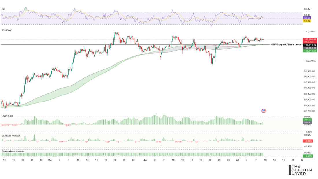 On the low time frame, there isn’t much to report. We’ve been trading in a tight range since May 20th. This marks the third time in the last four risk reports (spanning eight weeks) that we’ve noted the price hovering around ~$109,000.