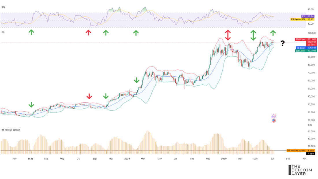 Bollinger Bands themselves don’t predict direction. However, when comparing previous periods of band compression with the Relative Strength Index (RSI), we’ve observed a consistent pattern over the last six instances: when the RSI was above its RSI-based moving average (MA), the breakout tended to be to the upside and vice versa.