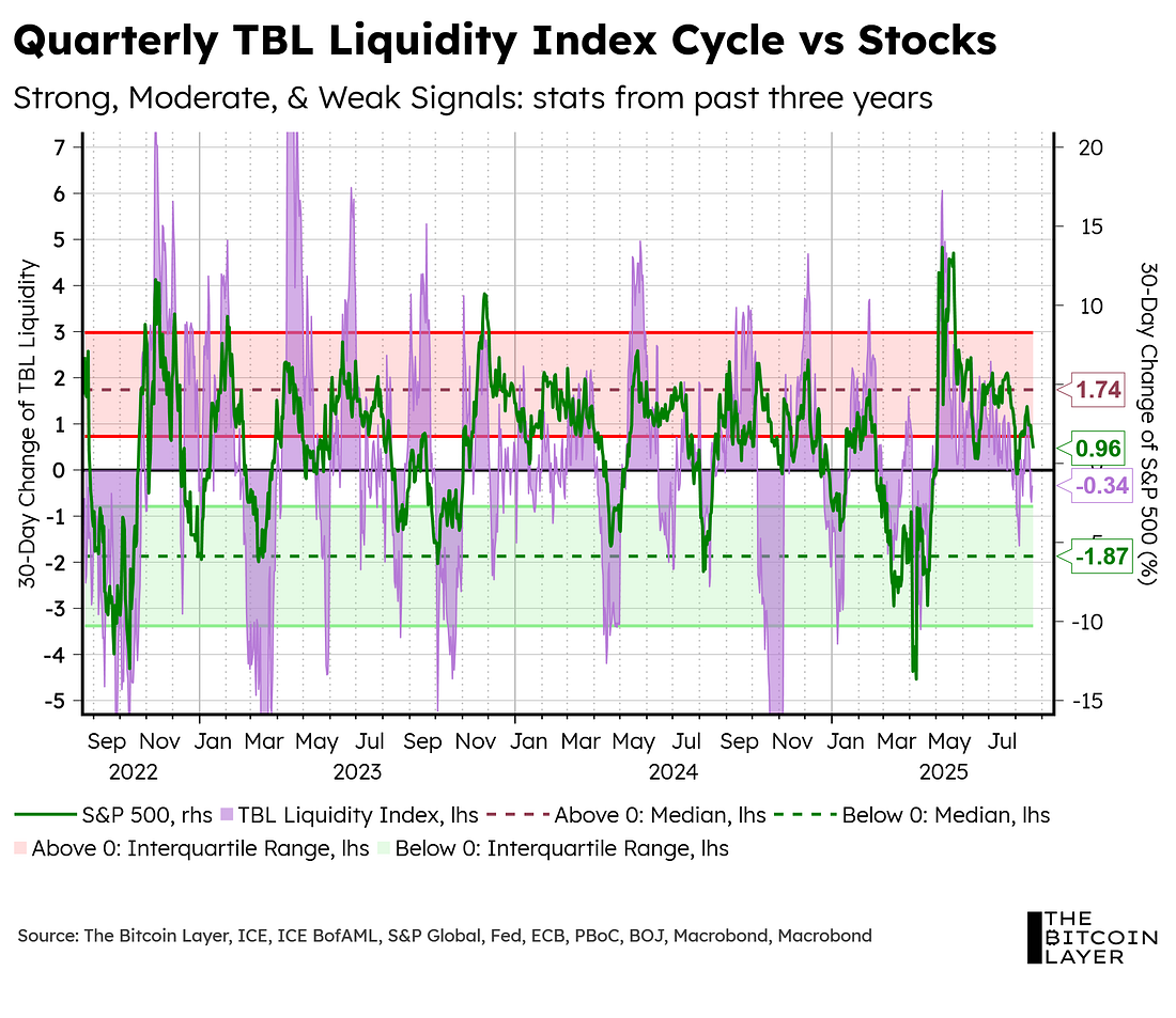 Dear Readers, This week was a groundbreaking week for the TBL team. For the first time ever, we put together an event that brought in over 100 people, and we could not have done it without Michael Howell and the team over at CrossBorder Capital, James and the team at Checkonchain, our excellent team here at TBL, and most importantly, you guys - our loyal Readers. Given the sheer volume of questions that we got, we simply did not have time to address all of them, but we will try our best to answer some of the questions in today’s article (at least from a TBL perspective) and in the weeks to come. Go to the Q&A Hub for the recording of yesterday’s event with Michael Howell: Before that, however, a quick TBL Liquidity update. Over 10,000 investors downloaded the original report calling for $120k when bitcoin was just $27k. With that price level now achieved, Tuur is back with the 2025 edition refreshed for the bull run with new data and insights—including Adamant Research’s latest price outlook. The bull run is heating up—now is the time to take it seriously. You’ll also get exclusive access to an HD recording of Tuur Demeester’s new 30-minute video presentation, Charting Our Way Through Chaos, breaking down why this boom might be only just beginning—and what forces could push it to the next level. Read the first-ever mid-cycle report from Adamant Research: Our videos are on major podcast platforms—take us with you on the go! Keep up with The Bitcoin Layer by following our social media! TBL Liquidity Cycle updateSee, the thing about TBL Liquidity Cycle troughs is that they force you to be a contrarian. They force you to be bullish when the overall momentum is bearish (and vice versa). When plotting our TBL Liquidity Cycle next to a trailing 30-day percentage change in stocks, you see exactly what we mean: Subscribe to The Bitcoin Layer to unlock the rest.Become a paying subscriber of The Bitcoin Layer to get access to this post and other subscriber-only content. A subscription gets you: