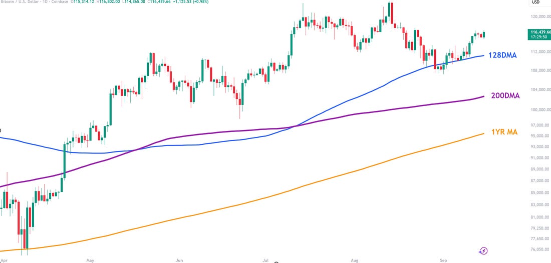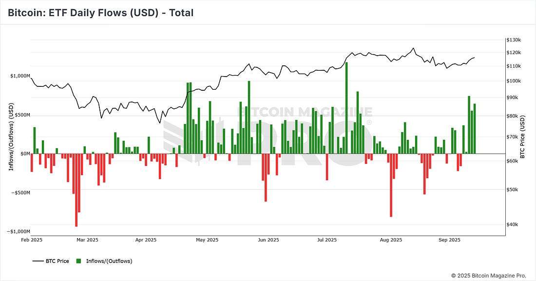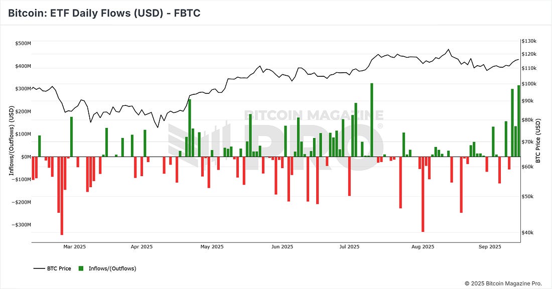 Bitcoin ETF Inflows Surge Ahead of FedWinklevoss twins predict Bitcoin could surge 10x as ETF inflows climb.What’s Happening Price Action In last weeks update we stated we were bullish BTC and that we expected it to rally off the 128-day moving average. That is exactly what has happened over the past week with BTC up +4.83%. Figure 1: BTC steadily climbing up this past week. BTC price has continued to push away from the 128 day moving average, a critical moving average in Bitcoin bull markets and is making its way back up towards $120,000. Figure 2: BTC pulling away from its key moving averages. In addition, price has also bounced off the Short Term Holder Realized price, another key area of support in Bitcoin bull markets. Figure 3: Short Term Holder Realized Price. The STH Realized Price acts as a broad area of support for BTC price in bull markets. It appears to be doing the same again right now. You can learn more about this important onchain metric here. We expect initial resistance for BTC to appear ahead of the previous all-time-highs at around $120,000. Figure 4: Potential upcoming area of resistance. The Big Story: Big Week For Bitcoin ETFs U.S. spot Bitcoin ETFs are seeing their strongest inflows in months as traders position ahead of the Federal Reserve’s September 17 meeting. The major Bitcoin ETF funds pulled in more than $2.3 billion over the past week, marking five straight days of positive flows. Figure 5: Bitcoin ETF inflows building up steam late last week. Daily inflows have been striking: $741 million on September 10, $552 million on September 11, and $642 million on September 12. Fidelity’s FBTC and BlackRock’s IBIT remain the top magnets for capital, with Fidelity alone drawing $315 million on Friday last week. Figure 6: Fidelity saw major inflows last week. Bitcoin’s price has rebounded above $115,000, boosted by expectations that the Fed will ease policy. A Reuters survey showed nearly all economists expect a 25 basis point rate cut, with more reductions likely before year-end. Recent soft inflation data, including an unexpected drop in producer prices, has strengthened the case for looser monetary conditions. Lower rates typically benefit risk assets, and ETFs are increasingly seen as the easiest on-ramp for pensions, hedge funds, and asset managers to gain exposure to Bitcoin. The strong inflows suggest Bitcoin is becoming a mainstream portfolio allocation, not just a speculative trade. This can be seen in the cumulative inflows into the Bitcoin ETFs since their inception with BlackRock’s IBIT (yellow section of the chart) dominating the cumulative inflows. Figure 7: Up only cumulative inflows into the Bitcoin ETFs. With liquidity set to improve and institutions stepping up allocations, we see this latest wave as a foundation for potential new highs in Bitcoin later this year. Buckle up, and we’ll be back with more insights as the Fed decision unfolds. Bitcoin Magazine Pro Team. Bitcoin Magazine ProFor more detailed Bitcoin analysis and to access advanced features like live charts, personalized indicator alerts, and in-depth industry reports, check out Bitcoin Magazine Pro. Make Smarter Decisions About Bitcoin. Join millions of investors who get clarity about Bitcoin using data analytics you can't get anywhere else. We don't just provide data for data's sake, we provide the metrics and tools that really matter. So you get to supercharge your insights, not your workload. Take the next step in your Bitcoin investing journey:
