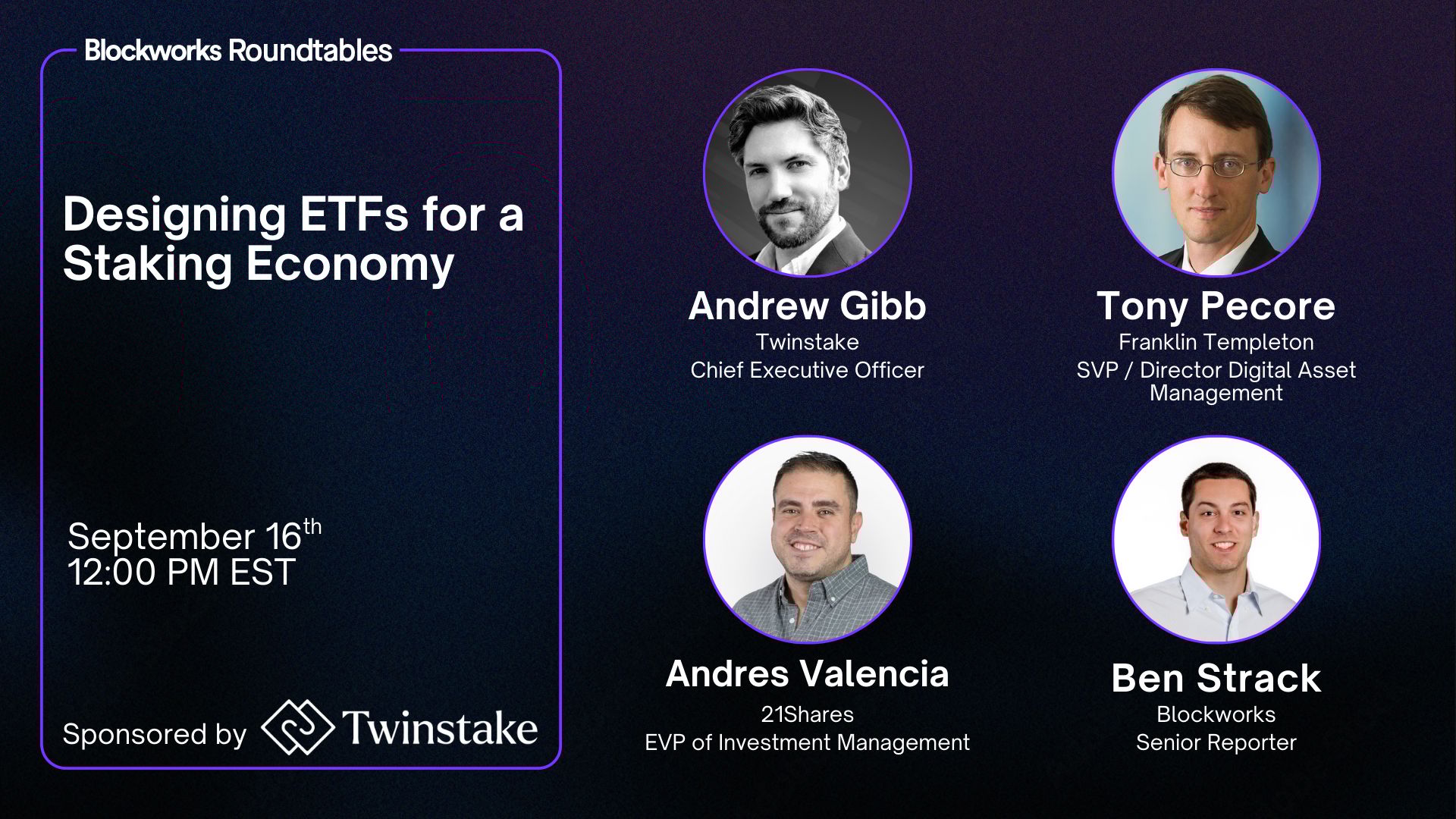 | Next Wave: Staking-Enabled ETFs | Over 20 spot digital asset ETFs have already launched in the US, but the next wave of staking-enabled ETFs promises far greater utility and yield potential. | | Join this Blockworks Roundtable as top issuers and service providers like Franklin Templeton, 21Shares, and Twinstake break down the technical and regulatory hurdles still standing in the way of their launch. | | | |