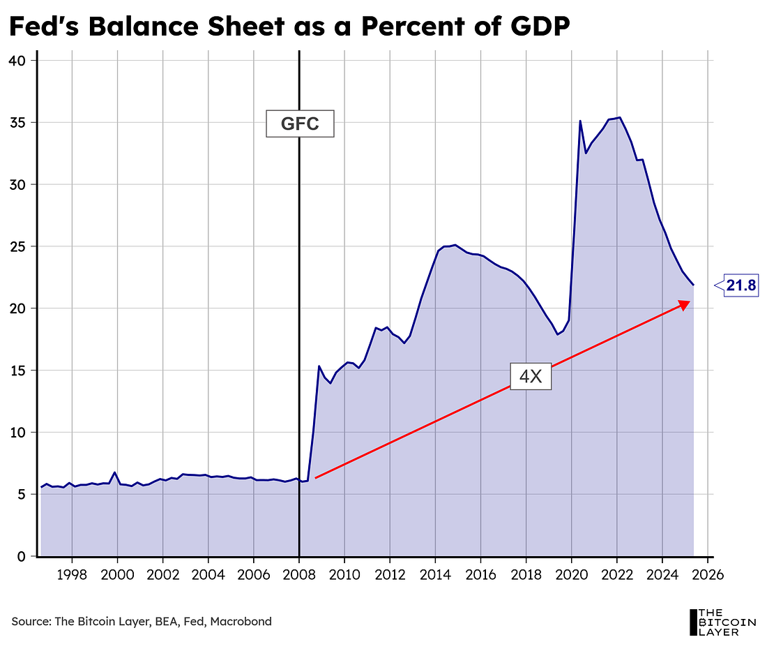 Now, remember how Alan Greenspan exploited reserves to implement the Fed’s desired target rate? Well, look at what has happened to the Fed’s balance sheet as a percent of GDP ever since the GFC (i.e., post massive liquidity injections): So, what does that mean? It means that reserves have moved further to the right of the reserve demand curve, where the slope is nearly zero: Which means the Fed can no longer use the old playbook of changing reserves to change interest rates (as Alan Greenspan did). The slope here is zero, which means the Fed Funds rate does not respond to changes in the supply of reserves as much as it once did. The GFC meltdown also resulted in a disintegration of interbank trust—never again would banks look to freely lend reserves to their neighbors without collateral, thus starting a transition to a more repo-based short-term liquidity fix for banks in a pinch, wherein Treasury collateral becomes a prerequisite to accessing overnight funds. Ample reserves framework...Subscribe to The Bitcoin Layer to unlock the rest.Become a paying subscriber of The Bitcoin Layer to get access to this post and other subscriber-only content. A subscription gets you: