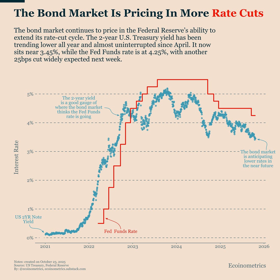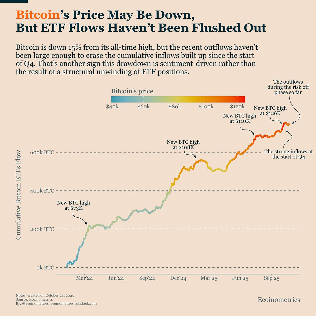 Together, these charts paint a picture of a market that’s cooling off in sentiment but not in structure. Bitcoin looks undervalued relative to equities, institutional demand remains firm, and the bond market is laying the groundwork for looser liquidity. In other words, short-term caution is warranted, but the macro setup still tilts in favor of recovery. In case you missed it, here are the other topics we covered this week: Bitcoin Market Monitor - Key Drivers in Ten Charts: Get these professional-grade insights delivered to your inbox: Bitcoin’s Nasdaq-Implied Fair Value Shows a 31% DiscountThere’s no point being bullish just for the sake of it, especially when the data tells you to stay cautious. Still, in markets, optimism often makes money while pessimism mostly earns the satisfaction of being right. But right now, the optimists have numbers on their side. Bitcoin is trading at a sizeable discount relative to equities. As discussed in our latest correlations report, Bitcoin has become deeply tied to risk-on assets, particularly the Nasdaq 100. Since COVID, the influx of institutional capital has tightened that relationship, making Bitcoin behave more like an extension of the equity risk cycle. A simple five-year log-linear regression between Bitcoin’s price and the Nasdaq 100 captures that connection very well. It tells us what Bitcoin’s fair value would be if it were trading in line with its historical relationship to equities. Today, that fair-value estimate sits near $156 K, while Bitcoin’s actual price is roughly 31 % lower. That’s a gap we have not seen since 2023. In plain terms, equities have already recovered from their recent drawdown, but Bitcoin hasn’t caught up yet. And that creates a big discount. If you assume the broader bull market isn’t over, that discount is unlikely to last. As the Nasdaq continues to recover and liquidity remains supportive, the relative-value gap should narrow through Bitcoin moving higher. And actually, we’ll look at more data in the next section that helps us see that optimism is justified. Bitcoin’s Drawdown Looks Sentiment-Driven, Not StructuralShort-term price swings can distract from what really matters. On any given day, Bitcoin’s price can jump or drop sharply because of liquidations, derivatives positioning, or sudden shifts in sentiment. None of that tells you much about the underlying trend. To see the real story, you need to look at structural data. And Bitcoin ETF flows are one of the cleanest measure we have of institutional demand. Unlike futures positioning, they reflect cash moving in or out of the market. As the chart below shows, cumulative ETF inflows have barely dipped even though Bitcoin is down about 15 % from its all-time high. The outflows during this risk-off episode are small compared with the strong inflows that began in early Q4. That’s a clear sign the bull market hasn’t been structurally unwound. Institutional holders aren’t redeeming, they’re holding through volatility. Combined with the rebound in the Nasdaq 100, this resilience suggests improving odds that Bitcoin’s correction could soon shift into a recovery phase, barring any major macro shock or other news events coming out of the U.S. that might spook the market further. Since ETFs pool long-term capital, they tend to act as an anchor of demand. Until sustained multi-week outflows appear, it’s premature to read this drawdown as the start of a broader bear phase. The Bond Market Is Signalling Easier Conditions AheadAnother reason to think the bull market isn’t over is that financial conditions keep improving. The bond market clearly believes the Federal Reserve will stay on its easing path. The best indicator of that is the 2-year Treasury yield, which tracks where investors expect the Fed Funds rate to head over the coming months. It’s not a perfect predictor, sometimes it runs ahead of the Fed, but it’s an excellent gauge of expectations. As shown on the chart below, the 2-year yield has been trending lower all year and now sits near 3.45 %, well below the Fed Funds rate at 4.25 %. That gap and that continued trend tells us the market expects more rate cuts soon. On top of that according to Fed Funds futures, there’s almost full pricing for another 25 bps cut next week, and the same again at the following meeting. In other words, investors broadly agree that policy is turning more accommodative. When markets expect easier policy, liquidity conditions start improving even before the Fed acts. Credit spreads tighten, dollar funding stabilizes, and risk appetite returns. If sentiment shifts back to risk-on, that backdrop will almost certainly benefit Bitcoin’s recovery. When short-term yields fall ahead of realized cuts, equity and crypto markets often respond early, because capital rotates toward assets that benefit most from looser liquidity. Bitcoin is one of them.