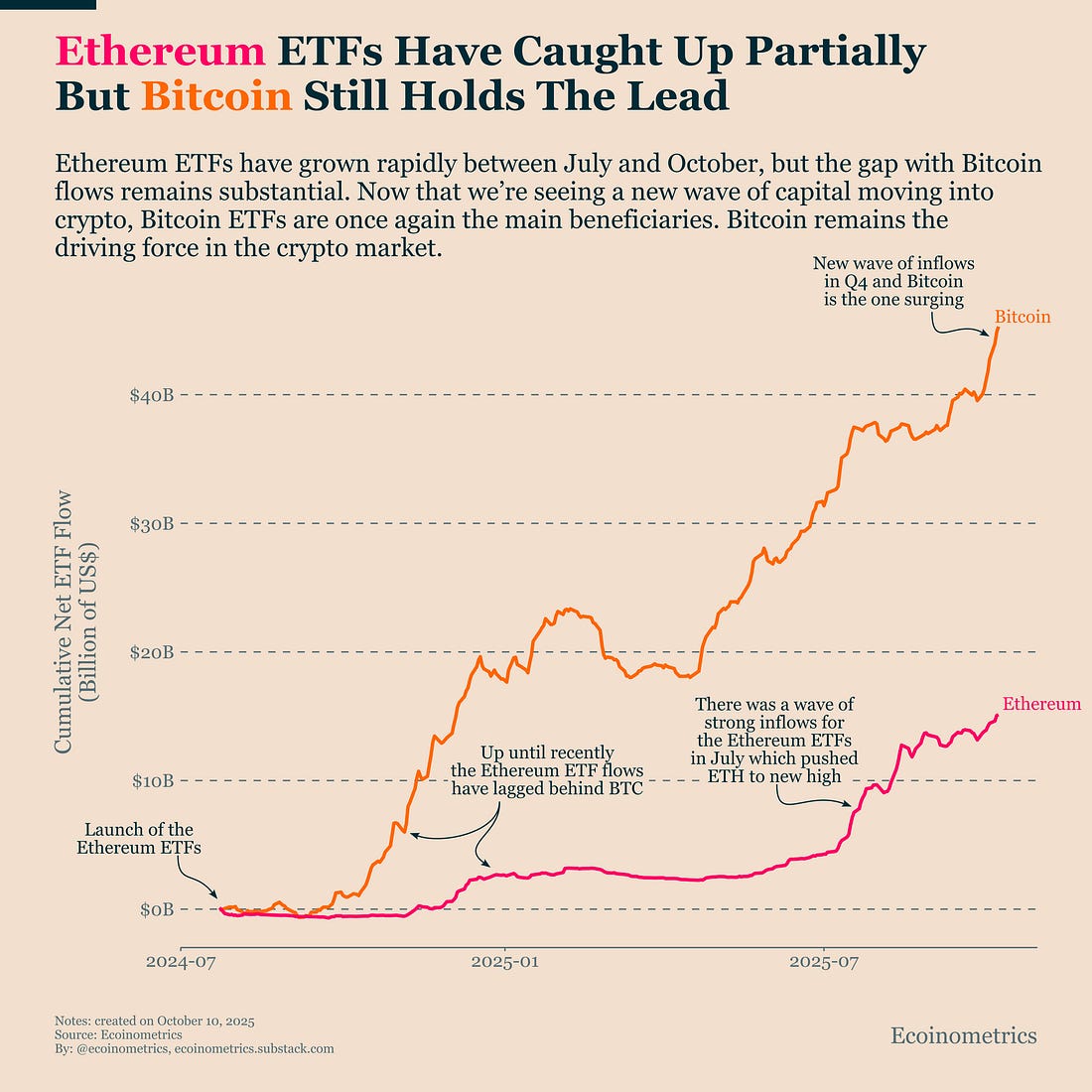 Together, these signals point to a market entering a new phase of the macro cycle in Q4. Liquidity is improving, capital is rotating toward hard assets, and the Fed’s tone is softening. All of this reinforce a favourable backdrop for Bitcoin. The message is clear: the drivers that fuelled last year’s growth are back in motion. In case you missed it, here are the other topics we covered this week: Bitcoin Market Monitor - Key Drivers in Ten Charts: Get these professional-grade insights delivered to your inbox: Strong Crypto Inflows, Bitcoin Still LeadsBitcoin just logged seven straight days of net inflows into its ETFs. On Monday alone, inflows topped $1.2 billion, the second-largest single day since launch. That supports our view that Q4 is shaping up as a rotation into crypto and hard assets. If the current pace holds, our ETF-flows-to-price model points to Bitcoin near $135K by month-end. Ethereum ETFs are also seeing renewed demand, but they still trail Bitcoin by a wide margin. ETH’s July surge helped narrow the gap, yet BTC remains the primary gateway for institutional capital entering crypto. We are not in a traditional alt-season. And the historical dynamic of alt-seasons might have changed. With ETFs now channeling new money from traditional finance, gains in Ethereum don’t need to come at Bitcoin’s expense the way they often did in past cycles. If ETH’s share of total crypto ETF inflows continues to rise while Bitcoin’s absolute inflows stay strong, that would signal a healthier broadening of institutional allocations, bullish market breadth without undermining BTC leadership. That said, ETH still looks appealing on a relative-value basis. Compared to its long-term relationship with BTC, it trades at a noticeable discount of 45%. If ETF demand keeps expanding, that spread could tighten. Watching the flow differential between BTC and ETH ETFs will show how that plays out.