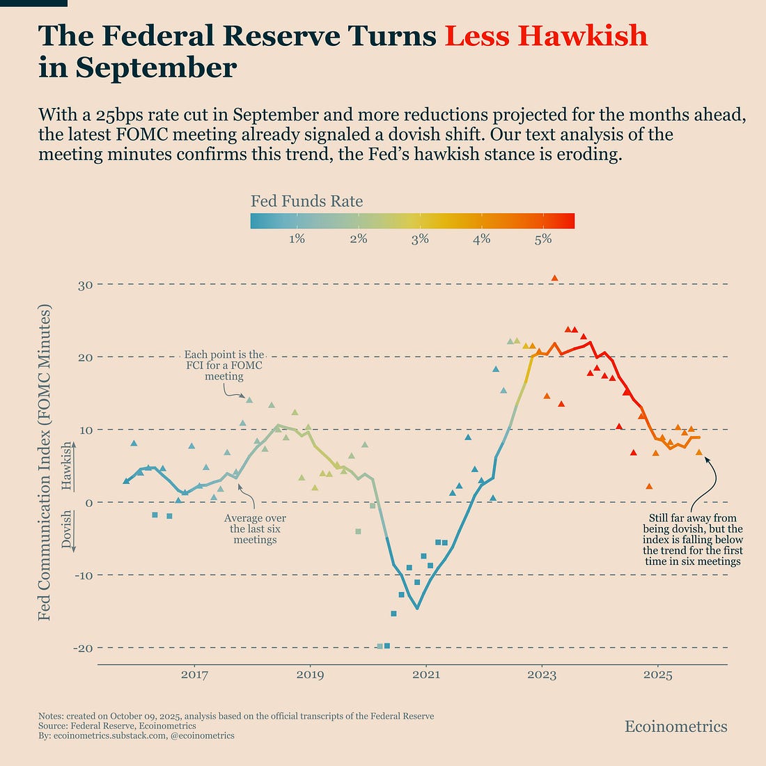 Bitcoin and Gold Remain Top Performers in a Hard-Asset CycleThe streak continues. As of early October, Bitcoin and gold remain the two standout global assets in both total and risk-adjusted returns. This isn’t a fluke, it’s been true for nearly two years. The persistence of that pattern points to a macro trend favouring hard assets. And the thing about macro trends is that they don’t turn on a dime. They tend to grind forward for years, shaping how capital allocates across markets. Think of the long decline in bond yields from the early 1980s to 2021. That 40-year cycle had plenty of ups and downs, but the underlying forces (disinflation, globalization, aging demographics, and central-bank interventionism) kept pushing yields lower for decades. Today, we may be in the early stages of another secular shift. Investors are increasingly worried about unsustainable fiscal paths and the risk of fiscal dominance, where government borrowing pressures limit central banks’ ability to tighten policy. If that dynamic takes hold, the value of major fiat currencies could erode over time. In that environment, Bitcoin and gold play a new structural role. They act as portfolio anchors against policy excess and currency debasement. Their prices will fluctuate with short-term liquidity cycles, but the long-term trajectory remains upward as capital adapts to the new macro reality. The Federal Reserve Turns Less HawkishThe September FOMC meeting brought a 25bps rate cut and clear signals of more to come. So, it’s no surprise that the tone inside the Fed has turned less hawkish. Still, the release of the FOMC minutes gives us a chance to quantify that shift. Running our text analysis on the minutes, the Fed Communication Index (FCI) shows the same story: both in words and in actions, the Fed is tilting dovish. The turn isn’t dramatic, Powell’s tone at the press conference was a bigger change than the minutes themselves, but for the first time in six meetings, the FCI has fallen below its recent trend. That marks a meaningful softening of stance after a year of steady hawkish messaging. Not dovish yet, but taking the direction. This kind of adjustment doesn’t happen overnight. The Fed prefers to move gradually, avoiding surprises to financial markets. But the direction is clear: policy communication is evolving toward less resistance to liquidity expansion, and that increasingly aligns with the U.S. Treasury’s objectives, lower borrowing costs and sustained debt financing. That alignment is the hallmark of fiscal dominance, a macro environment where inflation takes a back seat to debt management. As we discussed in the previous section, that’s a powerful tailwind for hard assets like Bitcoin and gold. In the near term, it also ensures U.S. financial conditions stay loose, a backdrop that remains highly supportive for risk-on assets.