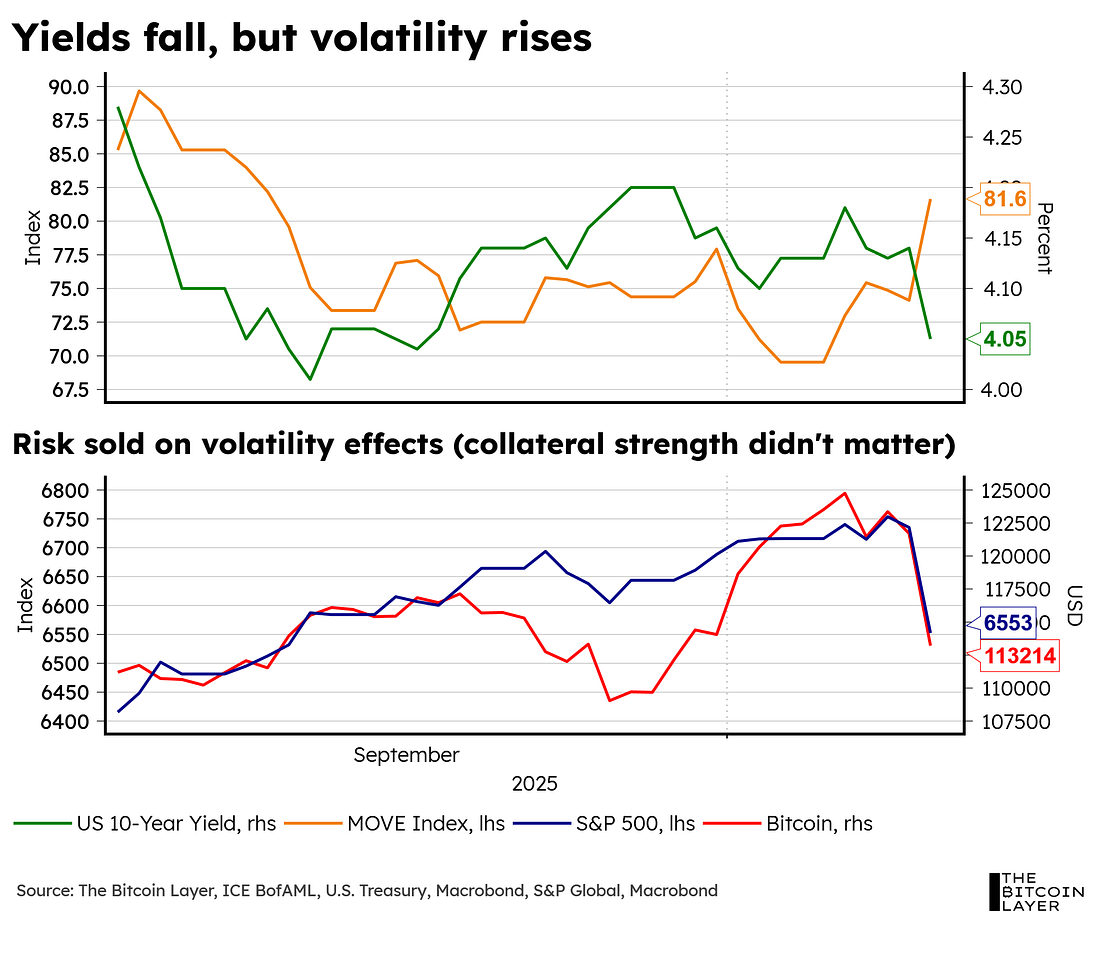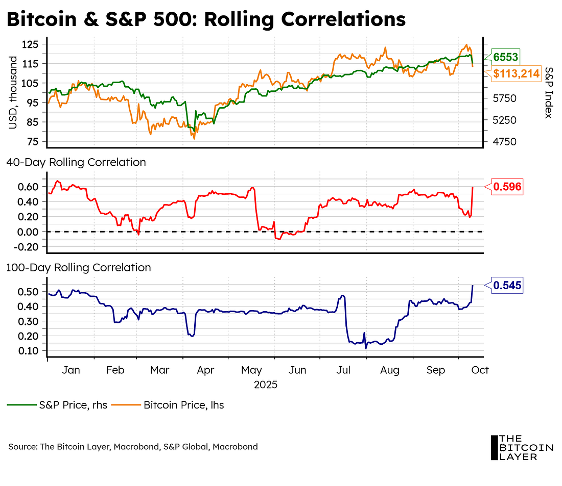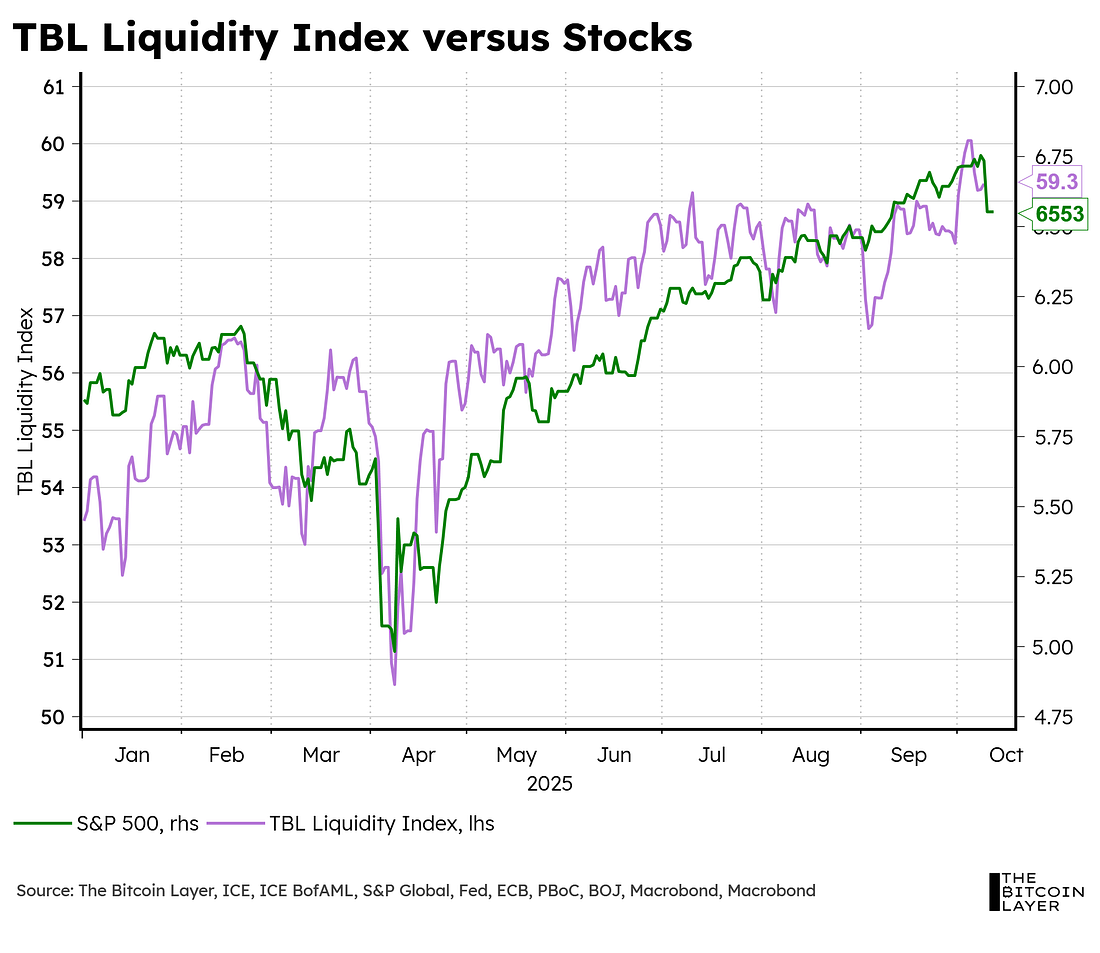 The net effect is that risk asset positions financed via repo (with Treasuries as collateral) fade, and risk plummets. Herein lies the importance of bond volatility to our TBL Liquidity Index—specifically, its opposing effects on our index. Just look at TBL Liquidity next to both bitcoin and the S&P 500 over the past year as bond volatility has decreased (which, in our framework, is positive for liquidity): Now, one thing that’s important to note here is that volatility is what matters in these financing transactions. In other words, if the collateral increases in value (Treasuries rise in price—yields fall), but does so in a violent way, a lender in repo markets will still demand a higher haircut. These are short-term loans with terms set ex ante, so if a lender doesn’t know where the Treasury will be tomorrow, that uncertainty affects the loan terms more than whether the collateral’s value ultimately rises or falls. This is why volatility measures like the MOVE index are more relevant for understanding repo market conditions (and liquidity) than the direction of Treasury price movements. A prime example of this hierarchy of importance took place yesterday: despite the underlying collateral becoming more valuable (yields down), bond volatility rose, which negatively affected the collateral multiplier, which hurt liquidity, and risk sold (chart below): Outlook for UptoberThat said, our outlook for October is still bullish. Zooming out, we have 4 things going our way: First, volatility remains at historically low levels, which is what has been leading our overall bullish liquidity narrative in the first place: Second, as the current administration fixes its mind’s eye on what people care about the most (inflation), low rates may continue to be the target of some more Trump-Tweet scrutiny, with a special focus on the back-end of the curve due to mortgage rates. This creates US Treasury tailwinds, which, over time, bleed into the system in the form of lower haircut benchmarks (positive for liquidity). Third, steeper curves may lead to better numbers in banks’ earnings reports over the next few weeks, which may help a V-shape recovery in the overall market: This, as seen from the correlation chart above, could bleed into a V-shape for bitcoin as well. Lastly, despite the government shutdown, the market remains fairly certain on 2 cuts this year, which again provides tailwinds in the overall market for risk. We continue to rely on our proprietary TBL Liquidity Indicator for our buy-and-sell signals, whose latest buy signal remains green in both stocks (+1.43%) and bitcoin (+4%): Overall, our narrative for October remains bullish—only if Trump has mercy with his tweets. This Article Was Brought To You By:The End of Fiat Retirement: Navigating Economic Uncertainty with a Bitcoin Retirement Plan Is the fiat retirement system sinking? With markets uncertain, layoffs on the rise, and monetary policy shifting, it might be time to rethink how you protect your long-term savings. On October 28 at 12 PM CT, Mark Moss and Unchained’s Jeff Vandrew will cover: