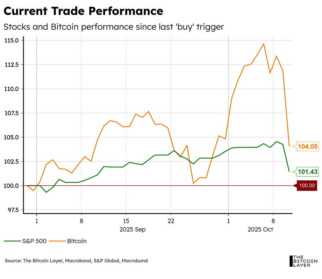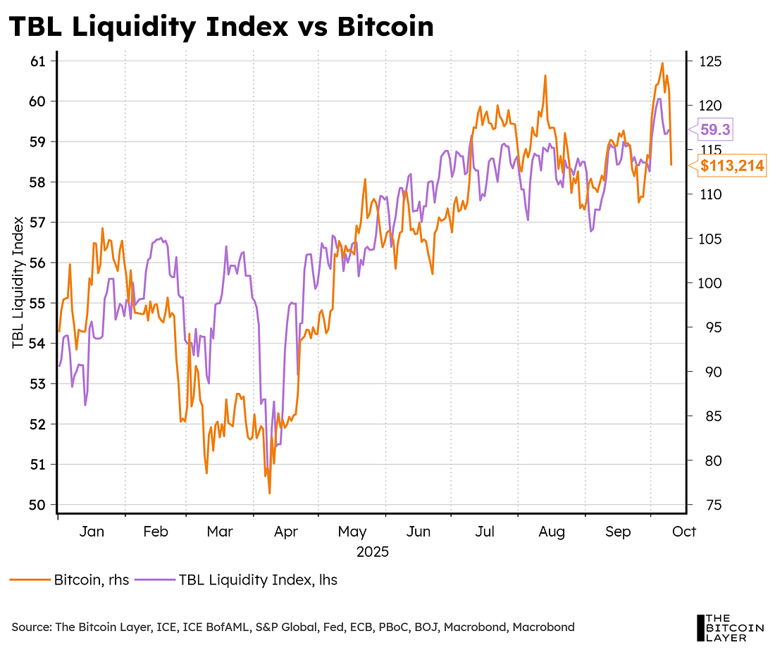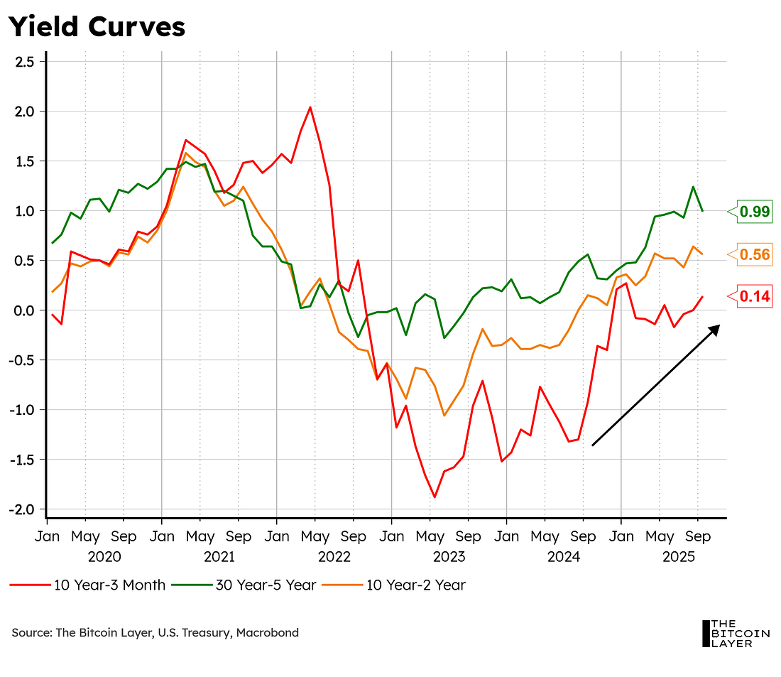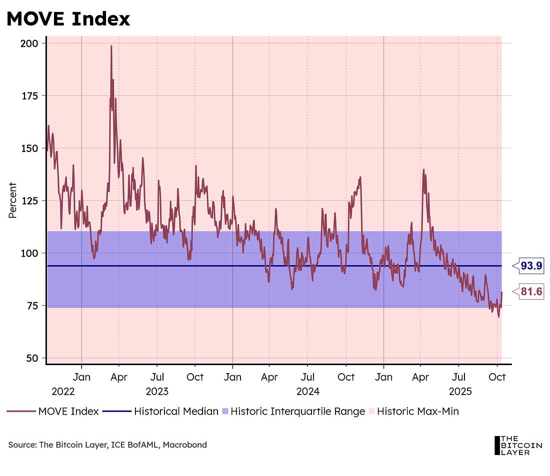 The net effect is that risk asset positions financed via repo (with Treasuries as collateral) fade, and risk plummets. Herein lies the importance of bond volatility to our TBL Liquidity Index—specifically, its opposing effects on our index. Just look at TBL Liquidity next to both bitcoin and the S&P 500 over the past year as bond volatility has decreased (which, in our framework, is positive for liquidity): Now, one thing that’s important to note here is that volatility is what matters in these financing transactions. In other words, if the collateral increases in value (Treasuries rise in price—yields fall), but does so in a violent way, a lender in repo markets will still demand a higher haircut. These are short-term loans with terms set ex ante, so if a lender doesn’t know where the Treasury will be tomorrow, that uncertainty affects the loan terms more than whether the collateral’s value ultimately rises or falls. This is why volatility measures like the MOVE index are more relevant for understanding repo market conditions (and liquidity) than the direction of Treasury price movements. A prime example of this hierarchy of importance took place yesterday: despite the underlying collateral becoming more valuable (yields down), bond volatility rose, which negatively affected the collateral multiplier, which hurt liquidity, and risk sold (chart below): Outlook for UptoberThat said, our outlook for October is still bullish. Zooming out, we have 4 things going our way: First, volatility remains at historically low levels, which is what has been leading our overall bullish liquidity narrative in the first place: Second, as the current administration fixes its mind’s eye on what people care about the most (inflation), low rates may continue to be the target of some more Trump-Tweet scrutiny, with a special focus on the back-end of the curve due to mortgage rates. This creates US Treasury tailwinds, which, over time, bleed into the system in the form of lower haircut benchmarks (positive for liquidity). Third, steeper curves may lead to better numbers in banks’ earnings reports over the next few weeks, which may help a V-shape recovery in the overall market: This, as seen from the correlation chart above, could bleed into a V-shape for bitcoin as well. Lastly, despite the government shutdown, the market remains fairly certain on 2 cuts this year, which again provides tailwinds in the overall market for risk. We continue to rely on our proprietary TBL Liquidity Indicator for our buy-and-sell signals, whose latest buy signal remains green in both stocks (+1.43%) and bitcoin (+4%): Overall, our narrative for October remains bullish—only if Trump has mercy with his tweets. This Article Was Brought To You By:The End of Fiat Retirement: Navigating Economic Uncertainty with a Bitcoin Retirement Plan Is the fiat retirement system sinking? With markets uncertain, layoffs on the rise, and monetary policy shifting, it might be time to rethink how you protect your long-term savings. On October 28 at 12 PM CT, Mark Moss and Unchained’s Jeff Vandrew will cover: