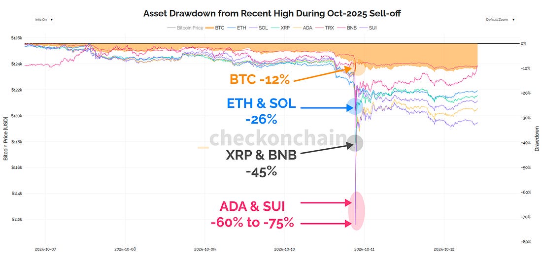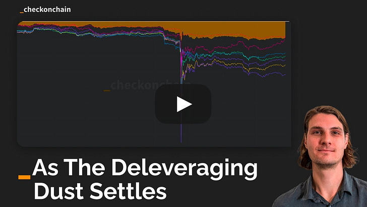 Dear Readers, We’re happy to, once again, share the stage with our favorite bitcoin on-chain analysts, Checkonchain. Before we get into today’s article, we wanted to quickly remind you that, to celebrate our third month writing together, we will be hosting a live YouTube Q&A tomorrow at 5:30 PM EST (2:30 PM PST): Looking forward to seeing you all there! Let’s get to the article now. As per usual, we will let the Checkonchain team open up with their analysis, and we will close it off with ours: G’day Folks, Is everyone having fun with their Bitcoins? I think it is safe to assume, a lot of us were glued to the Bitcoin price chart over the weekend, watching how the market responded after the largest deleveraging and liquidation event in Bitcoin/crypto history. Whilst Bitcoin sold off -12%, many altcoins got massacred, with ETH and SOL trading down -26%, XPR and BNB cut in half, and SUI and ADA trading down -65% to -75%… and the price of some long tail assets literally went to zero! This event was a real wake-up call for many crypto investors, showing that when volatility picks up and market makers back off, the bid for many of these tokens is simply non-existent. I’m also very confident that we weren’t the only ones watching the corn price this weekend. Every trader and investor with a Bloomberg terminal was watching it as well to get a read on what their equity portfolio was likely to do Monday morning. Bitcoin is one of the most sensitive assets to liquidity conditions, and even though this sell-off was arguably triggered by a Trump tweet about 100% tariffs with China, the impacts of such a thing would be felt market-wide. In today’s post, we return with our monthly collaboration with team at The Bitcoin Layer, where we will be covering:
