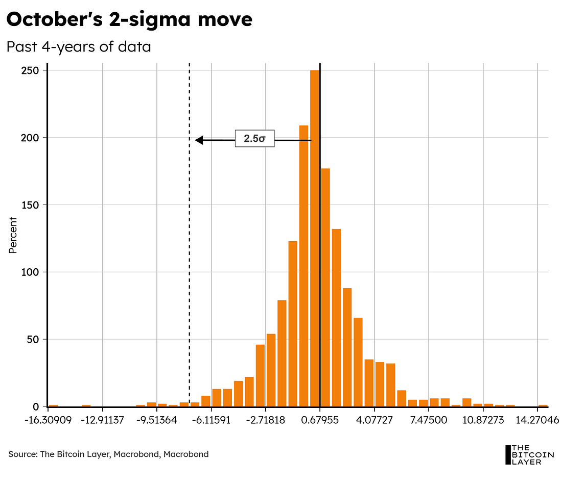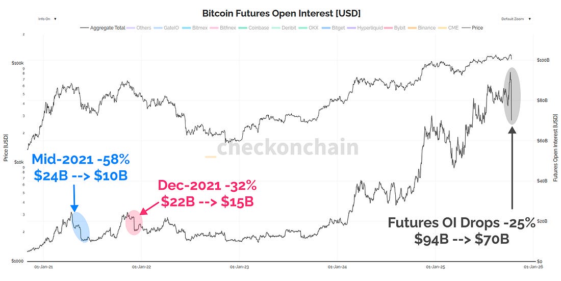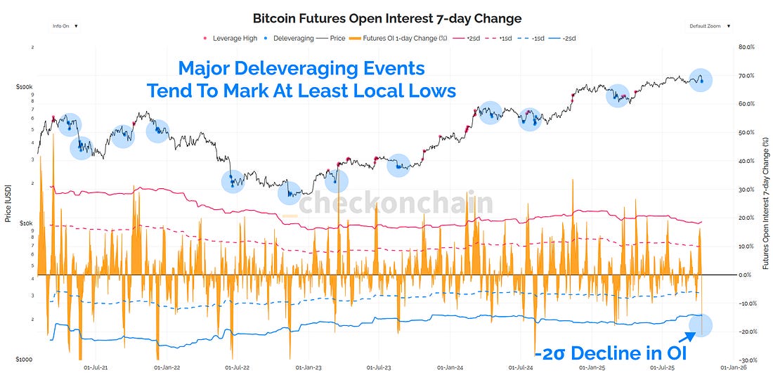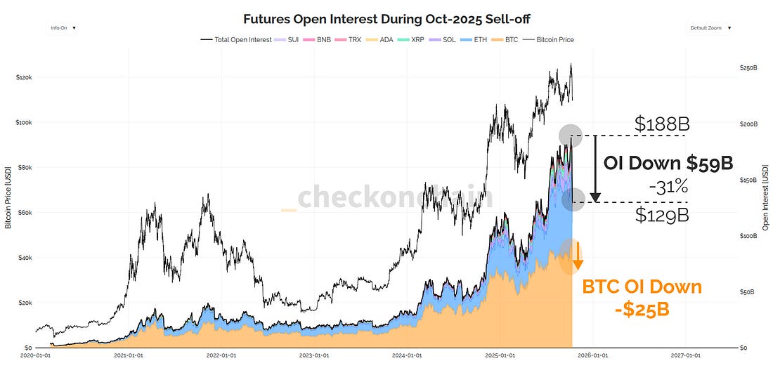 Full Premium VideoFutures Forest FireAt the start of October, I published The Bulls Are In Control, which highlighted that the break back above $118k likely signalled we were due a run back to all-time-highs. What I also flagged, is that futures open interest was hitting fresh ATHs, and the odds were increasingly high that we would see a lot more volatility as a result. Whilst there was no way to predict Mr President tweeting about 100% tariffs on an illiquid Friday afternoon, it was likely we’d see a wash-out of futures leverage at some point in time. What is crazy about this particular deleveraging event, is how massive it was in absolute terms. Across the largest crypto-assets, we saw over $59B in open interest flushed out, with $25B (42% of total) coming from Bitcoin markets. The drop in open interest was precipitous, and the majority of the flush out occurred in less than an hour of trading. When we look at the open interest decline for Bitcoin specifically, this was a -2σ standard deviation decline, and the largest since the Yen-carry-trade unwind in August 2024. Massive deleveraging events like this are very important to take seriously, because they have several knock on impacts: