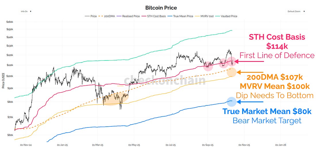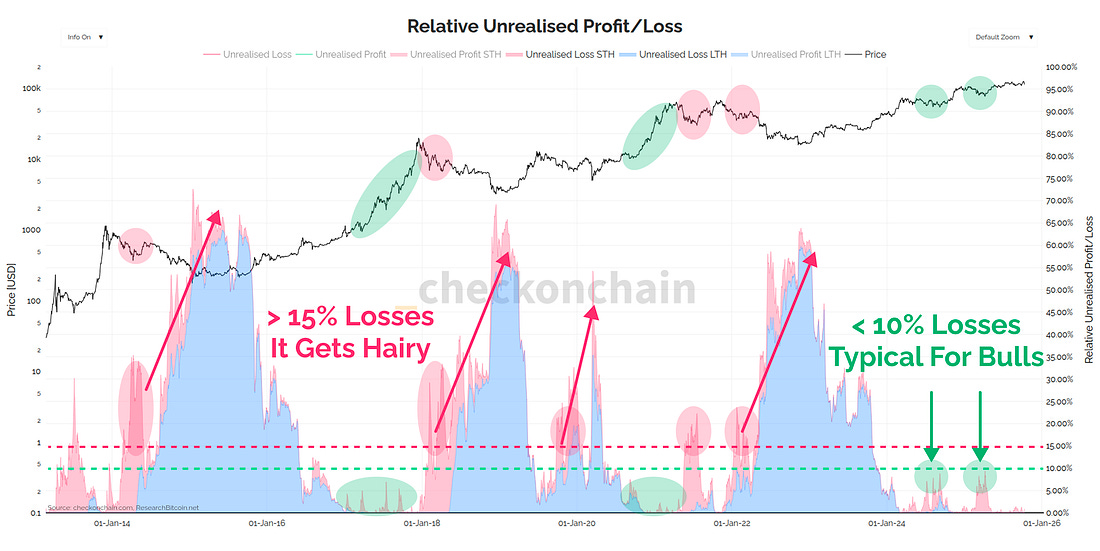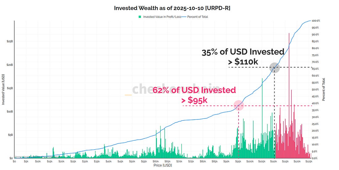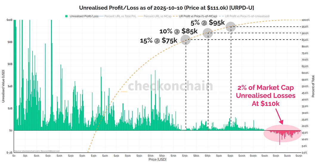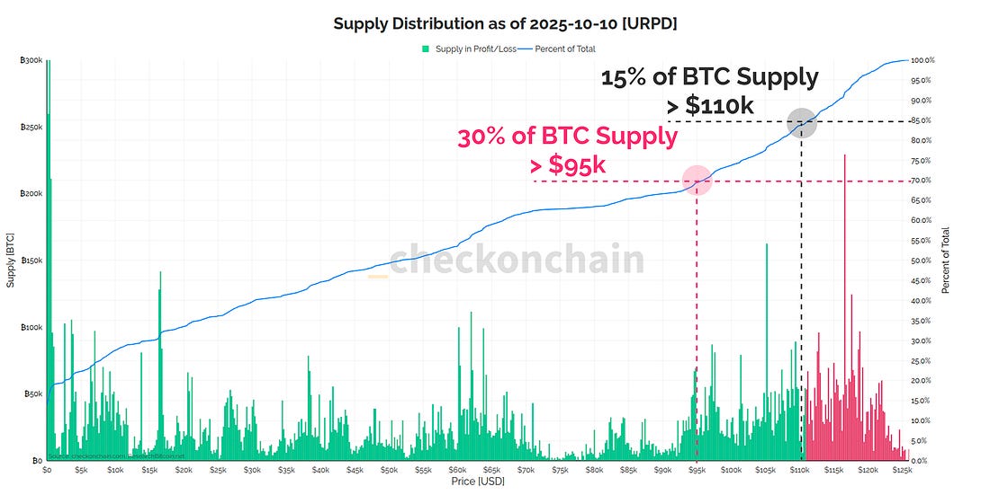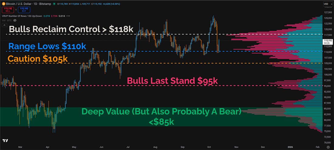 Whilst I’d rather we were higher, the fact of the matter is, the bears still have not taken us below the bulls first line of defence (the STH cost basis) on a serious closing basis. We had a forest fire…but our cabin in the woods still stands. If we look at the distribution of the entire BTC supply vs price, we can start to see why these price levels are quite important. Over 30% of the Bitcoin supply has an on-chain cost basis higher than $95k, and 15% of it was acquired above $110k. This is by far the largest zone of supply cluster that is relevant to us, because the next largest one is all the way back in the 2024 chopsolidation range, between $55k and $75k. I’m sure most of us would rather not see Bitcoin trading back down at those levels. Now, whilst the chart above is in BTC terms, most people still think about their portfolio value in terms of fiat currency (rightly or wrongly). As a result, people will naturally anchor to how much they invested, and less so to the number of coins held. The chart below shows each coin in the supply, except that we have weighted them by the price when they were acquired (think the USD value invested). From this vantage point, it becomes very clear why $95k is the most important price level to hold, because over 62% of the dollars ever invested in Bitcoin are above that price level. This is Bitcoin’s new home, and if you can imagine how nasty sentiment would get if all of those coins fell underwater…it would likely get pretty rough. Below $95k, Check the Analyst would struggle to classify the market as anything other than Top Heavy, and it is my view that this would start to heavily resemble the May and Dec 2021 crash events. Since the price is currently trading at $115k at the time of writing, we still have a buffer zone between here and $95k (although it is only $20k, and a -18% move below us). This is where those other price levels of $105k and $100k come into play, as they act as the ‘midpoint’ of the current supply distribution, and assuming we can hold above those levels, bull market sentiment should remain largely intact. However, if we were to break down to $105k…and then $100k…suddenly $95k isn’t that far away, and more and more people will start seeing a growing red number in their portfolio. If we did reach $95k, the total volume of unrealised losses held across the market would equal 5% of the Bitcoin market cap, compared to the 2% we are at today. Bull markets of the past have tended to meet their end whenever unrealised losses spike above 10% of the market cap, and we touched that upper bound in both 2024 and 2025. If you can recall, those events also had people calling for the end of the cycle, and the start of a bear market. Whilst they were ultimately proven wrong about that, it does go to show how ‘in the gutter’ sentiment can be at an unrealised loss level of 10%. The risk is, should the price fall below $95k, losses accelerate quickly, and since we don’t have a huge amount of historical support until $75k…well…you can probably see where I am going with this. I expect sentiment to get increasingly nasty below $95k, and as a result, I would really rather the bulls step in before that, so I don’t have to put this thesis to the test. So that brings us to the final chart, where we can summarise my current thinking about the key lines in the sand. These levels align both from an on-chain perspective, but also from a technical analysis perspective using the volume profile: