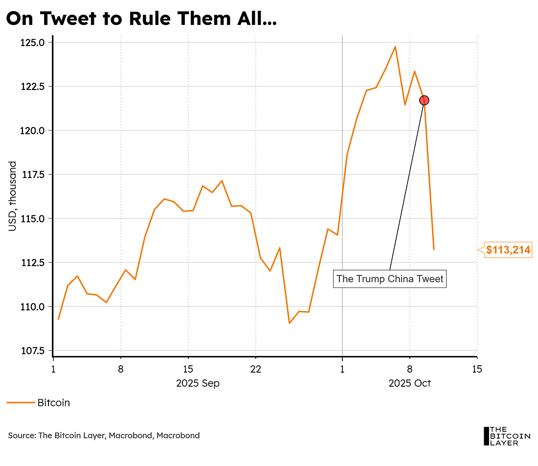 However…it’s not all bad news. These levels obviously map out a bear case scenario, and we must be very conscious that this is only one potential outcome. By the same note, a break above $118k would put us above the top-most volume point of control, and if cleared, would be the second time we have survived a failed ATH break below it. If we break above $118k, I believe we’re off to the races, and I stand by my previous post, noting that we have earned a serious shot at $150k. What I will leave you with is one final idea. I don’t think we chop sideways in the weeks and months ahead. I think the market is primed and ready to trend in a big way. If we go lower, I think we go a lot lower. If, on the other hand, we go higher…I think we go a lot higher. It’s time to rock and roll, and the next set of these major price levels we bust through, I believe defines the next major trend. I’m impressed we only traded down -12% on this move, but the time is certainly now for the bulls to step in. Seatbelts on. Concluding Thoughts from CheckonchainIt is always a pleasure to collaborate with The Bitcoin Layer team, and they always bring a unique perspective to the macro and liquidity landscape that we really need as Bitcoiners. Bitcoin is a macro asset, and every man and his dog has been watching the price chart like a hawk over the weekend to see what might come next for their portfolio. Bitcoin is increasingly linked to the wider markets, and signs of weakness in equities would no doubt ripple into Bitcoin markets as well. I already think gold has shown us where this road leads (much higher). But I am conscious that further weakness in Bitcoin may be telling us the road to get there could be a bumpy one. We have a positive liquidity tailwind, and the bears haven’t proven their case just yet. Strap in. Thanks for reading, James Once again, thanks to the Checkonchain team for the in-depth on-chain analysis. We will also be extending a 7-Day Free Trial (available for 48 hours) as our way to commemorate this collaboration: Onto our analysis: We are finally right in the middle of the long-awaited Uptober, and although bitcoin started the month on an extremely high note, President Trump had different plans (as the Checkonchain team highlighted in their analysis above): We are starting to seriously consider creating a Trump indicator alongside all of our TBL Liquidity metrics, but that’s a topic for another day. For now, suffice it to say that the roaring start to the month of October has been set back by, as Joe Consorti puts it, one of the largest nominal flash crashes in the orange coin’s history, with $278B wiped out in less time than it takes to watch an episode of your favorite Netflix drama. Just a few weeks ago, we were all talking about a 4% crash, which is looking puny right about now: Looking back at the last 4 years’ worth of daily observations, Trump’s tweet ended up being a 2.5-sigma move for bitcoin: Perhaps this flash crash is a perfect example of just how exposed bitcoin is to more widespread market risks. That is, when correlations with the stock market are high (which they have been on a historical account)… …that means more exposure to knee-jerk market reactions, such as those we’ve seen this year following Trump’s tweets. But enough of the doom and gloom. Let’s step away from daily moves and look now at the bigger macro picture. TBL LiquidityAs you’re all aware, US Treasuries play an essential role in today’s financialized economy, and whether we like it or not, they are scarce assets (...yes, we are aware of this chart): Why are they scarce? Despite an insurmountable level of debt, U.S. Treasuries are still considered by many to be the risk-free asset of the world. Furthermore, each Treasury is its own individual asset with a unique CUSIP and characteristics. Unlike the fungibility of Apple stock—whereby exchanging one Apple stock with another leads to holding the same asset—exchanging one Treasury for another doesn’t exactly work like that. If the US Government issues a 10-year note, while at the same time, there is an old 30-year bond that was issued 20 years ago and therefore has 10 years left to mature, these two Treasuries may match in maturity, but that doesn’t make them fungible. Over 70% of the trading volume in the US Treasury market takes place in on-the-run securities, which are the most recently auctioned Treasuries (source). And while the story of how that came to be is beyond the scope of this article, the key takeaway here is that, in a self-fulfilling manner, financial infrastructure and liquidity have concentrated around newly issued Treasuries—put simply, everyone wants the new ones because there’s just a lot more infrastructure, and therefore, more you can do with them. On-the-runs are also easier to post as collateral in repo transactions, even though technically all Treasuries are supposed to warrant the same haircut as each other—bilateral repo participants don’t always agree with the idea that a deep off-the-run Treasury equals an on-the-run one. Ergo, US Treasury Buybacks. Given the high spreads and illiquidity behind old Treasuries, older issues add frictions to the market (clogging balance sheets and, therefore, liquidity), so removing these older issues from the market leads to reduced frictions and fewer hiccups overall. Anyway, where were we? Oh, that’s right! The scarcity of US Treasuries—specifically, on-the-run Treasuries. The reason we mention that is because of something known as the circulation of collateral. As a result of the aforementioned scarcity, as well as high demand, US Treasuries are prime collateral, leading a single US Treasury security to circulate around multiple balance sheets. The Fed puts it best: