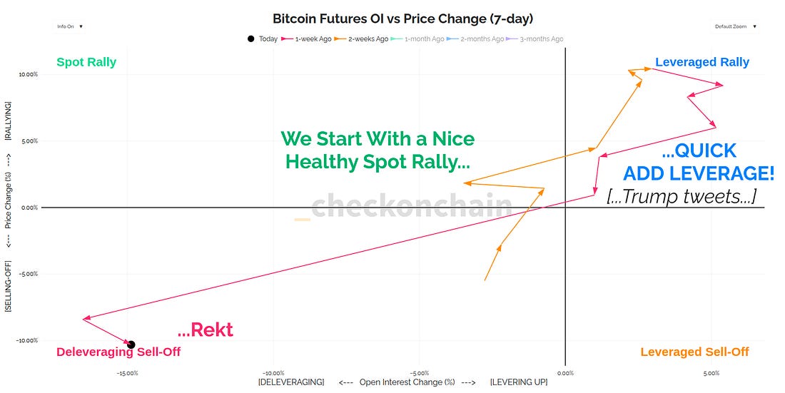 The short summary is, as the price rallied two weeks ago, the market added more and more leverage, expecting us to fly to $1M… …Instead, we sold off -12%, and open interest declined by such a massive amount, I had to adjust the default view of this chart to fit it in. Moving forwards, a healthy market structure will see trading more in the top left quadrant, and less on the right-hand side. Lines In The SandSo, in the aftermath of a pretty significant event, how does this affect the setup for Bitcoin moving forward? Readers will know that we have retained a core bullish stance; however, with key lines in the sand for where things are likely to deteriorate. The framework by which we think about the rolling over of a bull into a bear is as follows: