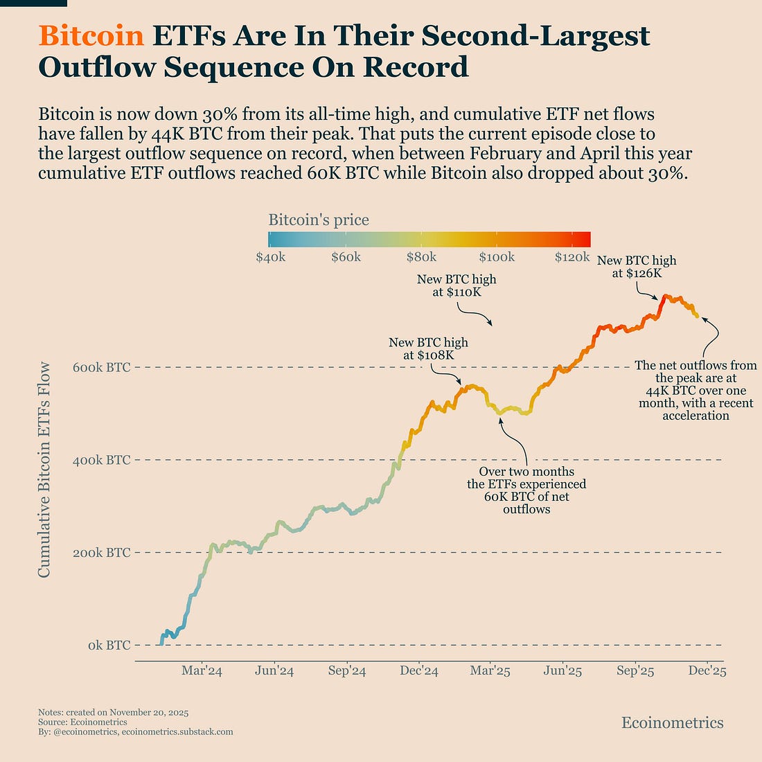Bitcoin ETFs Are In Their Second-Largest Outflow Sequence On RecordAlso Nasdaq Weakness Is Nearing a Level That Signals Macro Stress & Fed Communication Turns the Least Hawkish of the YearWelcome to Ecoinometrics’ Friday edition. Each week, we analyze the three most critical market signals impacting Bitcoin and macro assets, delivering institutional-grade insights through data-driven charts and analysis. Today we’ll cover: