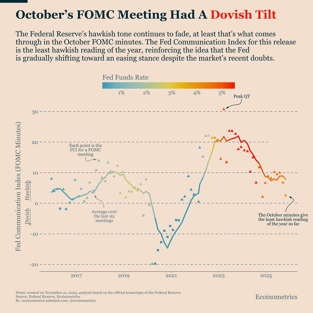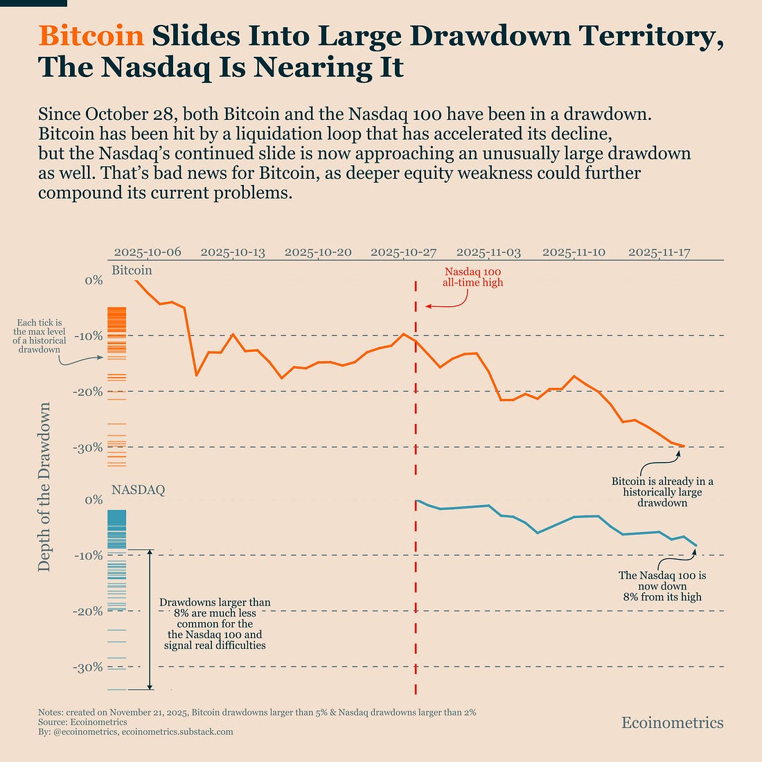 Despite covering different angles, all three charts point to the same issue: pressure is building across every layer of the market. Bitcoin is dealing with a direct flow-driven liquidation loop, equities are inching toward levels that signal real macro stress, and the Fed’s tone (while softening) is still far from providing near-term relief. Together, these forces help explain why Bitcoin remains vulnerable and what to watch as we head into December. In case you missed it, here are the other topics we covered this week: Bitcoin Market Monitor - Key Drivers in Ten Charts: Get these professional-grade insights delivered to your inbox: Bitcoin ETF Outflows Enter Their Second-Largest Stretch on RecordThe outflow situation continues to worsen for the Bitcoin ETFs. Since the peak in October, cumulative ETF net flows are down 44,000 BTC. That’s a meaningful amount of forced selling, and it’s weighing heavily on the price. As a reminder, every 10,000 BTC of outflows over a 30-day period tends to pull down Bitcoin’s performance by about 3.5%, so the drag we’re seeing is consistent with that relationship. This is now the second-largest wave of ETF redemptions since launch. The only bigger one happened between late February and April this year, when uncertainty around U.S. monetary policy and new tariffs triggered roughly 60,000 BTC of outflows. That episode pushed Bitcoin into a drawdown that bottomed around 30% below the all-time high. Right now Bitcoin is drifting even lower than that level. On Wednesday we broke down the drivers behind this outflow sequence, and the conclusion was that Bitcoin-specific factors are doing most of the damage. This doesn’t look like a broad risk-off rotation. Instead, Bitcoin is stuck in a liquidation loop: outflows push the price lower, and lower prices create more outflows. The only way to see if this loop is slowing is by watching the trajectory of the flows. So far, there’s no sign of stabilization. The combined flow-and-price path is also tracking the bearish scenario from last week’s Bitcoin Market Monitor update. That path implied Bitcoin eventually stabilizing somewhere in the $69K–$81K range. Nasdaq Weakness Is Nearing a Level That Signals Macro StressOne thing that won’t help Bitcoin right now is if the Nasdaq 100 continues sliding toward a deeper drawdown. As we discussed in Wednesday’s correlations report, the macro backdrop had mostly remained risk-on, and Bitcoin’s decline was driven more by its own liquidation loop rather than broader equity weakness. But that picture is shifting. The Nasdaq 100, arguably the strongest proxy for risk-on sentiment, is now approaching levels where the pullback becomes a genuine macro headwind. Up to this point the drawdown in the Nasdaq has been mild and well within the range of typical historical fluctuations. But once it crosses an 8% decline, we move into territory that’s far less common and usually signals real stress in the equity market. At that point, the factor represented by the Nasdaq flips from neutral to negative, and it reinforces Bitcoin’s problems by removing one of the few remaining sources of macro support. For investors, the timing matters. Bitcoin-specific selling can stabilize quickly on its own, but once Nasdaq momentum breaks, cross-asset correlations tend to tighten. That spillover effect often extends the duration of drawdowns and makes recoveries slower. If the Nasdaq keeps dipping, Bitcoin likely faces even more downside pressure in the short term. This is the next key variable to watch. Fed Communication Turns the Least Hawkish of the YearNow, the big question is whether we can still avoid the worst-case scenario: a true macro bear market. Corrections happen, sometimes they are deep, but what determines how quickly Bitcoin can recover is the macro environment. And nothing shapes that environment more than U.S. monetary policy. Right now the market is worried that the Federal Reserve may back away from the rate cuts they hinted at late this summer. But when we dig into the October FOMC minutes (released this week) a different picture emerges. On our Fed Communication Index, which scores Fed texts along a dovish–hawkish scale based on a quantitative text analysis, the October minutes come in far less hawkish than the prior meeting. In fact, it’s the least hawkish reading of 2025, essentially back to a neutral stance. That suggests that internally, as of the last meeting, the Fed still viewed ending QT and moving toward a more normal rate policy as the right path. This doesn’t guarantee they’ll follow through, but it implies that the most vocal “no more cuts” governors may not reflect the centre of gravity inside the institution. If the Fed eventually reassures the market that normalization is still the plan, and pairs that with the end of balance sheet reduction, that would be supportive for risk assets, including Bitcoin. But the December FOMC meeting is still about 20 days away. And not everyone is convinced the Fed can keep easing while inflation remains sticky (see Monday’s bond market section). Until the Fed provides clarity, this uncertainty will keep adding pressure to Bitcoin’s price. That’s it for today. Thanks for reading. Cheers, Nick P.S. Every week, our team conducts extensive research analyzing market data, tracking emerging trends, and creating professional-grade charts and analysis. Our mission: Deliver actionable macro and Bitcoin insights that help institutional investors and financial advisors make better-informed decisions. Ready for institutional-grade research that puts you ahead of the market? Click below to access our premium insights. You're currently a free subscriber to Ecoinometrics. For the full experience, upgrade your subscription. |