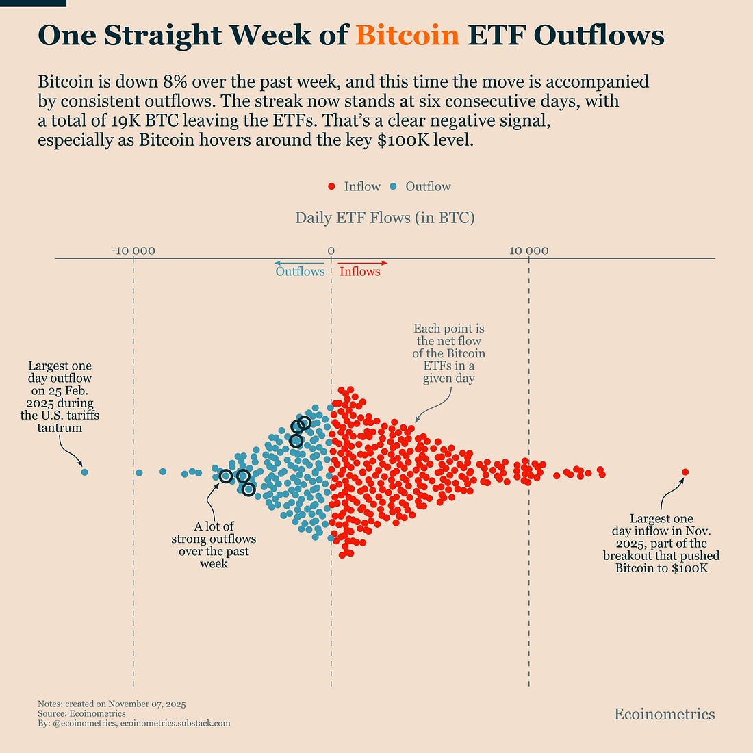 Taken together, these signals describe a market in transition. Institutional flows are turning cautious, the price pattern echoes earlier corrections, and rising equity volatility continues to weigh on sentiment. The next few weeks will reveal whether this remains a mid-cycle pullback or evolves into something deeper. In case you missed it, here are the other topics we covered this week: Bitcoin Market Monitor - Key Drivers in Ten Charts: Get these professional-grade insights delivered to your inbox: Bitcoin’s Price Weakness Is Affecting ETF FlowsFor most of October, Bitcoin traded quietly around $110K while ETF flows stayed positive and steady. That was a good sign, institutions weren’t selling even as price momentum faded. But over the past week, that dynamic has flipped. The chart below shows the distribution of daily Bitcoin ETF flows since launch. The last six days (circled) are outflows and half of them are large. This is the first time we’ve seen sustained redemptions in a while, signalling a change in investor behaviour. As price weakness sets in, ETF holders are beginning to redeem shares, creating a feedback loop: selling drives redemptions, and redemptions drive more selling. That’s the risk we highlighted in this month’s ETF Flows Report, where our simulations model tilt towards negative flows. So far, the data are tracking closer to the bearish scenarios in those simulations. The question now is how far this pattern extends: