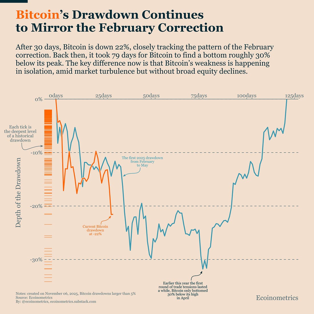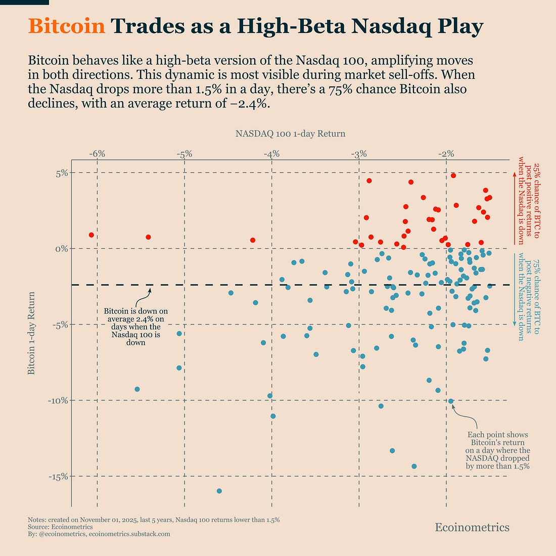 The next few sessions will be key. If flows turn positive again near the $100K level, it would suggest institutional buyers are still willing to defend that price zone. But if redemptions persist, our model hints at Bitcoin’s only stabilizing between $80K and $95K. A Repeat of February’s DrawdownBitcoin is down about 22% after just over a month in drawdown, and the pattern looks strikingly similar to the correction we saw from February to May. Back then, it took 79 days for Bitcoin to bottom roughly 30% below its peak and the path there included multiple sharp dips tied to U.S. tariff headlines. This time, history seems to be rhyming. But there’s one crucial difference. The February drawdown unfolded while the Nasdaq 100 and other risk-on assets were also sliding. In contrast, today’s pullback is happening without stocks being also in a deep drawdown. The Nasdaq is down about 4% from its new high, a new high that it made while Bitcoin was sliding. Bitcoin is lagging, it is failing to capture the upside in risk assets while still reacting to downside volatility. In other words, the market turbulence is asymmetric: Bitcoin takes the hit on bad days but doesn’t benefit on good ones. A calmer backdrop could help. Less fear, the end of the U.S. government shutdown, and a return to regular economic data releases might give Bitcoin the breathing room it needs to find support and rebuild from there. And as we noted in Monday’s edition, the macro setup still doesn’t resemble the conditions that marked the start of past Bitcoin bear markets. Downside BiasTo understand why volatility in U.S. equities spills over to Bitcoin, it helps to remember that Bitcoin behaves like a high-beta version of the Nasdaq 100. The two assets move together most of the time, but the relationship becomes especially tight during market sell-offs. When the Nasdaq drops more than 1.5% in a single day, there’s a 75% chance Bitcoin also declines and on those days, its average loss is around 2.4%. In other words, Bitcoin amplifies equity moves, particularly on the downside. That means periods of heightened equity volatility are usually bad news for Bitcoin. Big swings in the Nasdaq, whether triggered by macro headlines, earnings shocks, or geopolitical events tend to drag Bitcoin lower even when the news has nothing to do with crypto. This is what it means for Bitcoin to trade as part of the risk-on complex. Less turbulence in U.S. equities, not necessarily better crypto fundamentals, would help Bitcoin stabilize in the near term. The takeaway for investors is that short-term Bitcoin volatility often reflects cross-asset sentiment rather than on-chain fundamentals. Until the current correlation regime breaks, equity market calm is Bitcoin’s best friend. That’s it for today. Thanks for reading. Cheers, Nick P.S. Every week, our team conducts extensive research analyzing market data, tracking emerging trends, and creating professional-grade charts and analysis. Our mission: Deliver actionable macro and Bitcoin insights that help institutional investors and financial advisors make better-informed decisions. Ready for institutional-grade research that puts you ahead of the market? Click below to access our premium insights. Invite your friends and earn rewardsIf you enjoy Ecoinometrics, share it with your friends and earn rewards when they subscribe. |