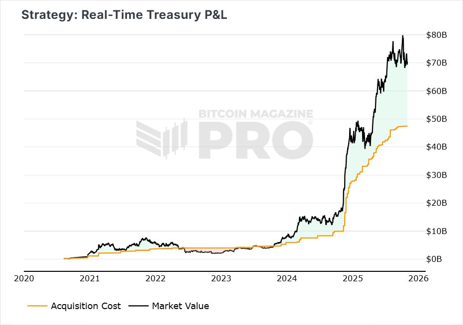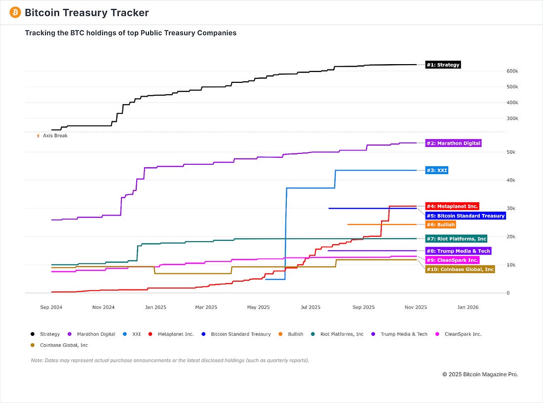 Is Strategy (MSTR) Setting Up for a Rebound?Bitcoin Sideways Grind Meets MSTR Momentum: $20B unrealized gains fuel treasury giant's recovery play, while global adoption whispers from Germany and fast food chains.What’s HappeningPrice ActionOver the past week, BTC has dropped back down to the 200-day moving average and is currently resting right above that key support level. It is down -3.35% over the past week. Figure 1: BTC price has drifted down over the past week. It continues to oscillate between the 200DMA and the 128DMA. Figure 2: BTC reclaiming the 128-day moving average. Over the past three months, BTC has done little more than fluctuate sideways. Price has moved just 3% over those past 3 months as shown on the chart below. This price action has been testing the patience of many market participants and is likely causing problems for retail traders who have been attempting to leverage long breakouts. Figure 3: BTC choppy price action over the past 3 months. BTC still remains well above the 1-year moving average ($102,000), see figure 2, which remains the line in the sand for the bull market. Should we lose that level, then the bull market would most likely be over. For now, we continue to hold the 200-day moving average, which is well above the 1yr moving average. The upside target remains a breakout above the 128-day moving average ($114,500) and maintaining a hold above it. That’s what the bulls are looking for. The Big Story: Is Strategy (MSTR) Setting Up for a Rebound?Strategy Inc. (MSTR) remains the undisputed leader among public companies holding bitcoin, with 640,808 BTC on its balance sheet, far ahead of any peer. As the chart below shows, no other company comes close. Figure 4: Top Treasury Company Holdings over time. Those holdings, acquired at an average cost near $74,000 per BTC, now represent a substantial unrealized gain with Bitcoin trading above $107,000. Strategy’s profit on their bitcoin is currently over $20B. Figure 5: Strategy sitting on a +$20B bitcoin paper profit. Strategy’s position has effectively transformed its balance sheet into a high-beta Bitcoin ETF, one that has also just been recognized for eligibility to join the S&P 500, marking an important milestone for corporate Bitcoin adoption. Operationally, Strategy reported another strong quarter, posting $2.78 billion in net income versus a $340 million loss a year earlier. The company continues to expand its treasury strategy, adding coins and maintaining disciplined financing that keeps its leverage profile in check. Yet despite those tailwinds, the share price has come under heavy pressure. MSTR has fallen sharply in recent weeks, underperforming Bitcoin as market participants question the broader category of treasury companies following the influx of new participants into the market. The stock has now dropped below its one-year moving average, a level that often defines long-term trend direction. Figure 6: MSTR now sitting just below its 1yr moving average. This is a key inflection point. If price can stabilise above that support and Bitcoin continues to grind higher, MSTR could quickly regain momentum. But failure to reclaim the moving average would signal a deeper consolidation phase ahead. Making this a moment to stay alert and watch closely. You can view the Strategy dashboard for free here. To check out more Bitcoin metrics like the ones in this newsletter and receive alerts for key Bitcoin charts so you stay ahead of the crowd, subscribe here. The Bitcoin Magazine Team. Bitcoin Magazine ProFor more detailed Bitcoin analysis and to access advanced features like live charts, personalized indicator alerts, and in-depth industry reports, check out Bitcoin Magazine Pro. Make Smarter Decisions About Bitcoin. Join millions of investors who get clarity about Bitcoin using data analytics you can’t get anywhere else. We don’t just provide data for data’s sake, we provide the metrics and tools that really matter. So you get to supercharge your insights, not your workload. Take the next step in your Bitcoin investing journey: