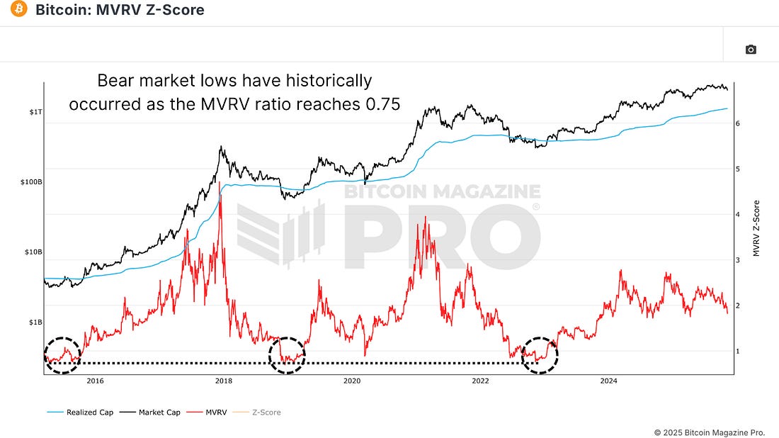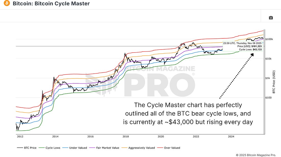 Modeling The Next Bitcoin Bear MarketData-driven models reveal where the next Bitcoin bear market could bottom—hint: the floor may be higher than you think.While many are still focused on how high Bitcoin could go during this current bull market (although given current price action, maybe not!), it’s equally important to prepare for what comes next. Here we’ll look at the data and mathematics that can help us estimate where Bitcoin’s next bear market low could occur, not as a prediction, but as a framework based on prior cycles, on-chain valuation metrics, and even the fundamental valuations of BTC. Cycle MasterOne of the most consistently accurate models for identifying Bitcoin’s cyclical bottoms is what we refer to as the Bitcoin Cycle Master chart, which collates a number of on-chain metrics to create bands around price with certain valuation levels. Figure 1: The Cycle Lows line on the Bitcoin Cycle Master chart has accurately aligned with bear cycle lows. Historically, this green “Cycle Lows” line has pinpointed Bitcoin’s macro bottoms with near perfection. From $160 in 2015 to $3,200 in 2018, and again at $15,500 in late 2022. As of today, this band sits around $43,000 and rising daily, which provides a useful baseline to estimate how far Bitcoin could decline in the next full cycle. Diminishing DrawdownsAlongside this, we can look at the raw MVRV Ratio, which measures Bitcoin’s market price versus its realized price (the average cost basis of all coins). Historically, during deep bear markets, Bitcoin tends to fall to 0.75x of its realized price, meaning the market price trades about 25% below the network’s aggregate cost basis. Figure 2: Historically, bear market lows have occurred when the MVRV Ratio drops to 0.75. This repeatability gives us a powerful anchor for estimating potential downside when combined with the trend of diminishing drawdowns. While Bitcoin’s earliest cycles saw declines as deep as 88%, that figure has been steadily compressing, to 80% in 2018 and 75% in 2022. Projecting that same trend forward, a continuation of diminishing volatility would imply that the next bear market could bring a ~70% retracement from cycle highs. Figure 3: The trend of diminishing bear cycle drawdowns suggests that the next retracement from the cycle high wouldn’t exceed 70% Before we estimate the next low, we need a reasonable assumption for where this bull market could peak. Based on historical MVRV multiples and slope-trended realized price growth, Bitcoin has recently tended to top at roughly 2.5x its realized price. If that relationship holds and the realized price continues trending upward, it suggests a potential top somewhere near $180,000 per BTC in late 2025. Figure 4: Applying MVRV multiples and realized price projections, we could see a cycle top in the region of $180k, followed by bear cycle lows in the $55k-60k region in 2027. If that’s the case, and Bitcoin were to follow its historical one-year bear market lag into 2027, a 70% retracement from that level would bring the next major cycle low to approximately $55,000–$60,000, based on the current realized price trajectory at that time. These prices also align nicely with Bitcoin’s choppy consolidation range from last year to give some technical confluence. Production CostOne of the most reliable long-term valuation metrics for Bitcoin is its production cost, the estimated electrical expense to mine one BTC. This metric has historically aligned closely with Bitcoin’s deepest bear market lows. After every halving, the production cost doubles, forming a rising structural floor under the price over time. Figure 5: The estimated electrical cost to produce 1 BTC of approximately $70k acts as a strong price action floor. When Bitcoin trades below its production cost, it signals miner stress and typically coincides with generational accumulation opportunities. As of the April 2024 halving, the new cost basis rose sharply, and each time Bitcoin has dipped near or slightly below it since, it has marked local bottoms and subsequent sharp reversals. This value currently sits at ~$70,000 but fluctuates daily. ConclusionEvery Bitcoin cycle has been accompanied by a wave of euphoria claiming, “This time is different.” But the data continues to show otherwise. While institutional adoption and broader financial integration have indeed changed Bitcoin’s structure, they haven’t erased its cyclicality. The data suggests the next bear market will likely be shallower, reflecting a more mature and liquidity-driven environment. A retracement toward the $55,000–$70,000 zone would not signal collapse, but it would mark the continuation of Bitcoin’s historical rhythm of expansion and reset. For a more in-depth look into this topic, watch our most recent YouTube video here: Using Math & Data To Predict The Bitcoin Bear Market Low Matt Crosby Lead Analyst - Bitcoin Magazine Pro Bitcoin Magazine ProFor more detailed Bitcoin analysis and to access advanced features like live charts, personalized indicator alerts, and in-depth industry reports, check out Bitcoin Magazine Pro. Make Smarter Decisions About Bitcoin. Join millions of investors who get clarity about Bitcoin using data analytics you can’t get anywhere else. We don’t just provide data for data’s sake, we provide the metrics and tools that really matter. So you get to supercharge your insights, not your workload. Take the next step in your Bitcoin investing journey:
