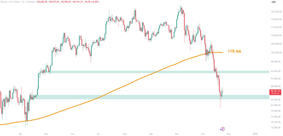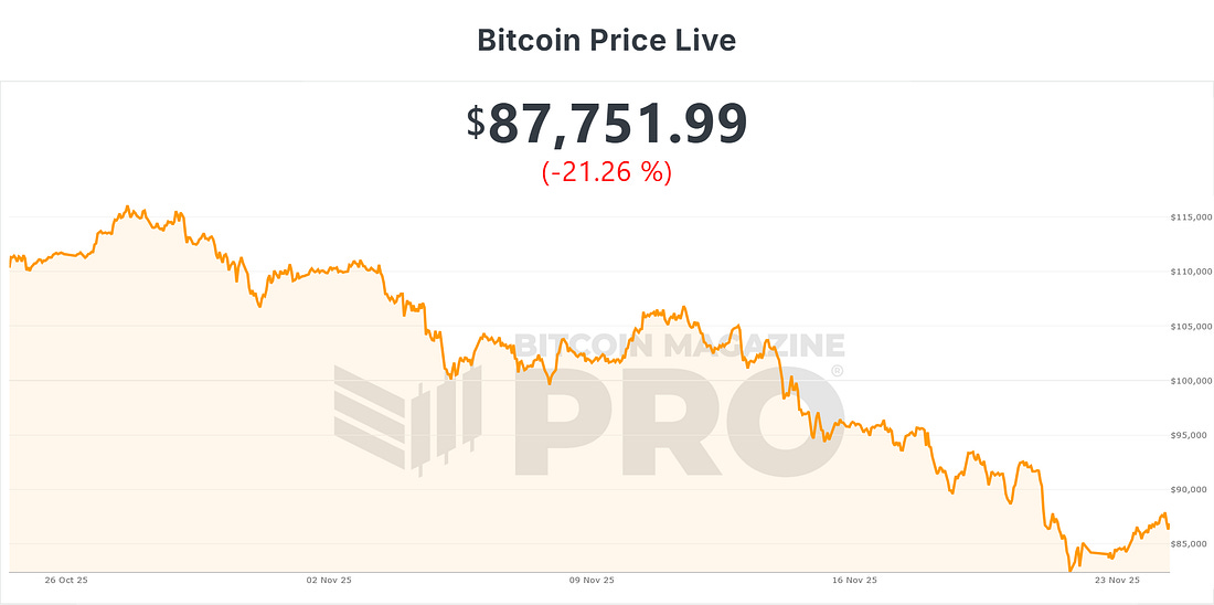 Pressure on StrategyMichael Saylor Defiant as MSCI Considers Kicking Bitcoin Treasury Giants Out of Global BenchmarksWhat’s HappeningPrice ActionLast week was another tough week for BTC as markets continued to sell off. There has been some relief over the weekend as BTC has stabilized in the $80k - $90k area. In total Bitcoin is down -21.26% over the past month. Figure 1: BTC price significantly down over the past month. As we have discussed in many Weekly Alpha updates, the 1yr moving average for Bitcoin has proven to be a key bull / bear line in the sand. If Bitcoin fails to trend above it, then conditions turn bearish. We saw this play out over the past couple of weeks. As soon as BTC price could not hold above the 1yr MA, it tumbled rapidly down towards $80,000. In last week’s Weekly Alpha, we highlighted two areas of potential support. BTC has now hit both of those areas, with the lower area holding for now, at least. It remains to be seen whether that is a bottom forming or just a local low. Figure 1: BTC bouncing off our key support level. The Big Story: Pressure on StrategyThe largest corporate holder of Bitcoin, Strategy, is standing firm amid mounting scrutiny from index provider MSCI Inc. over how such firms should be classified. MSCI is one of the world’s most influential index and analytics providers. What they say matters because trillions of dollars in global investment funds track their benchmarks, meaning their classification decisions can directly move markets. MSCI initiated a consultation in October 2025 on whether companies whose primary activities involve holding digital assets should remain eligible for inclusion in its global investable market indexes. The proposed rule signals that firms with 50% or more of total assets in digital-asset treasuries could be excluded. Analysts warn such a move could trigger forced outflows of billions of dollars from index-tracking funds and reshape how markets view the overlap between crypto strategies and conventional equities. Such a shift would impact many of the top Bitcoin Treasury Companies who have been working hard over the past 18 months to accumulate more Bitcoin. Figure 2: Bitcoin Treasury Leaderboard. Strategy CEO, Michael Saylor, insisted that the business is more than a “treasury vehicle,” noting it operates a substantial software division in addition to holding roughly 650,000 BTC on its balance sheet. The markets appear spooked as Strategy stock has been tumbling in recent weeks ever since it too lost its 1-year Moving Average, highlighting bearish conditions for Strategy. Figure 3: MSTR Stock Price and 1yr MA. The pullback means that despite an impressive performance since adopting its Bitcoin standard, the level of gains during that time is now lower compared to other stocks such as Nvidia. Figure 4: Strategy relative performance since its adoption of Bitcoin treasury strategy. Even though Strategy is currently included in indexes such as the NASDAQ: MSTR and MSCI USA/World benchmarks, in this climate, Strategy may face exposure to re-classification risk. The outcome will influence not only its stock but also the broader landscape of how companies with large Bitcoin holdings are regarded in mainstream indices. Treasury companies around the world will be watching the next moves of this situation very closely over the coming weeks and months. The Bitcoin Magazine Pro Team. Bitcoin Magazine ProFor more detailed Bitcoin analysis and to access advanced features like live charts, personalized indicator alerts, and in-depth industry reports, check out Bitcoin Magazine Pro. Make Smarter Decisions About Bitcoin. Join millions of investors who get clarity about Bitcoin using data analytics you can’t get anywhere else. We don’t just provide data for data’s sake, we provide the metrics and tools that really matter. So you get to supercharge your insights, not your workload. Take the next step in your Bitcoin investing journey:
