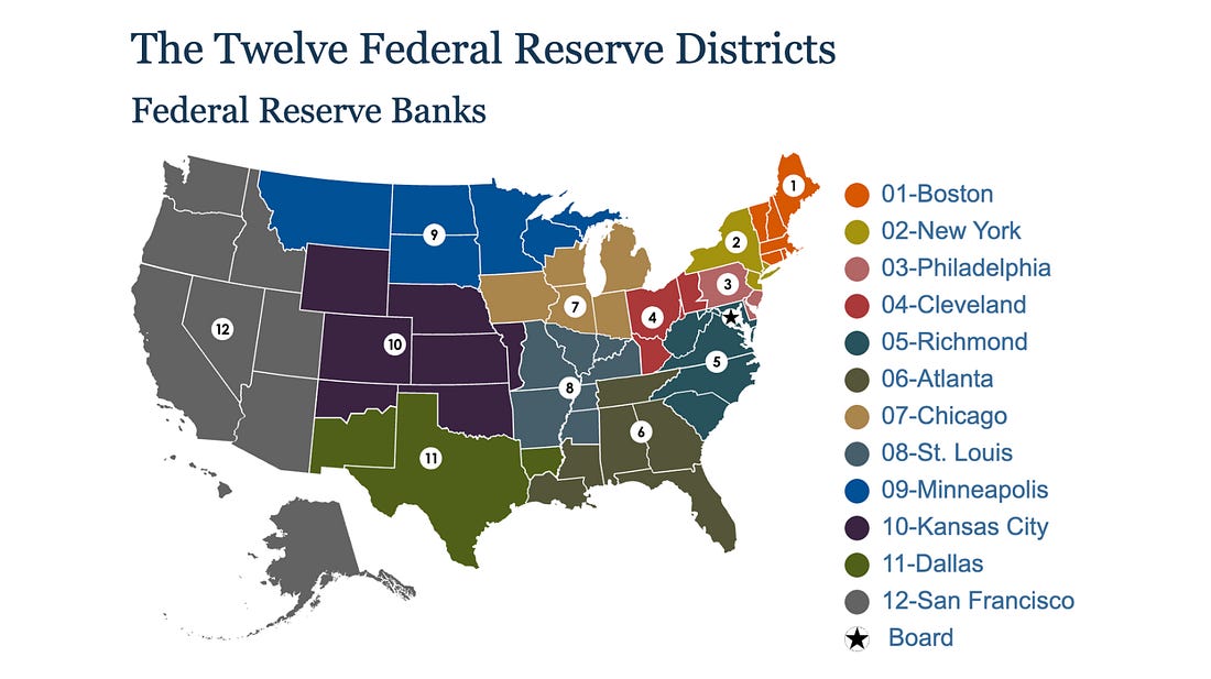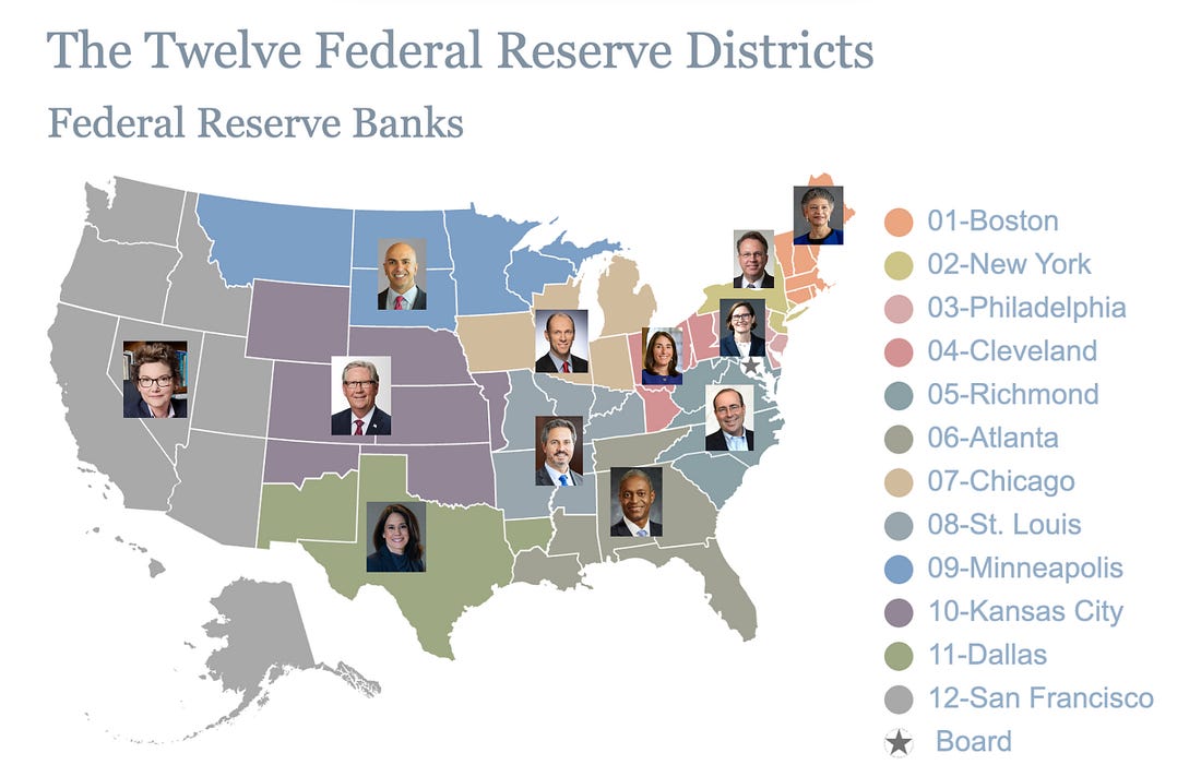 2. The Reserve BanksThere are 12 Reserve Banks across the US, each one covering its own individual region (chart below): Here is where each region is headquartered, alongside its President: