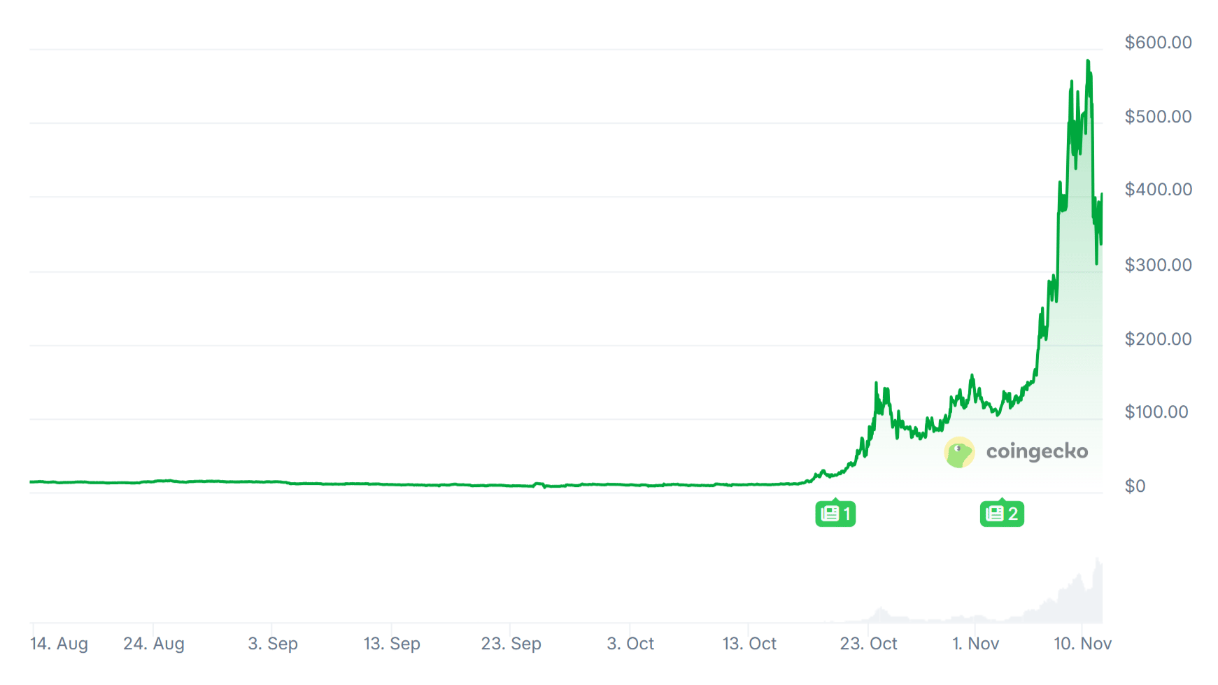 It's up ~240% on the weekly, ~392% on biweekly, and ~4100% on the monthly chart. It has also crashed 25% from yesterday.