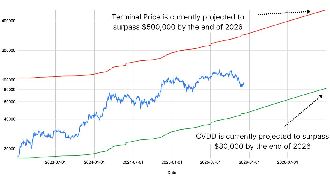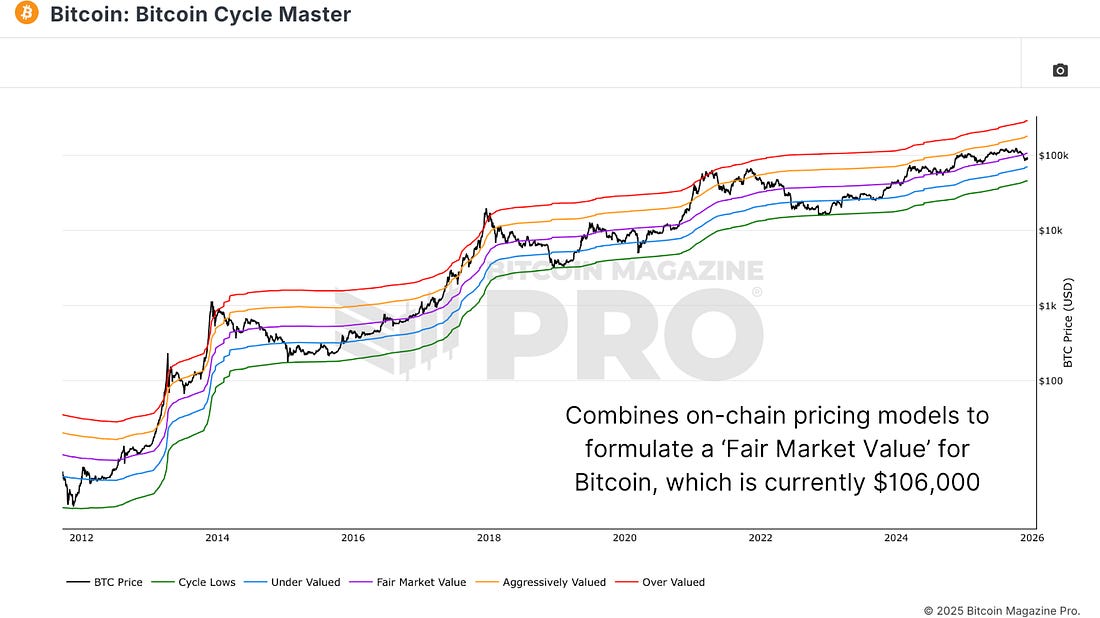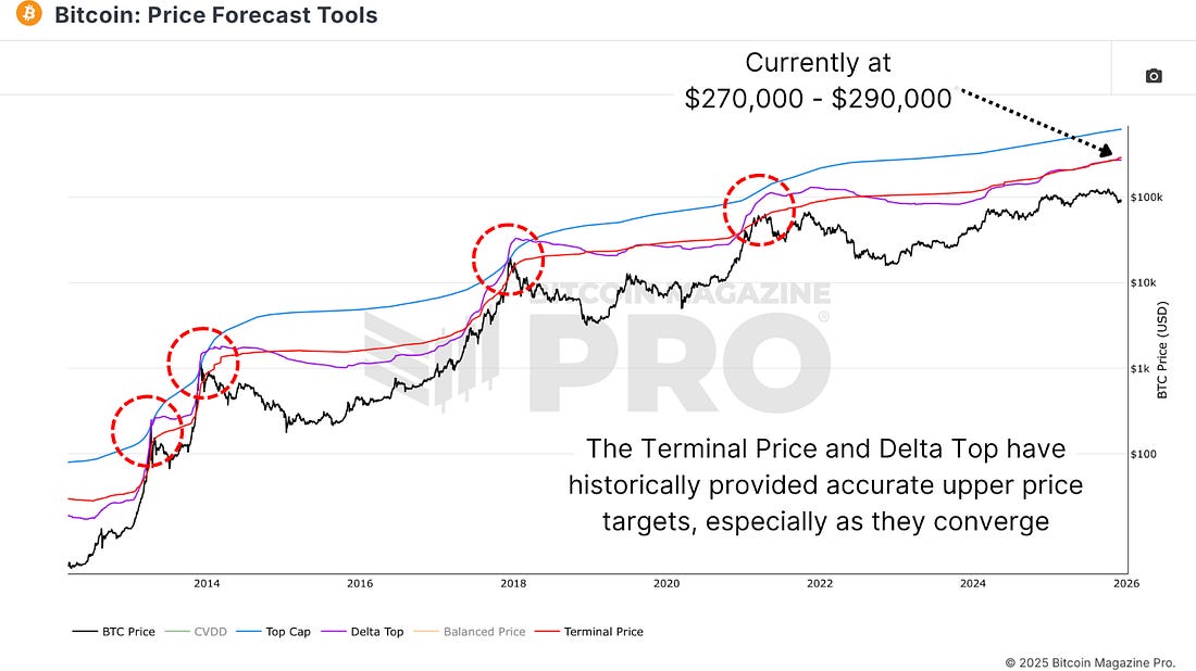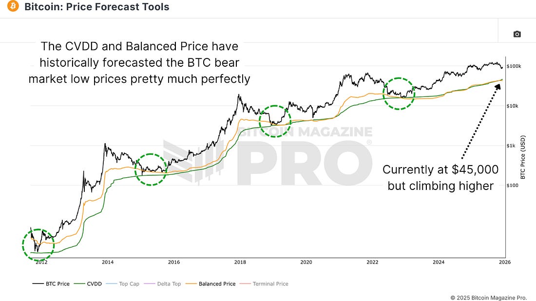 Bitcoin Price Forecast Tools and Cycle Valuation MetricsThe 6 Million Magic Number: How CVDD Has Called Every Bitcoin Bear Market Bottom Since 2009The Bitcoin Magazine Pro Price Forecast Tools chart provides a comprehensive framework for identifying potential price floors during bear cycles and forecasting upside targets based on on-chain fundamentals and network-derived data points. By aggregating multiple metrics, this methodology has historically called Bitcoin market cycle peaks and bottoms with remarkable accuracy. Can these tools continue to provide a basis for reliable BTC price forecasting over the next 12 months and beyond? CVDD & Balanced PriceThe Cumulative Value Days Destroyed (CVDD) metric has historically called Bitcoin price cycle lows almost to perfection across every cycle since Bitcoin’s inception. This metric begins with Coin Days Destroyed, a measure that weights Bitcoin transfers by the duration they were held before movement. For example, holding 1 Bitcoin for 100 days produces 100 coin days destroyed when transferred, while holding 0.1 Bitcoin for the same result requires 1,000 days of holding. Large spikes indicate that the network’s most experienced long-term holders are transferring significant amounts of Bitcoin. Figure 1: The convergence of the CVDD and Balanced Price with BTC price has historically aligned with bear market lows. The CVDD takes this one step further by measuring the USD valuation at the time of transfer rather than just the coin days destroyed quantity alone. This value is then multiplied by 6 million to produce the final metric. When examined across Bitcoin’s entire history, the CVDD has indicated bear market lows with accuracy extending across every cycle. Currently, the CVDD sits at approximately $45,000, though this level trends upward over time as the metric naturally evolves with new transfers and Bitcoin’s price appreciation. The Balanced Price metric complements this downside projection by subtracting the Transferred Price (its calculation methodology is explained later) from the Realized Price, the cost basis or average accumulation price for all bitcoin holders, providing another historically accurate bear cycle low signal. Top Cap, Delta Top, & Terminal PriceThe Top Cap metric begins with the all-time average cap, the cumulative sum of Bitcoin’s market capitalisation divided by the number of days Bitcoin has existed. This all-time weighted moving average is then multiplied by 35 to produce the Top Cap. Historically, this metric has been remarkably accurate for calling bull market peaks, though in recent cycles it has exceeded actual price action, currently projecting to a seemingly unattainable ~$620,000. The Delta Top refines this approach by using the realized cap. The realized cap currently stands at approximately $1.1 trillion. Delta Top is calculated by subtracting the average cap from the realized cap and multiplying by 7. This metric has been accurate historically, though it was slightly off during the 2021 cycle, and it is looking more likely that it will not be reached in the current cycle, currently sitting at approximately $270,000. Figure 2: Delta Top and Terminal Price metrics have frequently aligned with market tops. The Terminal Price metric provides another layer of sophistication. It calculates the Transferred Price, the sum of Coin Days Destroyed divided by the Circulating Bitcoin Supply, and multiplies this by 21 (the maximum Bitcoin supply). This produces a price level based on the fundamental assumption of total network value distributed across all 21 million Bitcoins. Historically, the Terminal Price has been one of the most accurate top-calling tools, marking previous cycle peaks nearly to perfection. This metric currently sits at approximately $290,000, not too far above Delta Top’s current value. Bitcoin Cycle MasterIntegrating all these individual metrics into a unified framework produces the Bitcoin Cycle Master chart, which combines these on-chain forecast tools for confluence. This has helped to identify where Bitcoin may be in a cycle, either close to bull or bear market highs, or oscillating around its ‘Fair Market Value’. Figure 3: The Bitcoin Cycle Master currently indicates a Fair Market Value of approximately $106,000. Examining the past two cycles demonstrates the utility of this framework. When Bitcoin trades above the Fair Market Value band, bull markets have historically entered exponential growth phases. When beneath this band, Bitcoin typically signals bear market conditions where defensive positioning and aggressive accumulation become appropriate strategies. Projecting ForwardBy extracting raw data from the price forecast tools and projecting the slope of both the CVDD and Terminal Price forward to the end of 2026, two scenarios emerge. The CVDD, which has moved at a predictable rate of change over the past 90 days, projects to approximately $80,000 by December 31, 2026. This level could represent a potential bear cycle floor, though Bitcoin has already traded beneath this level during recent downward moves, suggesting current prices may already offer compelling value. Figure 4: Extrapolating the CVDD and Terminal Price metrics across 2026 provides a considerable range for potential BTC price action. The Terminal Price, extrapolating its current upward trend, could reach over $500,000 by the end of 2026, though this projection could only be a realistic outcome with a bullish macro environment with significant liquidity injections and broad realization of Bitcoin’s fundamental value proposition. ConclusionThese Bitcoin price forecast tools, formulated using on-chain fundamental and network-derived data points rather than psychological levels or traditional technical analysis applicable to equities and commodities, have historically provided exceptional accuracy in calling market cycle peaks and bottoms. Forecasting based on their current values suggests a potential bear cyc