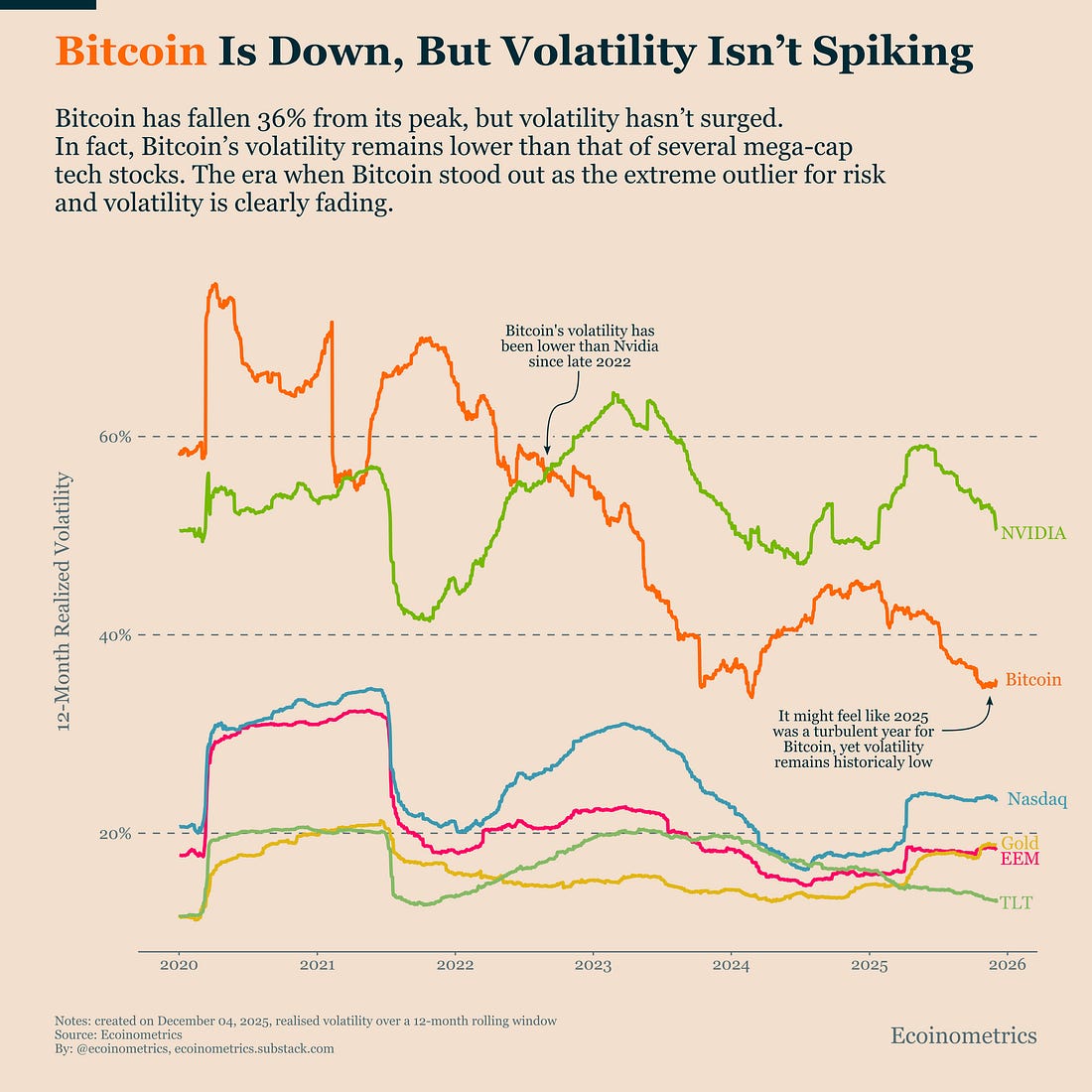 These charts sit in different corners of the market, but together they highlight what investors should really pay attention to right now: flows, stability, and structural risk. Bitcoin’s flows are turning, its volatility remains muted despite drawdowns, and the U.S. debt is growing rapidly at a time when funding costs are elevated. Together, they define the macro setting investors must account for today. In case you missed it, here are the other topics we covered this week: Bitcoin Market Monitor - Key Drivers in Ten Charts: Get these professional-grade insights delivered to your inbox: Bitcoin’s Recovery Supported By A Turn In ETF FlowsThis is something we’ve repeated many times: don’t look at Bitcoin’s price action without checking whether it is consistent with the trend in ETF flows. On monthly time scales, the relationship between Bitcoin’s returns and net ETF flows is extremely strong. It remains one of the most reliable models we’ve developed. And the model makes one point very clear: before Bitcoin can establish a solid support level, we need to see a U-turn in the 30-day rolling ETF flows. Outflows don’t need to flip positive right away, but they do need to stop accelerating to the downside. Luckily, that’s what is happening now. With the end of the latest sequence of heavy outflows, rolling flows are forming a bottom. The pattern looks similar to what we observed in March earlier this year. While that doesn’t guarantee an immediate rebound, if that trend continues, it meaningfully reduces the odds of another leg lower. It is worth observing that, over the last two years, ETF flow bottoms tend to be sharp. Once the U-turn begins, the improvement usually doesn’t drag on for weeks, flows climb back up fast. That’s why monitoring the slope of the rolling flows often gives a more timely signal than looking at Bitcoin’s price directly. On Wednesday we ran simulations based on our ETF flows model to map out possible scenarios. Those scenarios point to an encouraging setup: rising flows, Bitcoin’s price to form a strong base. No Volatility For Bitcoin Despite A Turbulent YearWe’re almost at the end of the year, and looking back, it’s hard to argue that 2025 was smooth sailing for Bitcoin. We saw multiple new highs, but also two sizeable drawdowns. Market sentiment kept oscillating between risk-on and risk-off, which made the whole year feel unsettled. So in the big picture, it’s fair to call 2025 a turbulent year. Yet Bitcoin’s volatility has been moving in the opposite direction. It has been declining all year, and even during the most recent pullback, realized volatility hasn’t spiked. Since late 2022, Bitcoin has actually been less volatile than several mega-cap stocks with similar market caps, including Nvidia. A few years ago, that would have sounded unrealistic, but it’s now the norm. This shift confirms that Bitcoin’s price behaviour is being shaped more by structural forces than by short-term trader sentiment. Institutional adoption and Bitcoin’s integration into the broader macro landscape are key reasons why its volatility is normalizing. Now importantly, lower volatility doesn’t mean downside risk disappears. It simply means that the pace of repricing is much slower than it used to be and that deeper forces such as flows and correlations are doing more of the work. That’s why it has become harder to rely on older Bitcoin market patterns to interpret today’s behaviour. The market’s state is now better understood through the lens of capital flows, macro correlations, and positioning rather than the cyclical playbooks of the past. The U.S. Debt Isn’t Slowing DownHere’s a topic that isn’t front and centre in U.S. politics these days: the U.S. debt. While most people have stopped paying attention, the federal debt has increased by $2.1 trillion over the last 12 months. That’s not an outlier. It’s almost exactly in line with the average pace of the last decade, which comes in at $1.9 trillion per year. And as the chart shows, this latest increase is happening at a time when the average interest rate on the debt is at a ten-year high. In other words, borrowing is accelerating even though it’s more expensive. If you were looking for one political reason behind the Federal Reserve’s considering to cut interest rates, you don’t need to look much further than this. At the same time, the Fed has reached the end of its balance sheet reduction program. From here, they will begin buying Treasuries again, slowly at first and only to replace bonds that mature. But that shift leaves the door open for more active support if funding conditions tighten. This is a slow-moving train wreck, which is exactly why it’s easy to overlook. But step by step, it pushes the U.S. closer to a regime of fiscal dominance, where the central bank is effectively forced to finance government deficits on a recurring basis. That’s a major long-term risk. It explains why gold has been so strong in recent years and why Bitcoin has such compelling long-term potential as a hard asset. It’s not the headline narrative right now. But it’s something to keep in mind because some investors may prefer to hedge this risk while Bitcoin is still relatively cheap. That’s it for today. Thanks for reading. Cheers, Nick P.S. Every week, our team conducts extensive research analyzing market data, tracking emerging trends, and creating professional-grade charts and analysis. Our mission: Deliver actionable macro and Bitcoin insights that help institutional investors and financial advisors make better-informed decisions. Ready for institutional-grade research that puts you ahead of the market? Click below to access our premium insights. You're currently a free subscriber to Ecoinometrics. For the full experience, upgrade your subscription. |