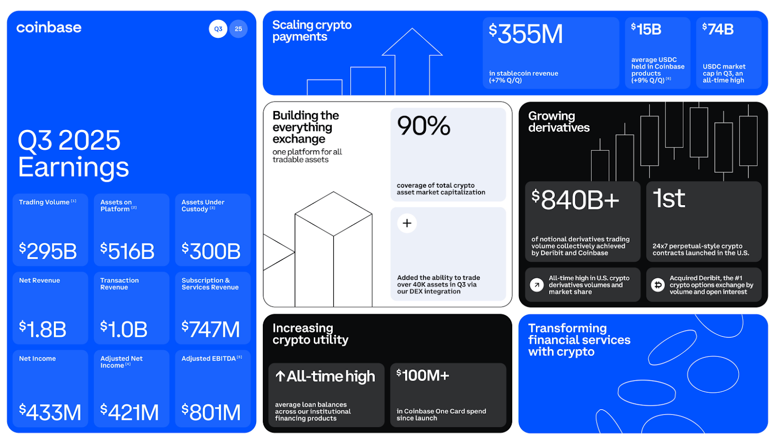 COINCoinbase is also building a super app — but with a distinctly crypto-native flavor and a second layer of ambition underneath. On the front end, Coinbase wants to be the single place users manage their financial life on and offchain, though mostly still the former. The December System Update made this explicit: commission-free stocks and ETFs with 24/5 trading, prediction markets via Kalshi, and continued onchain integrations for instant access to millions of tokens. Add in direct deposits, high-yield savings via USDC lending rates, borrowing up to $5M against BTC (and up to $1M on ETH), and spending via debit to earn crypto rewards — the super app pieces are falling into place. But Coinbase isn't just building for its own users. The grander vision seems to be turning every product it offers into plug-and-play infrastructure that powers everyone else coming onchain. The thesis here is that TradFi incumbents like JP Morgan, Fidelity, and Morgan Stanley won't build their own crypto infrastructure. They'll outsource to Coinbase because it's cheaper, they lack the technical expertise, and Coinbase has 13 years of proven security. Over 200 institutions already use Coinbase's Crypto as a Service platform — meaning users might trade crypto on a traditional bank's front end while Coinbase handles everything behind the scenes. This infrastructure focus extends across the business. Coinbase holds the Bitcoin and Ethereum for most major spot ETFs — a near-monopoly position in crypto custody. They're letting institutions launch their own stablecoins using Coinbase infrastructure. The Echo acquisition brought both fundraising and token issuance in-house. And the Deribit acquisition captured roughly 90% of Bitcoin options open interest. The revenue mix reflects this dual focus. Q3 2025 revenue came in at $1.8B, with subscription and services hitting a quarterly record of $747M (41% of total). Stablecoin revenue from the USDC partnership contributed $354.7M, up 44% year-over-year. Staking brought in $185 million. Custody fees reached ~$143M, driven by record assets under custody exceeding $300B from ETF inflows. Where Robinhood's grander vision is becoming the premier place to do everything related to one's financial life, Coinbase is playing two games at once: building the best crypto super app for its own users while simultaneously becoming the backend that powers everyone else's crypto offerings. The Crypto Strategy DivideBoth companies see crypto as central to their super app ambitions, but their approaches reflect their origins. Robinhood treats crypto as another asset class alongside stocks and options. It's a revenue driver that fits neatly into the existing product suite. The Bitstamp acquisition ($200M) provided global licenses and institutional infrastructure. Tokenized equities — roughly 800 live in the EU, including private companies like OpenAI and SpaceX — expand offerings. The real test will be Robinhood Chain’s success, which should make many of these tokenized equities more versatile (i.e. loans), though we still have few details on the extent of “DeFi” or other onchain activities that the chain will support. Besides this, Robinhood also faces more immediate limitations like token selection. In the U.S., fewer than 50 tokens are available to users on the platform, compared to Coinbase's essentially infinite offerings indirectly (via Jupiter and Base) and 200+ directly supported tokens. Coinbase's crypto approach obviously differs, offering everything from its own L2 to the slew of products mentioned in the last section. It has set the standard for “crypto-specific” offerings, so much so that it looks to be transitioning to focusing now on building the rails for others to use. We have x402 which intends to be the industry standard for Agent to Agent (A2A) payments, as well as Coinbase announcing they’d offer a “Stablecoin-as-a-Service” platform for companies to create whitelisted stablecoins while Coinbase manages all the technical complexities. From issuance, through trading, to custody, Coinbase sits at every stage of the asset lifecycle. What's Coming in 2026Both roadmaps are aggressive — and increasingly overlapping. Coinbase's December 2025 System Update pushed hard into Robinhood’s territory with stock and ETF trading beyond traditional market hours (thanks to tokenization), as well as the announcement of stock perpetuals coming next year. Native Kalshi integration brought prediction markets. And then you have Coinbase Business and Coinbase Tokenize, the former being a crypto-powered all-in-one business operations platform and the latter being an “end-to-end” platform for institutional tokenization. Robinhood's 2026 plans go deeper into crypto infrastructure. Tokenized equities will gain 24/7 trading via Bitstamp in early 2026, then become withdrawable and composable across DeFi by late 2026. On prediction markets, Robinhood is moving from being a distribution partner to launching its own markets. The platform hopes to offer crypto staking, pending regulatory approval. And it also has ambitions to “socialize” trading via Robinhood Social, an upcoming feed where traders post alongside their actual trades and P&L. And, of course, we have Robinhood Chain. The challenge for Robinhood Chain will be building a developer ecosystem — territory where Base already has established momentum. Crypto-native culture is hard to manufacture. The Bottom LinePerhaps the better framing here is "COIN and HOOD" rather than "COIN vs HOOD." These companies occupy different lanes that touch but don't fully overlap. Robinhood is as much a “super app” play as it is a demographic wealth transfer play. With 75% of users under 44 and a full-stack neobank keeping assets on platform, the company is positioned to be the new hub for depositing, spending, investing, and speculating. Coinbase is the technology shift play. The bet is that the global economy moves oncha