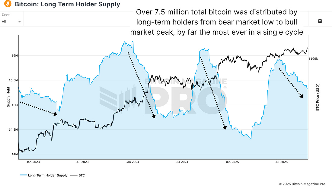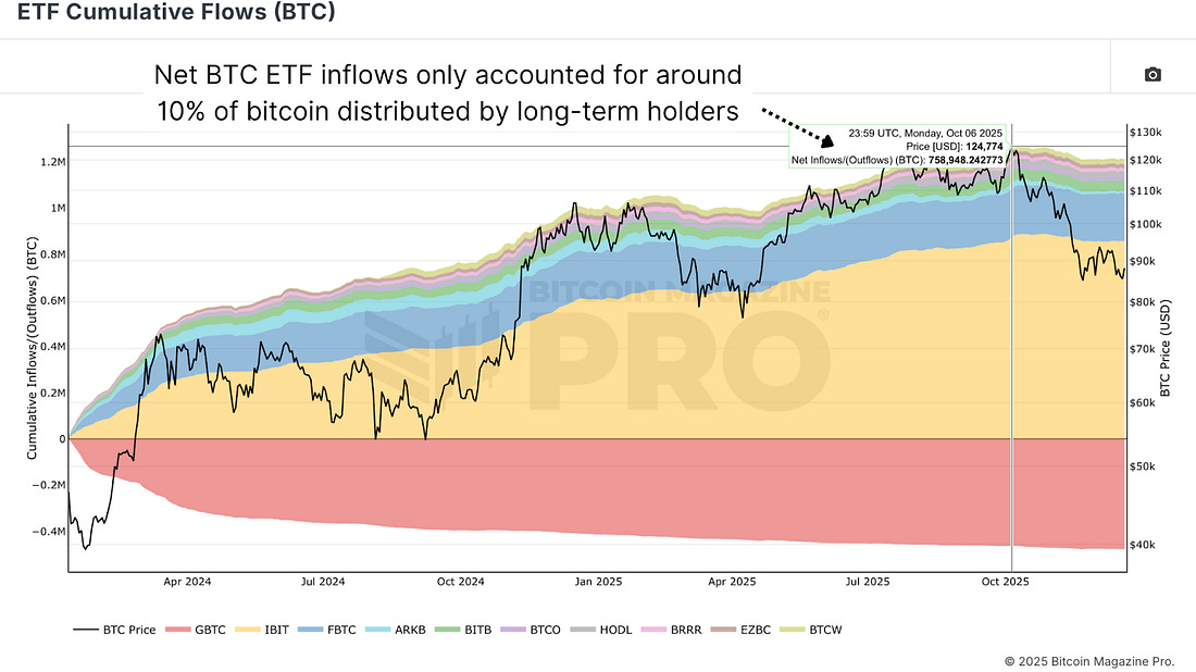 Institutional Accumulation Amid Long-Term Holder SellingData shows Bitcoin’s downturn stemmed from historic long-term holder selling, not institutional manipulation—ETFs absorbed less than 10% of supply.Bitcoin’s underwhelming price performance throughout 2025 has generated conspiratorial narratives about institutional manipulation and price suppression through centralized custodians. Yet the data reveals a far more straightforward explanation: supply and demand economics. Over one-third of all Bitcoin in existence was cumulatively distributed by long-term holders throughout this cycle, creating such massive selling pressure that Bitcoin was always going to struggle. Long-Term Holder DistributionThe Long-Term Holder Supply chart shows that, cumulatively from the cycle lows to the October 6th peak, long-term holders distributed approximately 7.5 million Bitcoin. This represents an unprecedented flush of supply onto open markets, far exceeding what any institutional buyer could reasonably absorb without exponential price appreciation. Figure 1: From the bear market low to the October peak, cumulative distribution from long-term holders reached approximately 7.5 million BTC. For comparative context, net Bitcoin ETF Cumulative Flows since approval total only around 700,000 Bitcoin (though gross holdings exceed 1.2 million, with many representing Grayscale GBTC transfers). Public Bitcoin Treasury Companies have accumulated roughly 1 million Bitcoin. Even combining all institutional channels, these accumulations represent only ~25% of the long-term holder distribution, meaning the vast majority of this supply found buyers among retail participants. Figure 2: At around 700,000 BTC, net cumulative ETF inflows account for less than 10% of the bitcoin distributed by long-term holders. Institutional “Manipulation”The conspiracy narrative that institutions deliberately suppressed Bitcoin to accumulate at lower prices collapses under scrutiny. If institutions were controlling the market, they would have needed to absorb all 7.5 million distributed Bitcoin while simultaneously pushing prices lower, an economic impossibility. Instead, the data shows something far more benign: institutions have been consistent accumulators despite falling prices, while retail-driven selling pressure has dominated. Figure 3: In BlackRock ETF inflow terms, their iShares Bitcoin Trust (IBIT) ETF out-ranks the Nasdaq (QQQ) and Gold (GLD). BlackRock’s iShares Bitcoin Trust (IBIT) ETF provides telling evidence. According to BlackRock’s leaderboard data, IBIT ranked sixth in total inflows among all ETFs on the platform, ahead of the Nasdaq (QQQ) and even Gold (GLD). This occurred despite Bitcoin declining for the year while all other funds saw positive returns. Whale ConcentrationDespite massive volumes of Bitcoin being transferred, these distributions originated from relatively few participants. This concentration has been decreasing over time, a genuinely positive development for Bitcoin’s decentralization. Rather than a small number of OG whales controlling a large percentage of the supply and threatening price control if only a few decide to sell, Bitcoin now sees distribution across hundreds of thousands more holders. This requires significantly broader consensus to create equivalent supply pressure, reducing the risk that a few concentrated holders can dictate market movements. Figure 4: Fewer whales distributing at the cycle peak, and the dilution of whales generally can only be positive for the market structure. ConclusionBitcoin’s 2025 performance reflects straightforward supply-and-demand mechanics, not institutional manipulation. Vast volumes of Bitcoin hit markets as long-term holders took profits, as liquidity like never before flowed into the market. As a result, the asset’s distribution improved materially as it transitioned away from whale-concentrated holdings. This is precisely the evolution required for Bitcoin to function as intended, as a decentralized, difficult-to-manipulate monetary asset serving as a store of value and medium of exchange. For a more in-depth look into this topic, watch our most recent YouTube video here: Institutions Manipulating Bitcoin? [Hint: No & It’s Bullish] Matt Crosby Director of Research & Analytics - Bitcoin Magazine Pro Bitcoin Magazine ProFor more detailed Bitcoin analysis and to access advanced features like live charts, personalized indicator alerts, and in-depth industry reports, check out Bitcoin Magazine Pro. Make Smarter Decisions About Bitcoin. Join millions of investors who get clarity about Bitcoin using data analytics you can’t get anywhere else. We don’t just provide data for data’s sake, we provide the metrics and tools that really matter. So you get to supercharge your insights, not your workload. Take the next step in your Bitcoin investing journey: