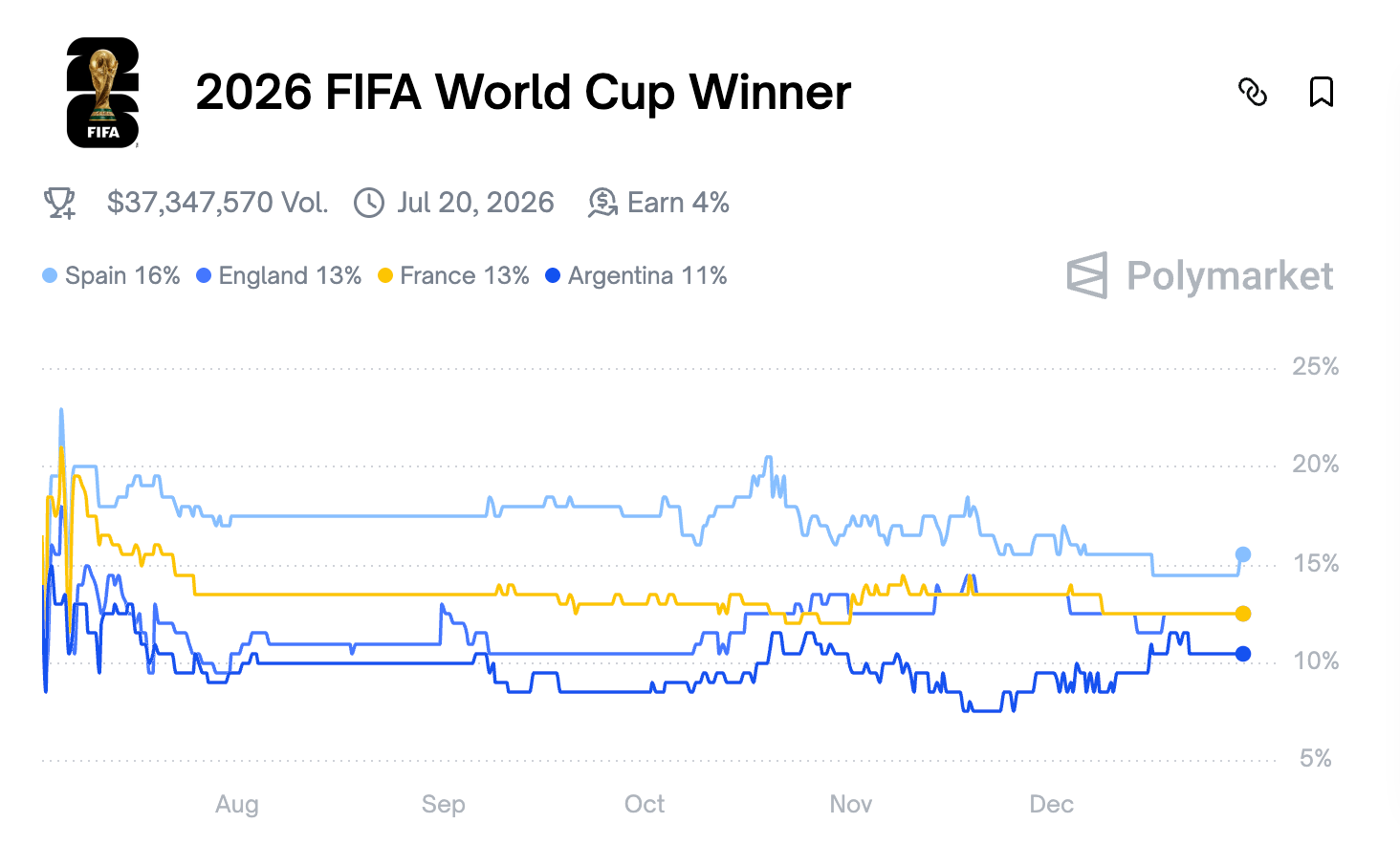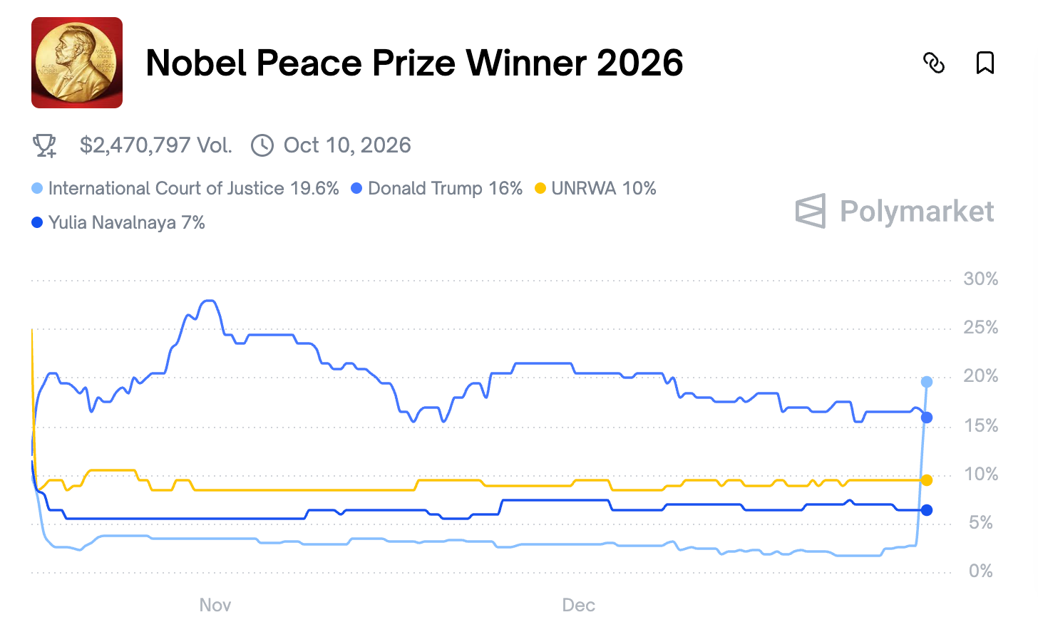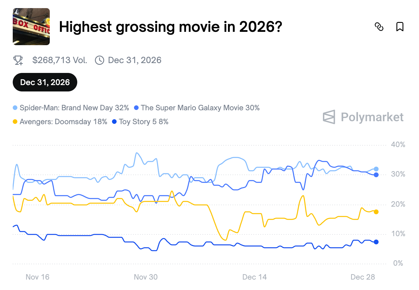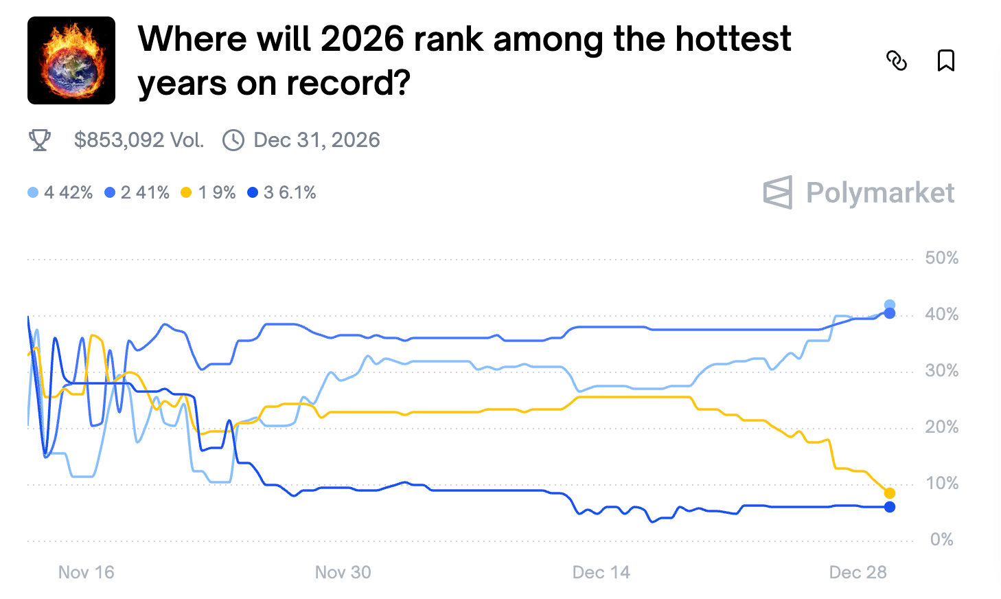 Sponsor: Uniswap CCA — Fair onchain price discovery for token launches. . . . ANALYSIS What Prediction Market Users are Predicting for 2026 Prediction markets got their mainstream moment in 2025. While the use case got its major validation during the 2024 U.S. general election, it was cemented in 2025 when regulatory clarity unlocked a new wave of novel prediction markets (namely those centered around sports gambling). While you've likely already been inundated by what your favorite podcasters, writers, and influencers are predicting for the future, today we're turning to top prediction market events for 2026 to see what the hive mind of bettors believe will go down in the new year. Here are ten Polymarket bets worth watching as we prepare to ring in the new year. 👇 1️⃣ FIFA World Cup WinnerThe premier invitational men's soccer (football) tournament will be the largest in tournament history this year, hosting 48 teams with play scattered across the United States, Canada, and Mexico. Winning this tournament means navigating an expanded format, surviving a longer path through group and knockout stages, and proving soccer superiority on a global stage with literally billions of people watching. According to Polymarket, Spain is projected as the current favorite to win the World Cup with 16% odds, followed closely by England, France, and Argentina. 2️⃣ Super Bowl ChampionshipSuper Bowl LX will crown the champion of the NFL for the 2025-2026 season on Sunday, February 6, 2026. The biggest single-day sporting event in the United States, the Super Bowl combines elite American football with a cultural spectacle. The Los Angeles Rams rank as the current favorite to win the Super Bowl among bettors on Polymarket, with a 14% chance, followed by the Seattle Seahawks, Philadelphia Eagles, and Denver Broncos. 3️⃣ Nobel Peace Prize WinnerThe Nobel Peace Prize is one of the world’s most prestigious international awards, honoring individuals or organizations that have made outstanding contributions to the promotion of peace. Awarded each December in Oslo, the six Nobel Prizes reflect Alfred Nobel's desire to recognize individuals for outstanding efforts in: physics, chemistry, physiology or medicine, literature, economics, and peace. Laureates are announced in October, and receive a medal, personal diploma, and cash award. With a 19% chance, the International Court of Justice is the current rising favorite on Polymarket to receive the Nobel Peace Prize. U.S. President Donald Trump, The UNRWA (United Nations Relief and Works Agency for Palestine Refugees) and Russian political opposition leader Yulia Navalnaya are close behind. 4️⃣ Warner Bros. AcquisitionWarner Bros. is an influential entertainment studio that has shaped popular culture for over a century. Founded in 1923, the studio is behind a number of iconic franchises including: Harry Potter, The Lord of the Rings, Looney Tunes, and Game of Thrones. This month, streaming service Netflix announced that it had entered into an agreement with Warner Bros. Discovery, Inc. to acquire the Warner Bros. part of its business – including its film and television studios (HBO Max and HBO) – for approximately $82B in a cash and stock transaction. Although the deal has yet to close and must contend with a hostile takeover bid from competitor Paramount Skydance, the odds that Netflix emerges victorious have settled around 24% in recent weeks. 5️⃣ Highest Grossing MovieThe superlative of the "highest grossing movie" will be awarded to the new film that generated the most revenue at global box offices. Spider-Man: Brand New Day is the current leader on Polymarket, with 32% odds that it will win the title of highest grossing movie in 2026. It remains in close contention with The Super Mario Galaxy Movie and Avengers: Doomsday. 6️⃣ Fed Rate CutsThe Federal Reserve is believed by some to be the most important financial institution in existence. The institution aims to control the price of money by altering the "Federal Funds" benchmark interest rate. Today, the Fed is targeting overnight interest rates between 3.50% and 3.75%, but looking ahead to 2026, Polymarket bettors overwhelmingly expect further easing. The highest-probability outcome points to 0.50% in cumulative cuts, though 10% of the bettors still believe the Fed could slash rates by as much as 1.25%. 7️⃣ Balance of PowerFollowing 2024's general election, Republicans took control of both federal legislative chambers (the House and the Senate). American voters will have the opportunity to reshape this balance of power during next year's midterm elections, at which time control over Congress is once again up for grabs. These elections will determine which party sets the legislative agenda, oversees the executive branch, and influences the direction of U.S. policy heading into the next presidential cycle. In 2026, it appears that Americans will seek out change from the current mono-party political regime. The odds of a Democrat sweep now lie at 33%, and markets are assigning a 48% chance that the party reclaims control of the House. 8️⃣ Global TemperatureGlobal temperatures have climbed relentlessly over the past decade, with recent years consistently challenging historical heat records. Against this backdrop, 2026 is shaping up as another critical data point and prediction markets are closely watching to see whether the year will rank among the hottest ever recorded. Polymarket speculators are bracing for even more extreme heat in 2026, assigning a 38% chance that it ranks as the fourth hottest year of all time and a 9% chance that it sets a new record, based on NASA’s Global Land–Ocean Temperature Index. 9️⃣ U.S. RecessionFears of a U.S. recession have loomed large over markets for years. While the economy has so far avoided a hard landing, slowing growth and inflation continue to fuel uncertainty about the durability of persistent economic expansion. In 2026, 