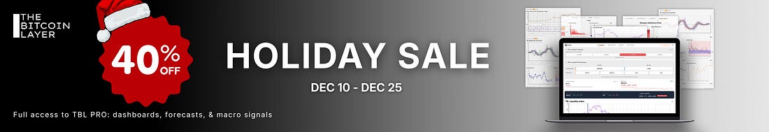 If you want clarity on what 2025 really meant for bitcoin—and how to think about the road ahead—this is the event. Wednesday, Dec 17 at 1 PM CST — online, free to attend. Secure your Bitcoin this holiday. 21% off all Blockstream Jade devices. Our videos are on major podcast platforms—take us with you on the go! Keep up with The Bitcoin Layer by following our social media! TBL Liquidity IndicatorThis past week, our TBL Liquidity indicator adjusted upwards based on incoming data. For those of you who are new, our indicator is two-sided in nature, meaning that it uses past and future data to find local peaks and troughs in short-term liquidity. Before we keep going with the article, we want to wish everyone some Happy Holidays! We want to show the world everything we’ve built this year for our TBL Pro members, and give you the chance to get full access at a 40% discount on annual subscriptions through Christmas. As a TBL Pro member, you’ll get access to: