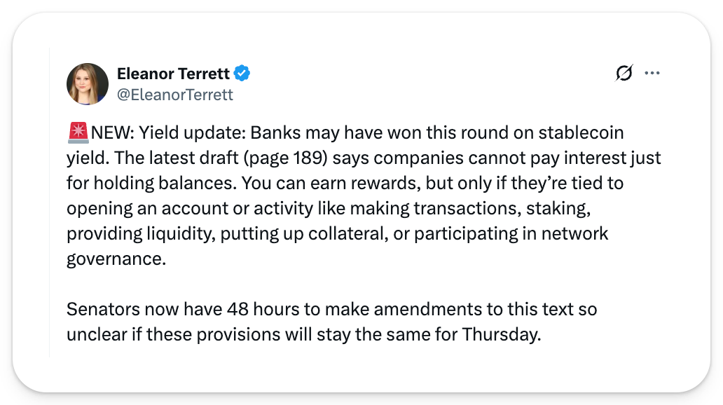 📸 Daily Market Snapshot: ETH and BTC thundered back after a rough week of losses, showing some of the biggest green price candles since October's liquidation meltdown. | Prices as of 6pm ET | 24hr | 7d | | Crypto $3.26T | ↗ 6.0% | ↗ 2.2% | | BTC $95,760 | ↗ 5.3% | ↗ 2.5% | | ETH $3,334 | ↗ 8.0% | ↗ 1.7% | . . . ANALYSIS 5 Highlights from the Senate's Much-Hyped Crypto Market Structure Draft Bill The crypto market may finally be getting something it has desperately wanted – codified market structure – courtesy of the Digital Asset Market Clarity Act (released overnight) which has earned bipartisan support thanks to some very noteworthy concessions regarding the future of crypto in America. The 278-page text – the result of months of fraught negotiations between Senate Republicans and Democrats (and industry lobbyists) – establishes a regulatory framework that would split digital asset oversight between the SEC and CFTC agencies. The crypto community is sure to have some mixed takeaways on some of these provisions. Case in point, Paradigm policy head Justin Slaughter called the bill "a big win for the Democratic Members on [the Senate Banking Committee]," and something that could have passed under a Biden administration. Today, we're exploring five key provisions of the Digital Asset Market Clarity Act (DAMCA) to better understand how the future of crypto market structure clarity might evolve. 👇 1️⃣ No Stablecoin YieldUnder the Digital Asset Market Clarity Act, stablecoin issuers will be prohibited from distributing yield back to passive token holders. Title IV of DAMCA, which lays out the rules of the road for how regulated banking institutions can interact with digital assets, will prohibit stablecoin issuers (as defined by the GENIUS Act) from making interest payments to holders. While DAMCA will allow stablecoin issuers to distribute rewards tied to actions, such as account opening incentives and cashback rewards, the fact remains that protecting stablecoin yield had previously been a firm "red line" for the crypto industry. Heavy restrictions on stablecoins risk putting crypto-native issuers at a perpetual disadvantage against the banking sector. Still, many key crypto players – including Coinbase – have surprisingly continued to back the bill's language on stablecoin yield prohibition, viewing it as the least favorable language they could tolerate without derailing the bill's momentum. 2️⃣ Commodity ClarityThe Lummis-Gillibrand Responsible Financial Innovation Act of 2026 – Title I of DAMCA – would amend the Securities Act of 1933 to clarify when crypto network tokens transition from securities into commodities. According to this section of DAMCA, the SEC will publish formal guidelines within 360 days of its enactment for when individual persons who initially offered, sold, or distributed tokens and the largest recipients of those tokens are "jointly and severally" considered to be a token's issuer. Title I establishes expansive regulations over anyone who sold, controlled, or caused the initial distribution, problematically extending liability to related persons even if they did not receive the largest share in a token. It also extends SEC jurisdiction over tokens issued by foreign governments, tokens issued without a company structure, and majority American-owned tokens. The section would provide exemption carveouts for a network token to be treated as a non-security (i.e.; a commodity) when they have no attached financial rights, such as participation in profit sharing or implied ownership interest. To certify their non-security status, the burden will fall on network tokens themselves; asset issuers must submit written certifications to the SEC demonstrating that their token is not a security. The Commission will then have 60 days to deny the certification. If projects do not or are unable to certify their non-security status with the SEC, they will be legally required to publish semiannual mandatory disclosures, the obligations for which occupy 12 pages of DAMCA alone. Projects with over $25M in gross proceeds must also publish audited financial statements, prepared by an independent public accountant. Fortunately, Title I of DAMCA will not be applied ex post facto, meaning individuals who offered, sold, or distributed covered tokens before the bill's enactment need not fear retroactive liability. 3️⃣ DeFi RegulationTitle III of DAMCA addresses the decentralization part of decentralized finance, outlining when crypto projects are – and are not – considered truly "decentralized." According to this section, a decentralized protocol allows users to make financial transactions in accordance with an "automated rule or algorithm that is predetermined and non-discretionary" that does not rely on a person other than the user to maintain custody or control over their digital assets. The designation of "non-decentralized finance trading protocol" would apply to any protocol in which: a person or group of persons has the ability to control or alter the functionality of an application; the application does not operate based solely on code; and a person or group of persons can restrict, censor, or prohibit user activity. Non-decentralized protocols will need to comply with the Securities Exchange Act of 1934 and Bank Secrecy Act, imposing novel registration, conduct, disclosure, record-keeping, and supervision requirements. While this chapter may homogenize the application of securities laws across technologies and protect the public interest, it may also capture non-immutable smart contract protocols with even minimal operator control in its drag net (including those designed around multi-signature technology or trusted encryption environments). Fortunately, Title III does include a sizable carveout that affords protocol "security councils" the ability to respond to incidents (like hacks) with "pre-defined, temporary rules-based cybersecurit