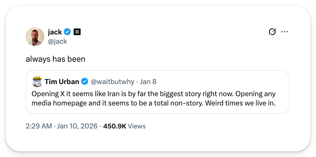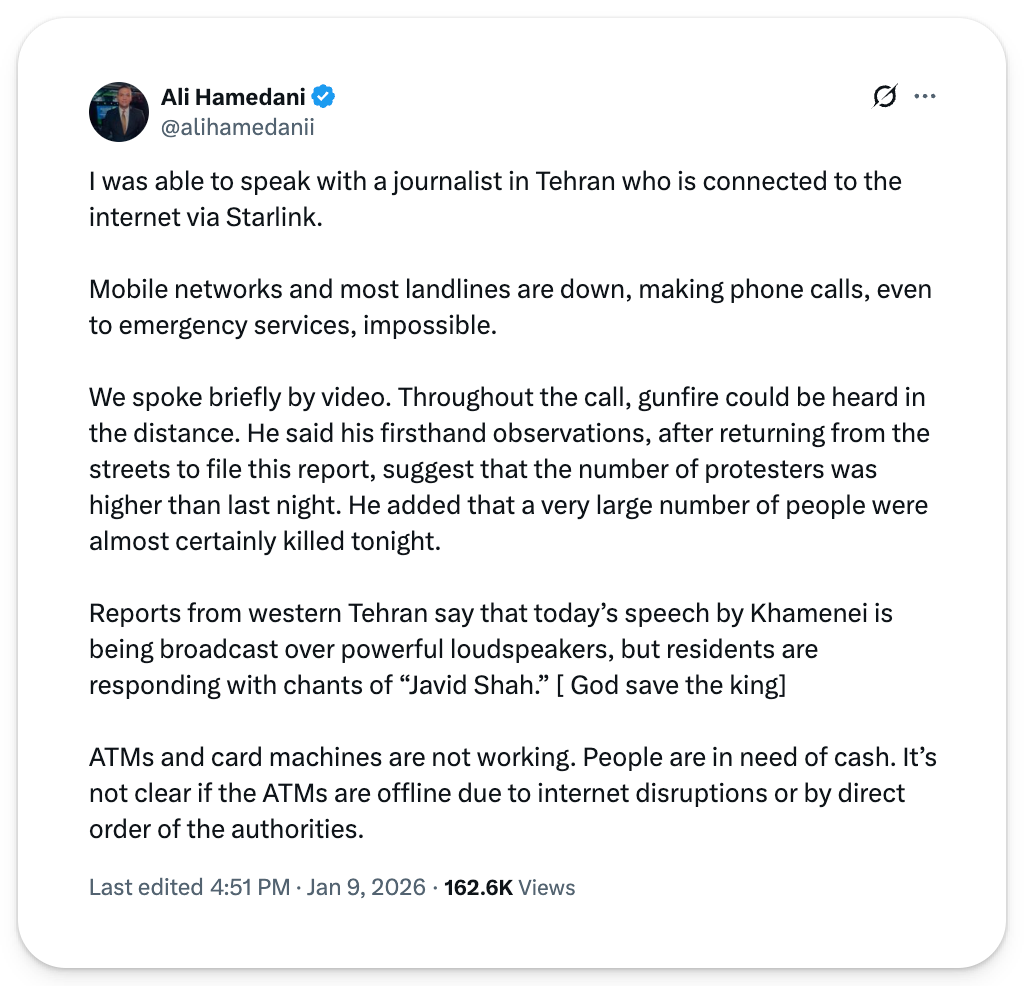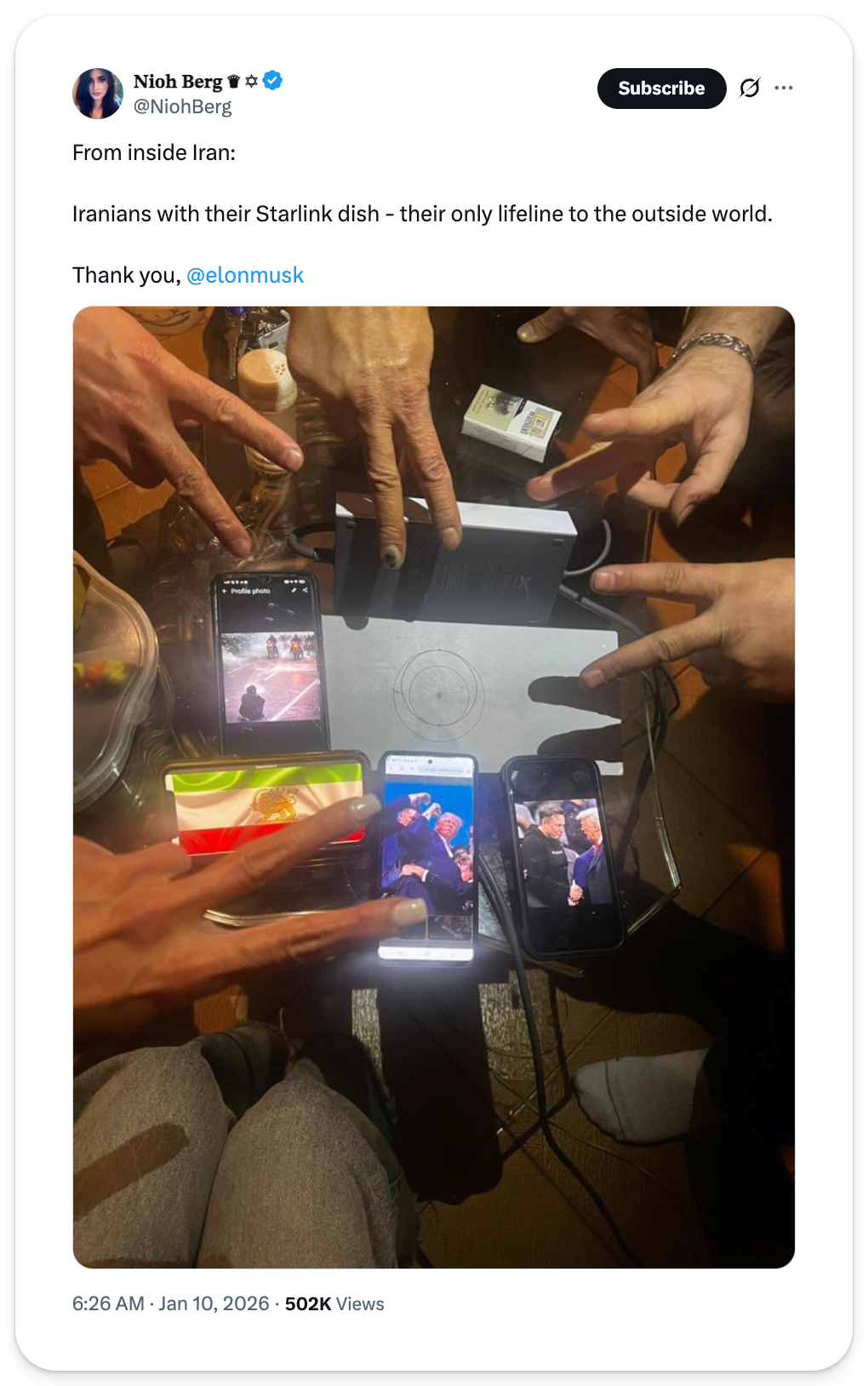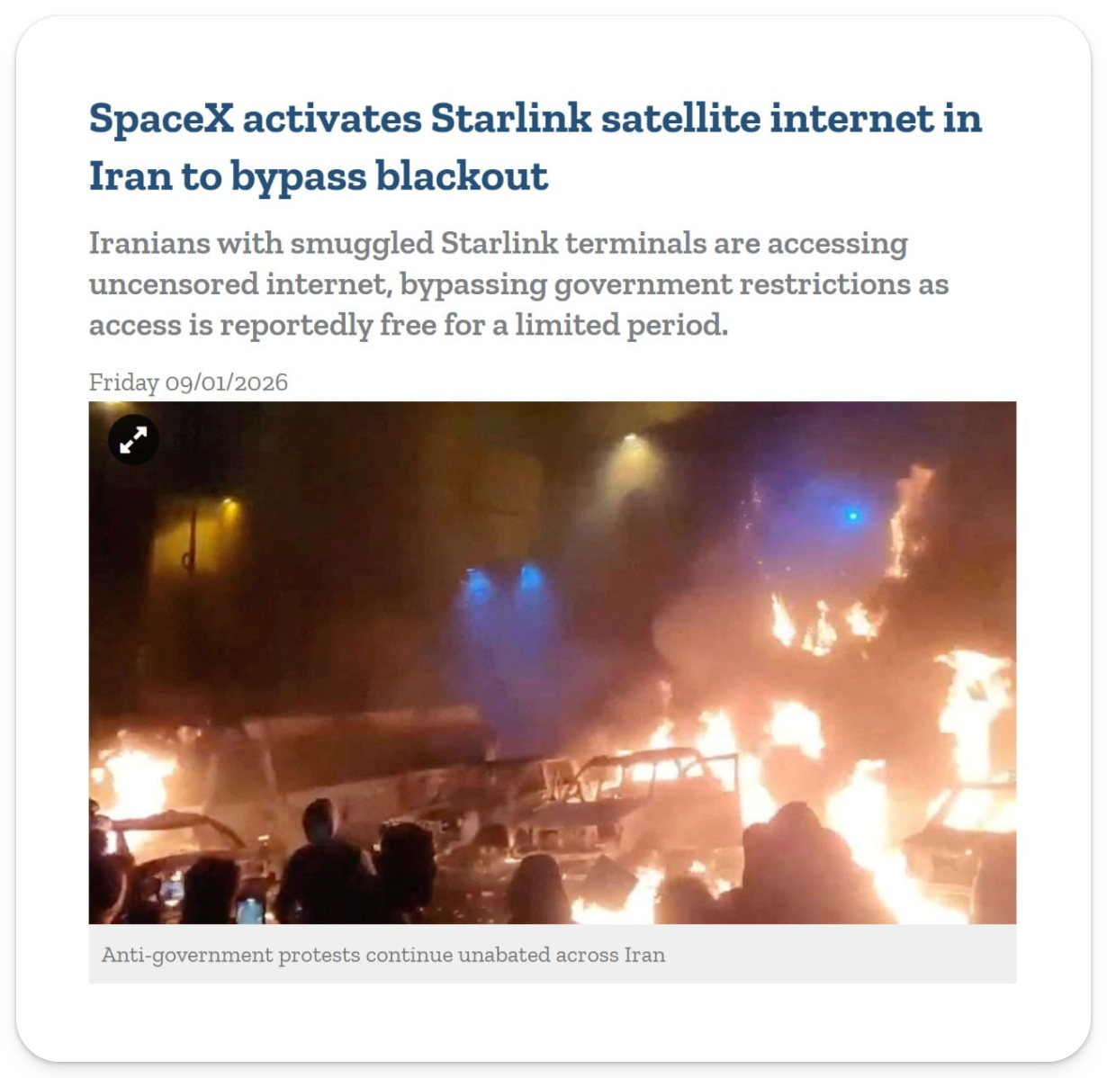 Generations of Iranians have seen all of these protests, and they say the current protests are the largest and most energetic they have ever seen. In 2026, the technology is already meaningfully different than the protests of years past. The pendulum of power has shifted towards the people. Prediction markets, Starlink, and Twitter are all helping spread the message of the Iranian people in ways they haven’t before. Prediction MarketsBack in October, I wrote about the ability of prediction markets to speak truth to power. The truth can often be inconvenient for those in power, and history has shown that regimes attempt to control truth and information in pursuit of maintaining their control over their people. In happy times, we will debate about whether prediction markets are just another form of gambling, but in the weeks in which decades happen, prediction markets are an incredible tool to speak truth to power. Starlink Satellite InternetThe Iranian government has had their internet shut down for 2 days now. They are preventing their people from coordinating together, and perhaps also blacking out the Western world's ability to see the crimes they are committing against their people. But in 2026, we have Starlink. It seems there are a sufficiently large number of Starlink devices that have been smuggled into Iran that are allowing videos and communication to surface to the outside world. Thanks to Starlink, the protesters have some ability to communicate. They can see and spread the message from opposition leader Reza Pahlavi. The world can see the rising death toll of protesters who have been shot by the Iranian Revolutionary Guard, who have also said that if they disobey orders, they too will be shot by their commanders. We know these things, thanks to Starlink. Twitter is where the story goes from local to global. Twitter is where Iranians are capable of communicating their efforts with each other – as well as with the outside world. Videos from Iran are spreading like wildfire around the world, leading to the global members of the Iranian diaspora doing their part – lighting cigarettes with burning pictures of the Ayatollah, and at the Iranian embassy in London, they are tearing down the Iranian regime flag, and replacing it with the pre-revolution Lion and Sun. Thanks to Twitter, the movement is being broadcast, and the Iranian diaspora is reverberating the energy back. Right now, Twitter is the front page of the Iranian revolution. The U.S. currently has plenty of drama going on, but nonetheless I have been disappointed about the lack of coverage of Iran’s largest protests in the entirety of its regime. In my opinion, the Islamic Republic of Iran represents a capstone of global evil and influence. If the Iranian regime falls, it sets off a series of dominoes that can finally allow modernity and civility to rise in the Middle East. It seems the people on Twitter think this story is the world's biggest story, even if Western media’s editorial decisions don’t seem to agree. Fingers CrossedMy heart goes out to the Iranian people. They are doing society's dirty work. In the West, we often talk about bravery, freedom, and standing up to authority in abstract terms. The people of Iran are living it. While the regime is calling for live fire against its own people, those people nonetheless have stood up and protested for over 10 days straight. They keep going back out and doing it all over again, at risk to their lives. In 2026, society has produced more freedom technology than ever. Hopefully that’s what the Iranian people need to finally be rid of their oppressive regime. Technology is making the world better, and the Iranian people are putting it into practice. . . . WHAT YOU MISSED Transactions Surging 📈 The Asset🏛️ The Protocol📱 The Apps🐸 The Culture💽 The Tech . . . WEEKLY ROLLUP Trilemma Solved? Prediction markets are turning into real-time intelligence, and policymakers are already reacting. In this week’s Weekly Rollup, Ryan and David unpack the Venezuela “Maduro trade," the debate over fairness vs. public signal, and Polymarket’s expansion into real estate markets. They also cover Bitcoin’s lowest-vol year ever, Solana’s DEX surge, Ethereum’s stablecoin settlement ATH, Morgan Stanley’s crypto ETF filings, Zcash’s governance blowup, Lighter’s massive $LIT airdrop, Vitalik’s “trilemma solved” claim, Wyoming’s state stablecoin, and Strategy’s path toward major indices. Tune into this week’s Rollup! 👇 |