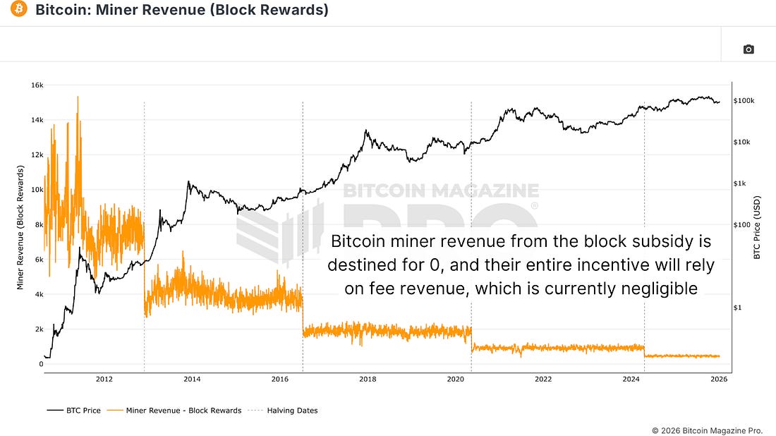 Bitcoin Mining’s Long-Term ThreatsBitcoin’s security depends on miners—but with subsidies heading to zero, fees and usage must rise or decentralization will erode.Bitcoin mining has undergone a dramatic transformation from a decentralized hobby pursued by believers to an industrial operation controlled by a handful of large pools and nation-states. This centralization creates an existential threat to Bitcoin’s independence and security. As mining becomes increasingly concentrated geographically and operationally, and as the block subsidy continues its programmed decline toward zero, Bitcoin faces a fundamental economic problem that could undermine the very mining incentives that secure the network. IndustrializationIn the early days, Bitcoin mining was decentralized by default. Everyone had a laptop or desktop computer, ran the Bitcoin software, and mined Bitcoin. As Bitcoin became more valuable, so did mining rewards, and, as a consequence, mining became more competitive. Those willing to pour resources into expanding their operations increased their computational output. The Bitcoin Miner Difficulty, the measurement that determines how many hashes must be generated to find a valid solution to the next Bitcoin block, increased, and suddenly, domestic computer hardware was no longer competitive. Figure 1: The high computational demands make Bitcoin mining almost impossible for individuals. The reality is that economics beats philosophy every time. Bitcoin security depends on miners. But these miners exist because mining is a profitable venture. When mining was unprofitable, people mined Bitcoin out of belief. But belief alone does not pay the electricity bills. Those believers were eventually priced out of doing so, and now a majority of the total network hashrate is in just a handful of pools. Figure 2: The growing centralization is evident. Political VulnerabilityThere is growing concern that electricity costs could be considerably cheaper in smaller and smaller regions around the world. We have already seen huge spikes in energy costs in many places due to demand for AI, for example, pushing miners to locations where electrical costs are considerably cheaper. Once again, this leads to geographical centralization within the mining network. If a majority of the mining equipment is situated within one jurisdiction, then potentially one political party in that region may have a significant influence and control over Bitcoin mining. Figure 3: The dangers of geographical centralization were evident when China imposed its ban on Bitcoin mining. The Subsidy Death SpiralBitcoin’s block subsidy, the amount of Bitcoin paid to miners for securing the network, was designed to decrease over time. In 2009, miners got 50 bitcoin per block. Every 210,000 blocks, or approximately every 4 years, that subsidy is halved. We went from 50 to 25, 12.5, halving to the 3.125 bitcoin per block we are currently at. In around 2028, it will drop by 50% again, following this pattern until 2140 when it reaches zero. Figure 4: Bitcoin’s block reward halving means this form of miner revenue will be exhausted by approximately 2140. The problem is that around 99% of the revenue for miners comes in the form of block subsidies. If miners want to retain the same revenue they currently earn, then in six or seven halving times, the Bitcoin market capitalization, the total value of all coins in circulation, is going to have to be hundreds of trillions of dollars just to maintain where we are today, unless transaction fees or volume massively increase. By 2140, when the block subsidy is zero, miners must be paid entirely by transaction fees. ConclusionThe network relies on miners. Miners rely on profitability. And the longer Bitcoin exists, the more that profitability becomes dubious. If nobody is using Bitcoin on-chain, the fees are not sustainable, and the security and decentralization of the network are both at risk. This is either a fundamental flaw that needs to be addressed or something that will inevitably resolve itself. For a more in-depth look into this topic, watch our most recent YouTube video here: Ticking Time Bomb | The 131 Year Bitcoin #3 Matt Crosby Director of Research & Analytics Bitcoin Magazine ProFor more detailed Bitcoin analysis and to access advanced features like live charts, personalized indicator alerts, and in-depth industry reports, check out Bitcoin Magazine Pro. Make Smarter Decisions About Bitcoin. Join millions of investors who get clarity about Bitcoin using data analytics you can’t get anywhere else. We don’t just provide data for data’s sake, we provide the metrics and tools that really matter. So you get to supercharge your insights, not your workload. Take the next step in your Bitcoin investing journey: