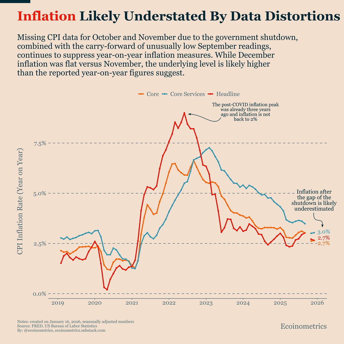 Taken together, these three charts tell a simple story: Bitcoin is no longer short of interest, but it is short of durable support. Short-term demand shows up in bursts, but long-term buyers are increasingly concentrated, and the macro backdrop may be less benign than headline data suggests. In this environment, what matters most is not momentum, but the quality and persistence of demand. In case you missed it, here are the other topics we covered this week: Get these professional-grade insights delivered to your inbox: Bitcoin Needs A Few Good Weeks, Not A Few Good DaysBitcoin and Ethereum prices have bounced again this week. By now, this pattern should feel familiar. We get a few good days of inflows into crypto ETFs, and prices pop. That’s a healthy sign in one sense: it tells us demand is still there when flows turn positive. But it’s also telling that these rallies keep stalling around the same area. For Bitcoin, that’s been a bit above $95K, roughly the upper end of what our ETF-flows model implies as a fair-value range under current demand conditions. The reason is scale. As the chart below shows, cumulative net flows into Bitcoin and Ethereum ETFs are still in a deep drawdown. The recent bursts of inflows barely register against the size of that pullback. In other words, a handful of strong days won’t change the trend. To make a real difference in price action, we don’t need crypto to string together a few green prints. We need a few good weeks of sustained inflows to rebuild a healthy demand trend. The current setup isn’t bad. But it still looks more like stabilization than a clean restart of an uptrend. Strategy Has Become A Key Source Of Bitcoin Price SupportBased on our ETF flows–to–returns model, every net 10K BTC absorbed by ETFs in a given month has historically been associated with roughly a 3.6% increase in Bitcoin’s monthly returns. That’s a substantial effect. But ETFs are not the only buyers operating at that scale. Public companies with Bitcoin treasuries can also accumulate large amounts on a consistent basis. When they do, those purchases act as another source of steady demand and can help limit downside pressure on price. The problem is that this buyer base has narrowed significantly. As we discussed in more detail in Wednesday’s report, only a handful of public companies still buy Bitcoin regularly and at this point, Strategy stands alone as the only buyer operating at real scale. Even Strategy has slowed at times. After an exceptionally strong accumulation phase in 2025, their purchases decelerated in the second half of the year before picking up again more recently. That concentration matters. Strategy now controls about 3.3% of Bitcoin’s total supply and are the only one buying in 10K BTC, a level where changes in their buying behaviour can materially affect market dynamics. If their purchases were to slow again, Bitcoin would lose one of its few remaining sources of consistent demand support. This doesn’t mean price would immediately break down. But it does mean resilience would increasingly depend on ETF flows or a broader return of corporate buyers, neither of which is guaranteed in the short term. Inflation Is Likely Understated By Data DistortionsIf you take the December CPI numbers at face value, inflation is close to its lowest point since 2022. It has stabilized and come down meaningfully since last year’s highs. On the surface, that suggests progress. The problem is that the data itself is distorted. Missing CPI data in October and incomplete data in November created a clear gap. Year-on-year inflation calculations now roll forward unusually low base effects from earlier readings in key categories in September, which mechanically suppress reported inflation. In that environment, pressure on the Federal Reserve is likely to increase. We have seen how the U.S. government is pushing hard the story that there is no inflation problem and that the Fed has to easer faster. We have also seen the struggle between Jerome Powell and the U.S. administration on policy decisions. The argument will be that data supports that inflation is under control and that rate cuts should come sooner rather than later. That tension, between imperfect data and policy decisions, is where fiscal dominance risk starts to matter for investors. If that risk becomes a bigger part of the macro discussion, it could revive the narrative of monetary debasement. And that is one of the few macro narratives that has historically supported sustained Bitcoin growth. It’s too early to say whether this shift is taking hold. But it would offer a cleaner path out of the current environment, where investors still struggle to find a compelling macro reason to re-engage with Bitcoin. Tactical TakeawayThe setup still favours patience. Bitcoin has avoided downside despite weak cumulative ETF flows and increasingly concentrated corporate demand, which speaks to resilience, but not to a renewed uptrend. Without sustained inflows or broader participation, rallies are more likely to stall than compound. At the same time, macro risk is becoming asymmetric. Inflation data distortions and rising political pressure on monetary policy could reintroduce debasement narratives later this year, but that remains a conditional catalyst rather than an active one. For now, policy uncertainty supports optionality, not aggressive positioning. In practical terms, this is still a market to observe demand quality, not chase price strength. Sustained ETF inflows, a broadening of corporate buyers, or a clear shift in inflation discourse would change the calculus. Until then, strength should be treated as stabilization within a range, not confirmation of a new trend. That’s it for today. Thanks for reading. Cheers, Nick P.S. Every week, our team conducts extensive research analyzing market data, tracking emerging trends, and creating professional-grade charts and analysis. Our mission: Deliver a