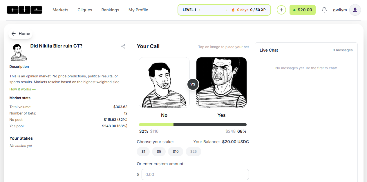 Voila, that's all it takes to start aiming for wins and XP on the platform. Notably, if you're more interested in creating markets, just click on the "Create a Market" button on the homepage. This will bring up a simple UI where you'd input your desired details, in this order: Market Question, Description, Market Type (Text or Pic vs. Pic), Market Duration, and Cover Image. The more activity you field to your market the better, as creators earn 3% on any bets made on their markets. While this clearly sits on the experimental side of things, there are some risks to be aware of. As a small and experimental platform, Cue has non-trivial risks, like volatility, illiquidity, and no guaranteed refunds. Also, Cue is just for opinion markets. The platform explicitly says it's not for "price predictions, political results, or sports results," so you won't find these types of markets here. In my opinion, Cue is interesting precisely because of its narrow focus on opinions. While traditional prediction markets can feel like casino gambling, opinion markets feel more like a social media mini game with micro stakes. That lighter experience could find an audience as the platform seeks to make a case for a future where opinions with liquid stakes are the norm onchain. |
