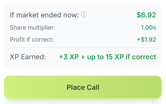 - Now to make your call, click on the "No" or "Yes" picture to pick a side, and then choose your stake – you can use preset sums like $1, $5, etc. or enter a custom amount. Then scroll down to review the details. You'll see how much profit you'll make if your call pans out and how much Cue XP you'll earn. Then press "Place Call" to finalize the trade by signing a transaction.